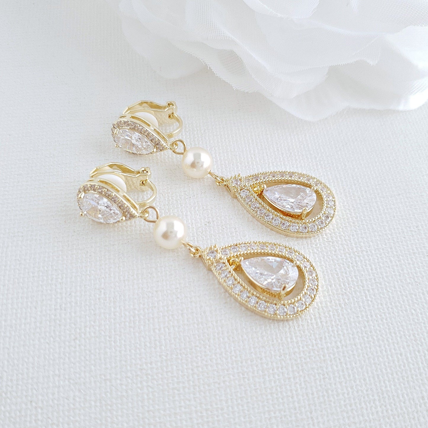 Are you a bride or a woman without pierced ears? Then this beautiful unpierced clip on wedding earrings is your answer for your bridal and wedding earring. The clip earrings for weddings are beautiful, comfortable, and elegant. The earrings are sparkly and made with cubic zirconia if you need a pearl you can add one with the color choice of white or cream.