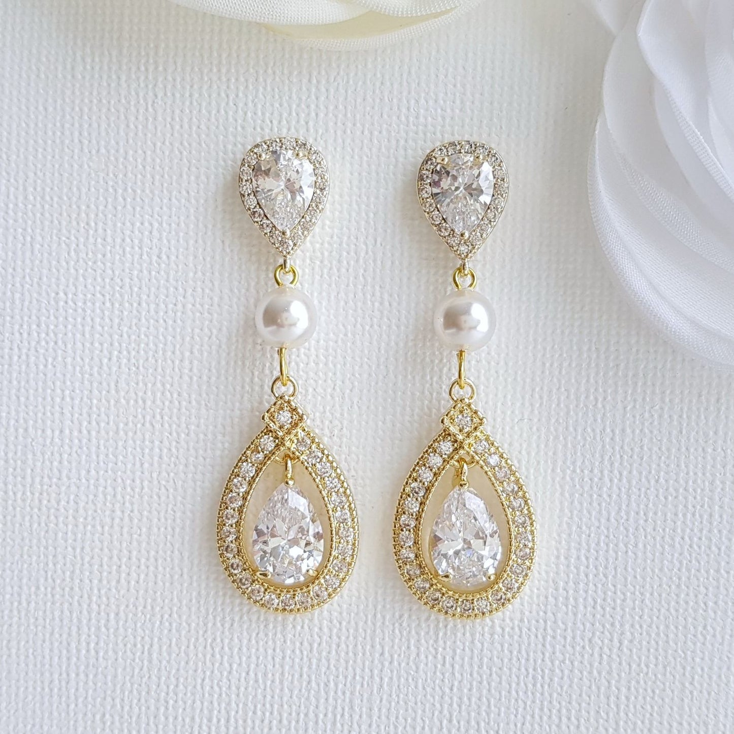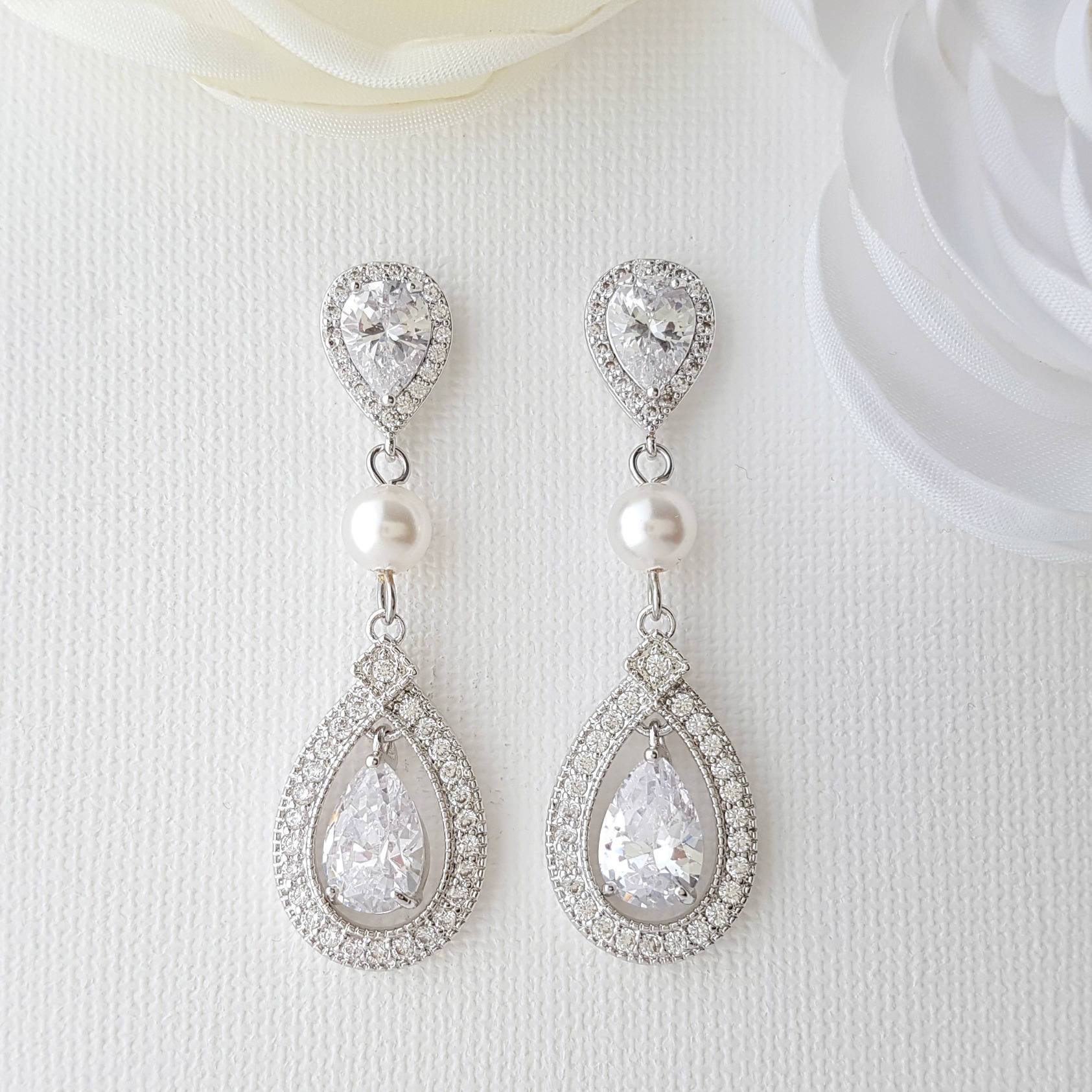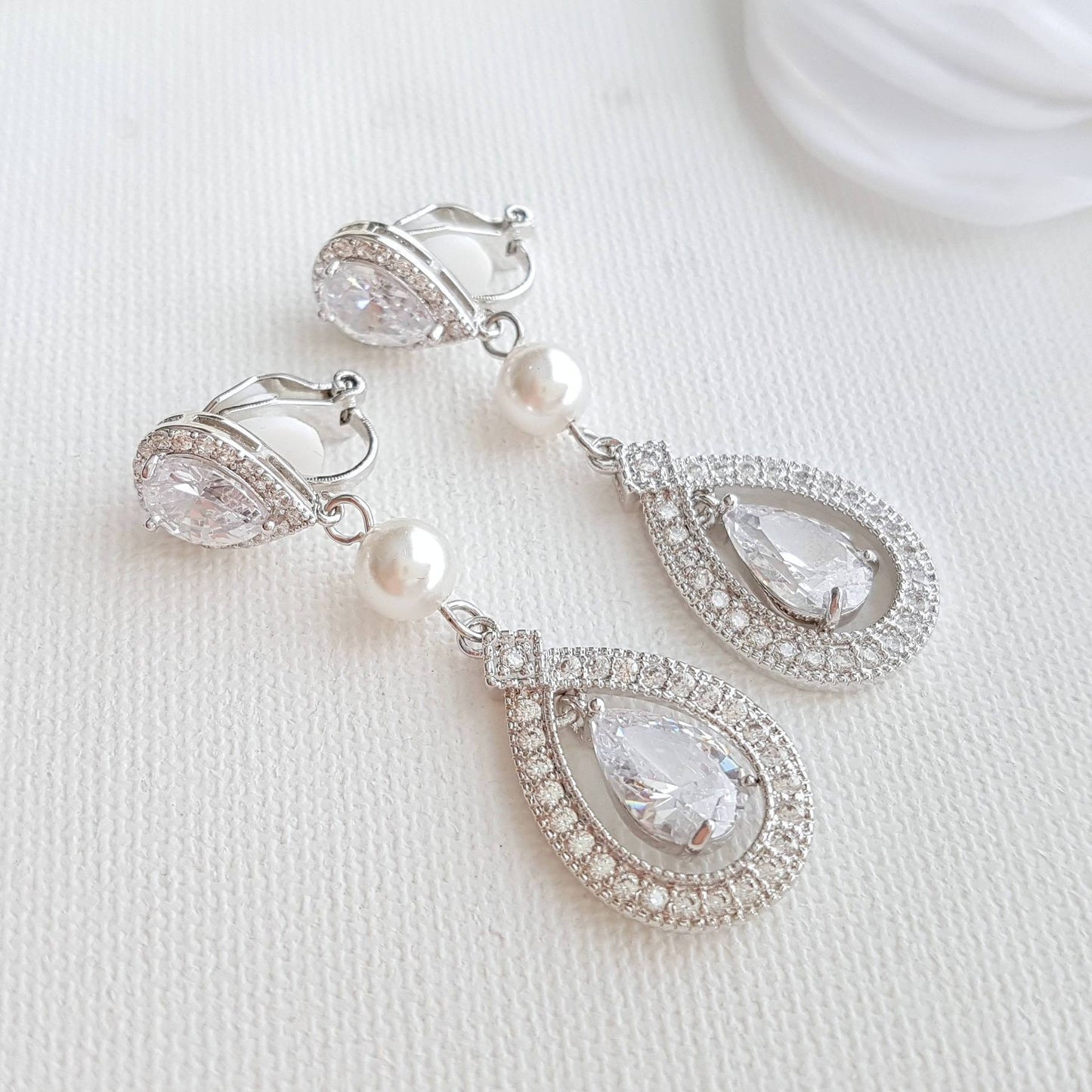 These clip-on wedding earrings are quite an elegance and add a perfect touch with your bridal, wedding, formal, and prom dresses. These elegant earrings with clip on's are made with sparkling cubic zirconia and pearls in silver finish. The base metal is brass and rhodium plating. The clip-on earrings can also be purchased in gold and rose gold finish with pearl color options of cream or white too. The earrings are lightweight and our brides have loved the quality of the clip-on for its comfort, yet firm fitting, and finally found clip-on earrings that they wanted without a compromise to their dream wedding day look
