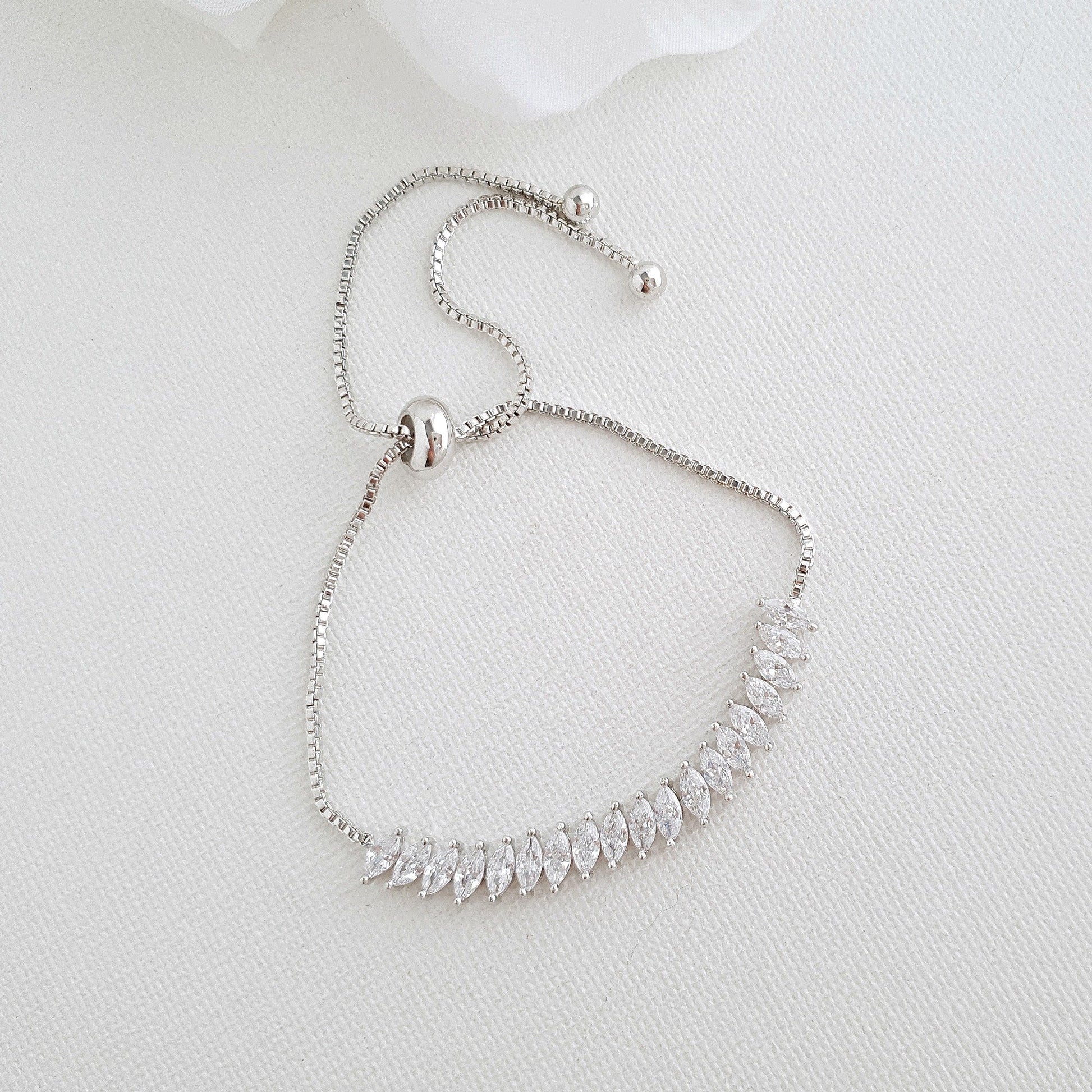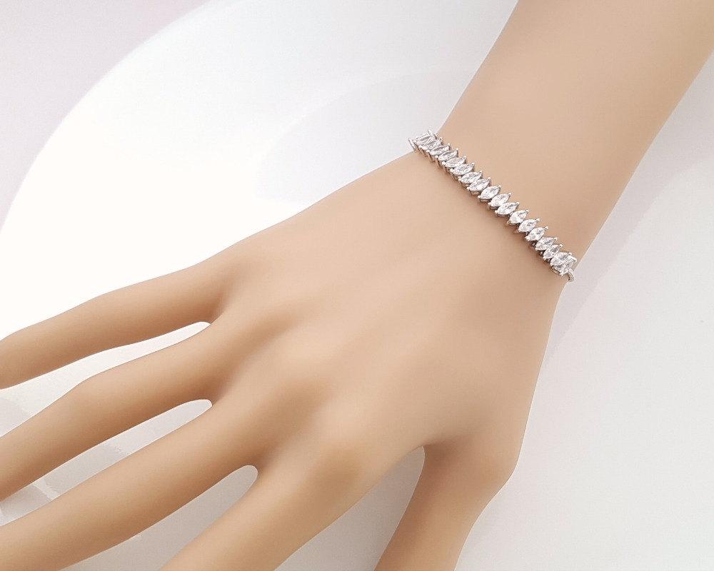 A lovely simple row of marquis clear cubic zirconia makes up this bracelet. The bracelet is adjustable to fit any size with the slider. Material used is platinum, rose gold plated or 14k yellow gold brass.