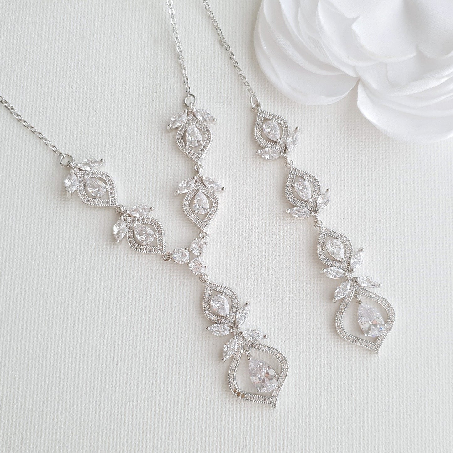 The drop features a teardrop shape with marquise crystals around it. The necklace in front is available in three different lengths end to end of 16", 18" and 20".