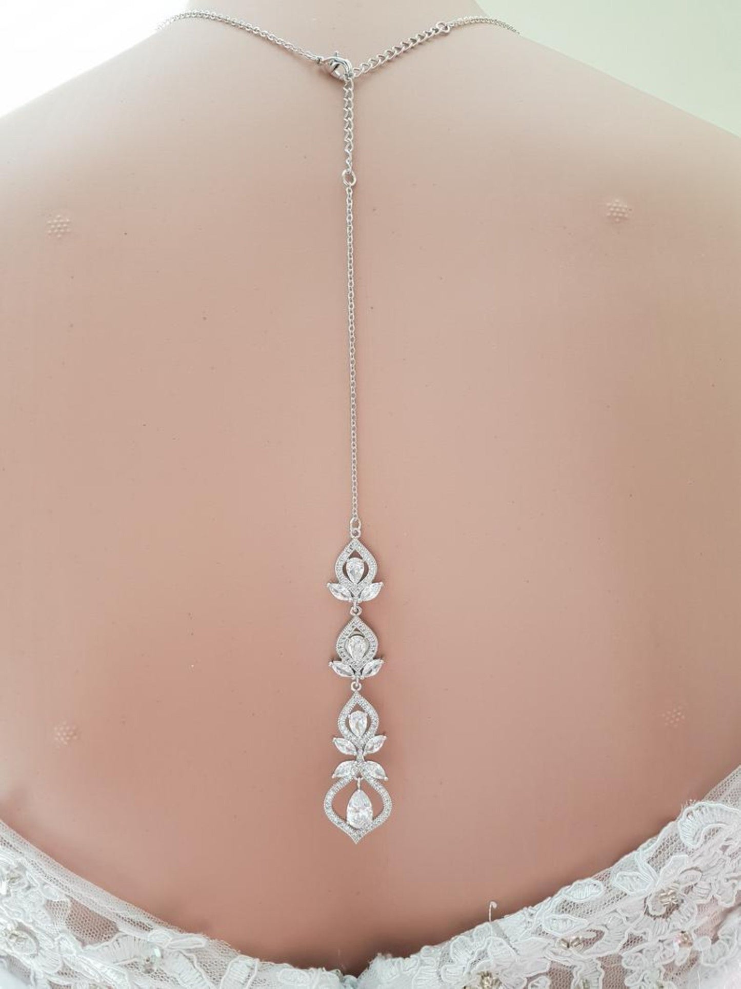 This crystal gold wedding necklace with backdrop will add to your glamourous wedding day look. The crystal backdrop of the necklace is a great addition to your back jewelry bling on a low cut back wedding dress!