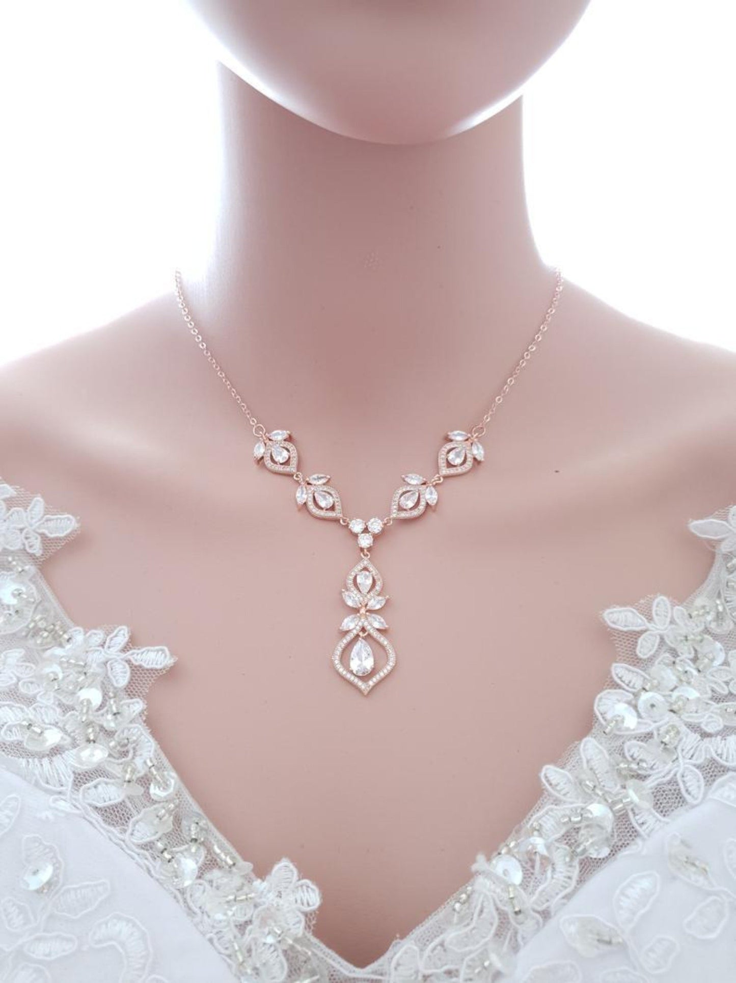The gold crystal wedding backdrop of the necklace is also matching with 8 inches backdrop length. This crystal wedding necklace can also be purchased in 3 tones of silver/rhodium finish, rose gold finish, and 14k gold finish.