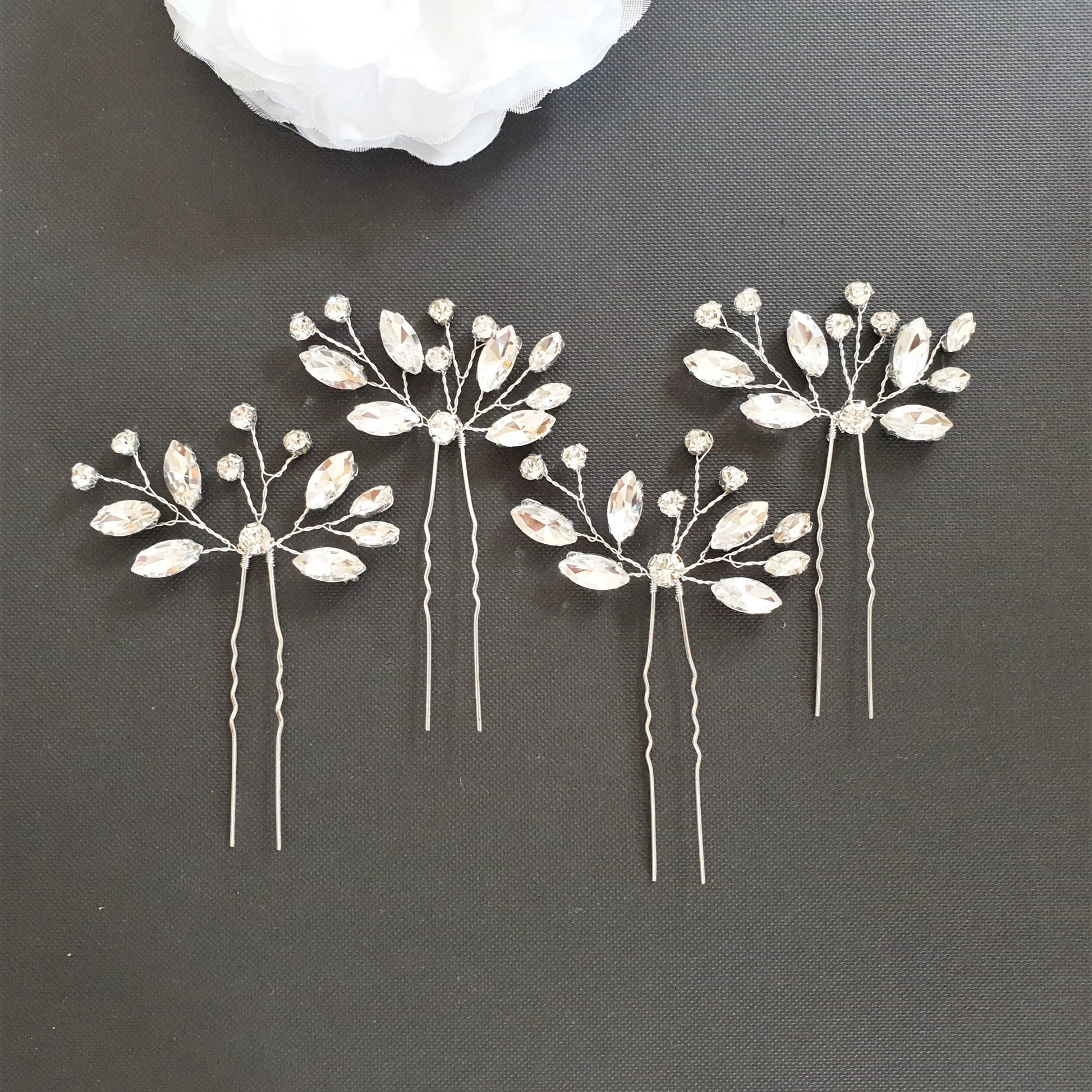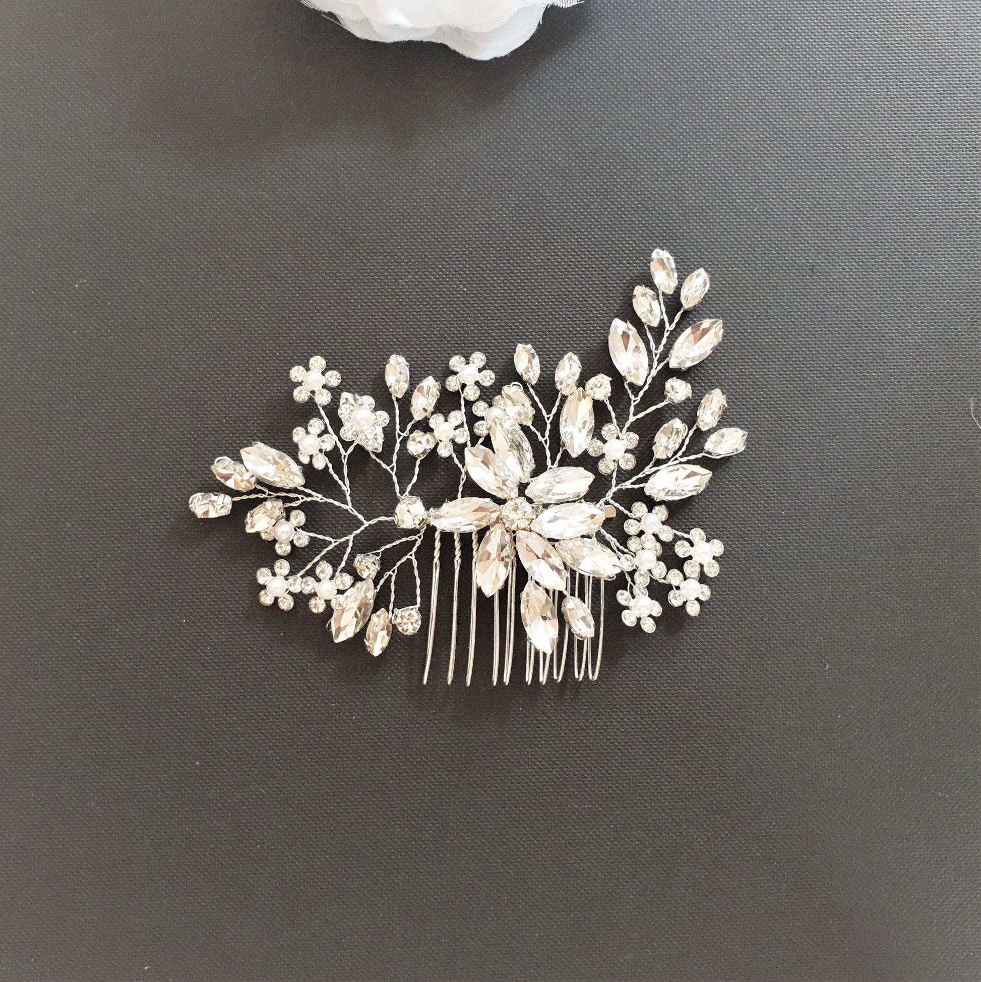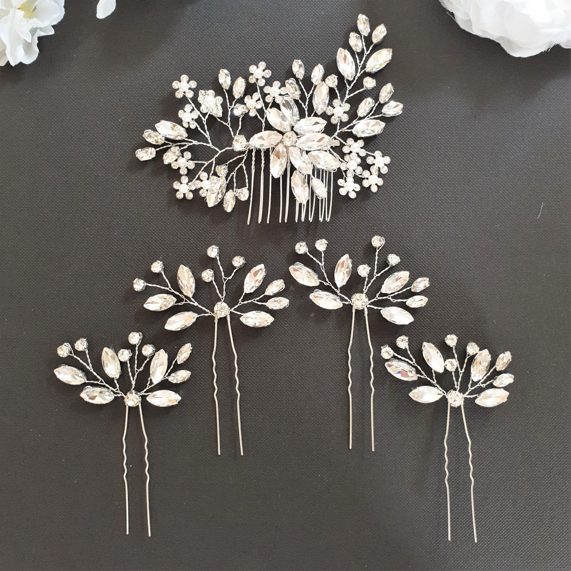 This 5-piece crystal hair accessories set comes with a beautiful hair comb and 4 pretty hair pins. The hair accessories set is made of rhinestones and is wire wrapped. This hair accessory set is designed perfectly, combining leaves and flowers; it is flexible and easy to style and is available in silver tones.