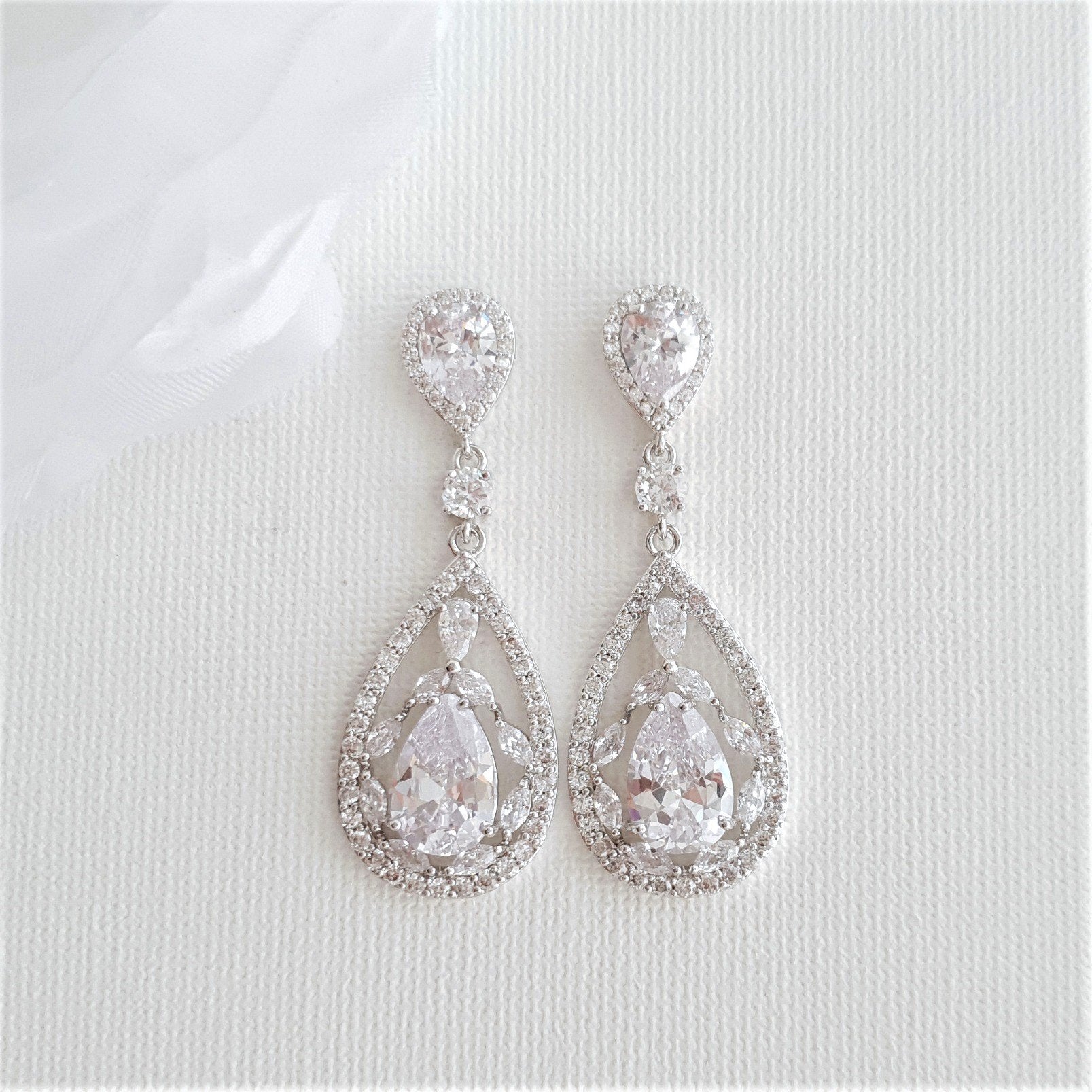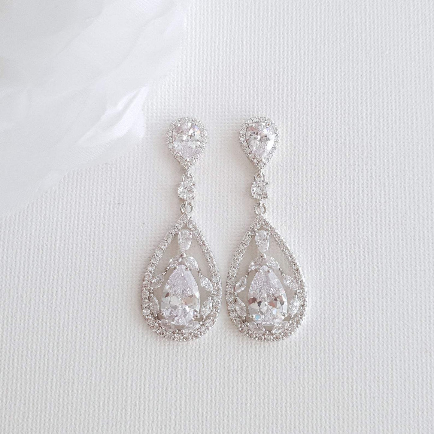 Esther crystal wedding earrings drop is sparkly and perfect for your wedding day. These wedding drop earrings designed with cubic zirconia bring out the sparkle and shine crystal. The wedding earrings are in silver-tone and is rhodium plated. The drop earrings for weddings feature a very feminine look with a teardrop shape ear posts and magnificent drop that dangles.