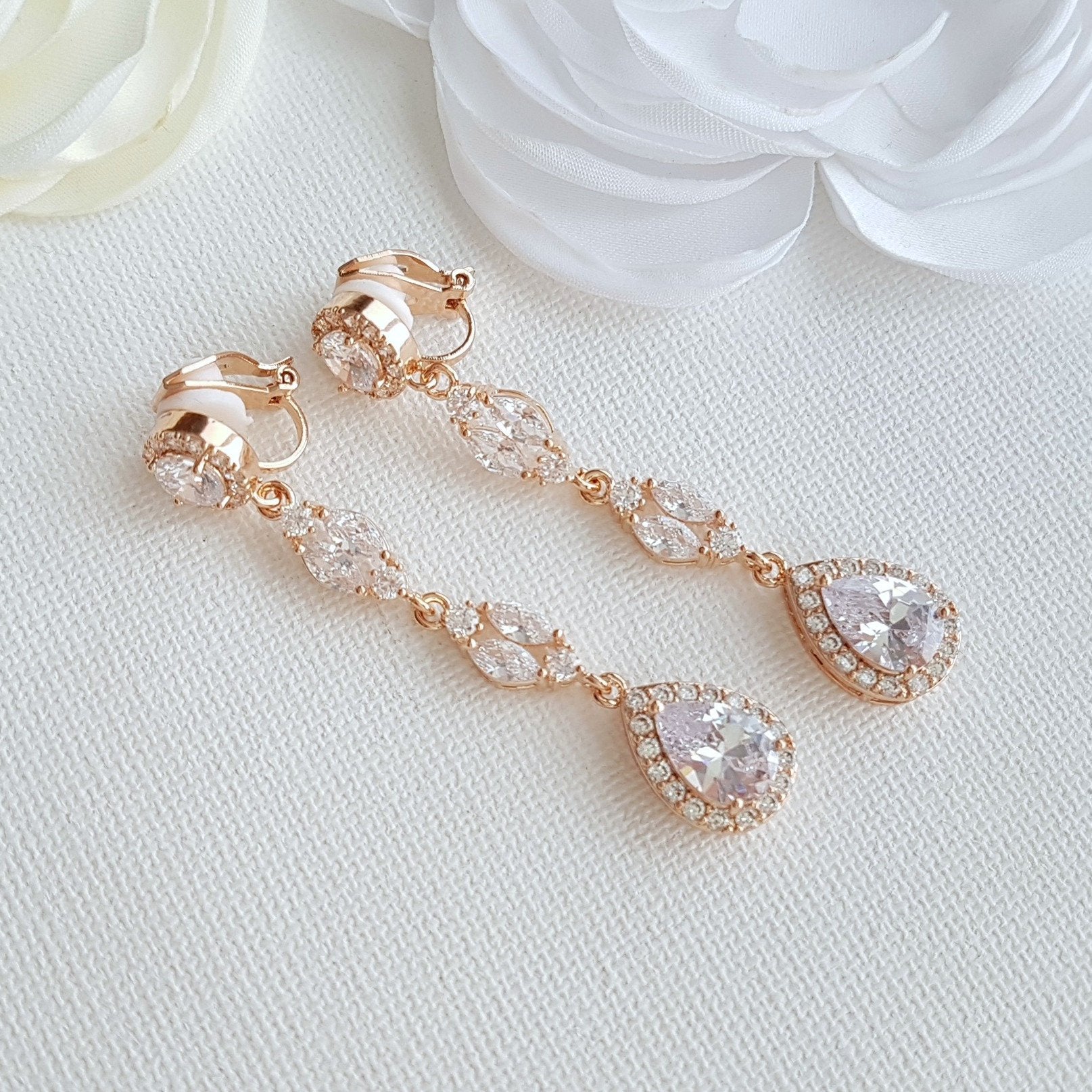 A long and slender dangle drop earrings are sparkly pair of earrings that can be worn with any bridal gown design for a sparkly look all day long. The clip-on earrings measure approx.