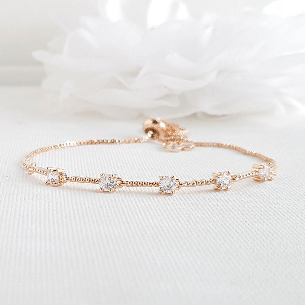 This delicate wedding bracelet is rhodium plated for a silver finish and is made of sparkly small cubic zirconia crystals with adjustable slider clasps. The adjustable slider clasp fits most of the wrist sizes, if you are buying a bridesmaids gift, shop with confidence, as it will work with every women's wrist size, by taking out the stress of individual wrist sizes.