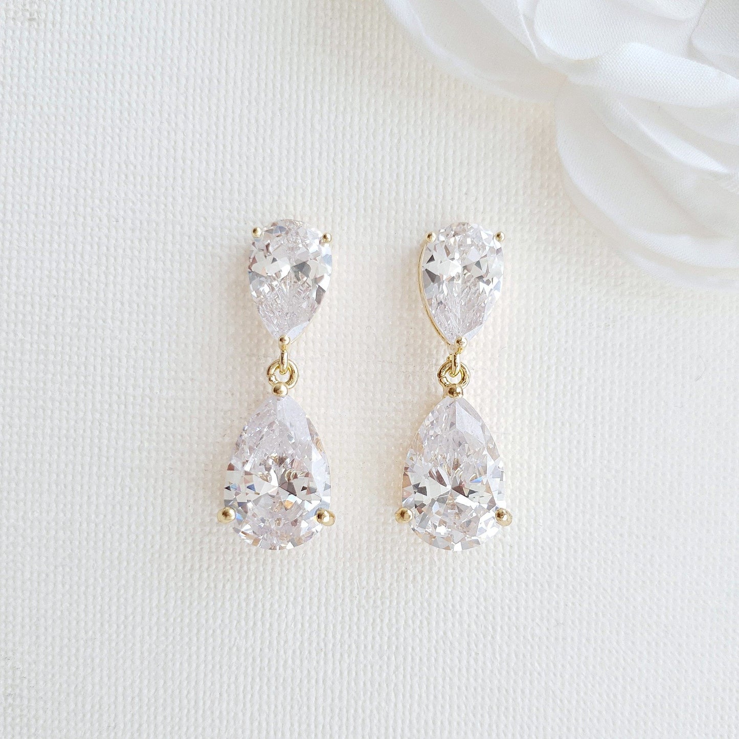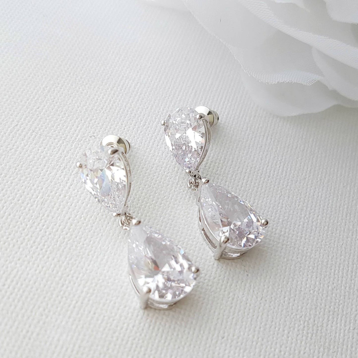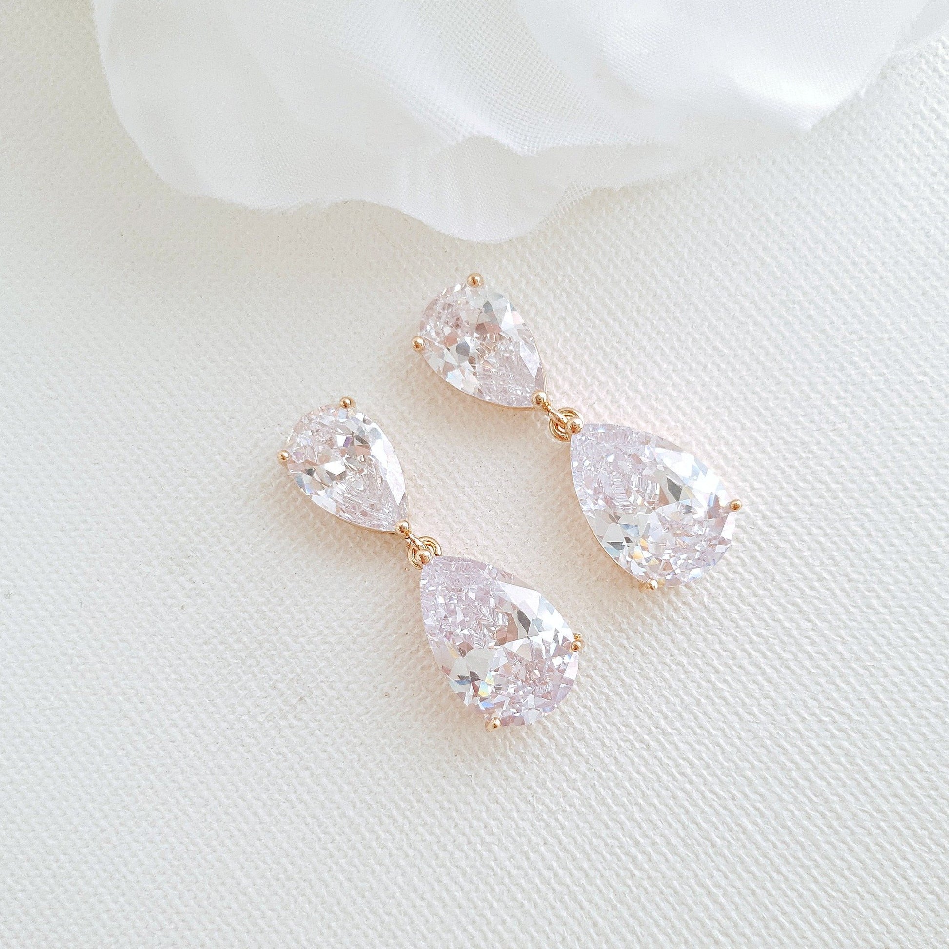 These diamante earrings are multifaceted and are made with multi-faceted, clear cubic zirconia. The ear tops and drops are prong-set which showcases the brilliance and shine of the crystals, making it the perfect small diamante earrings for brides.