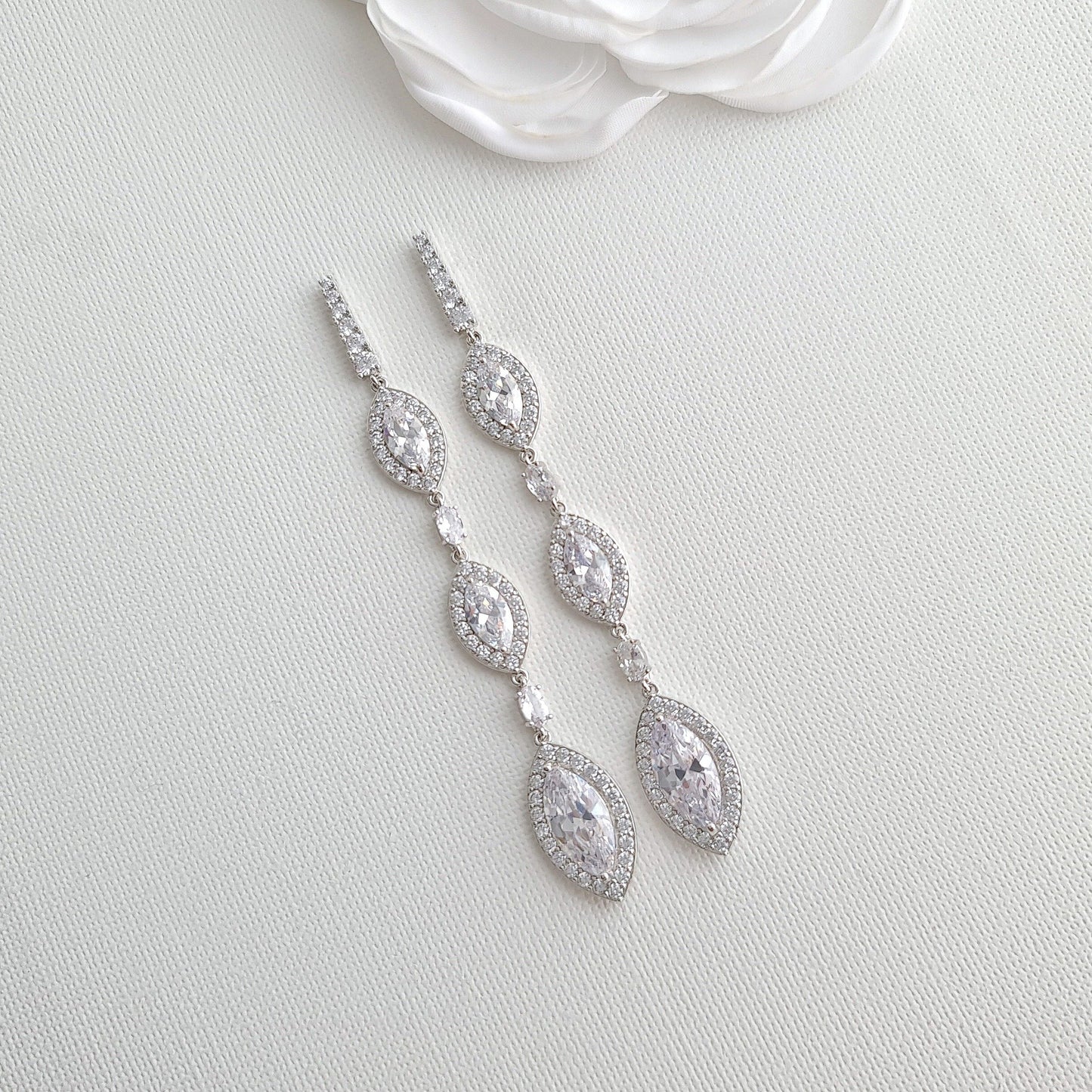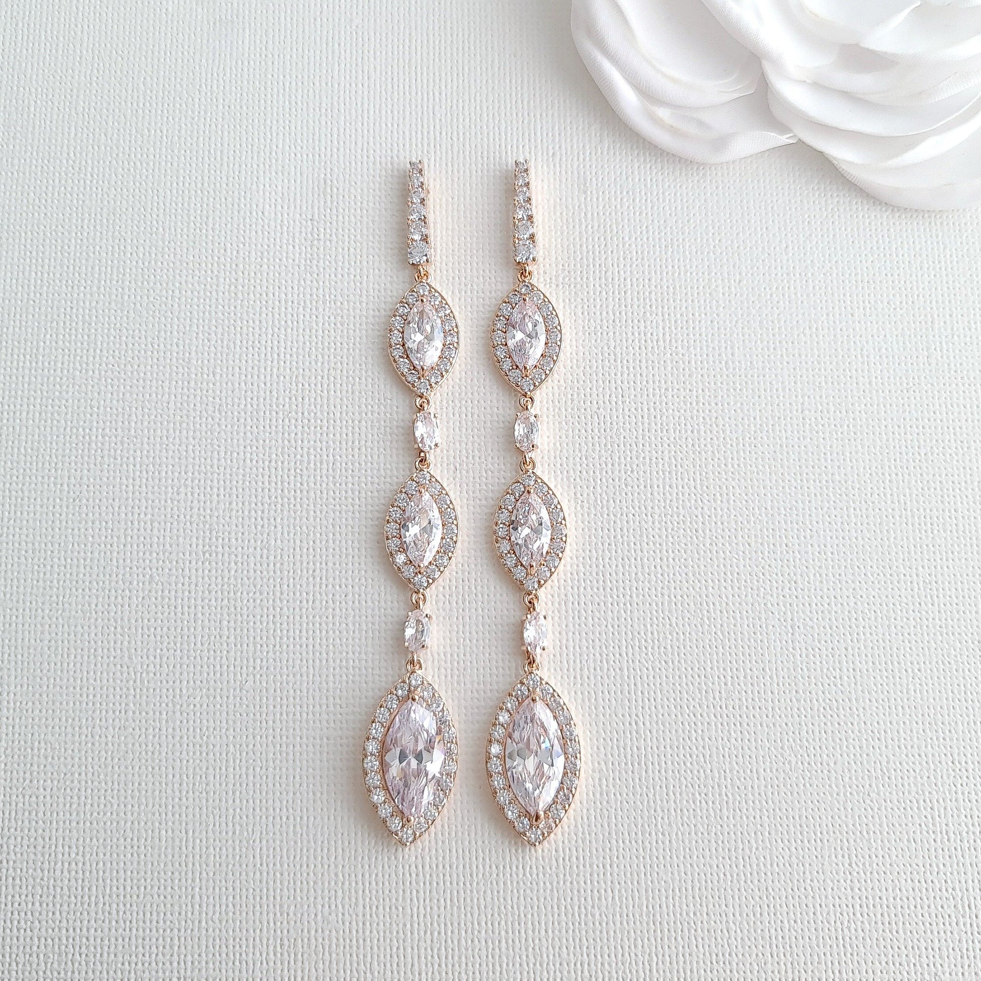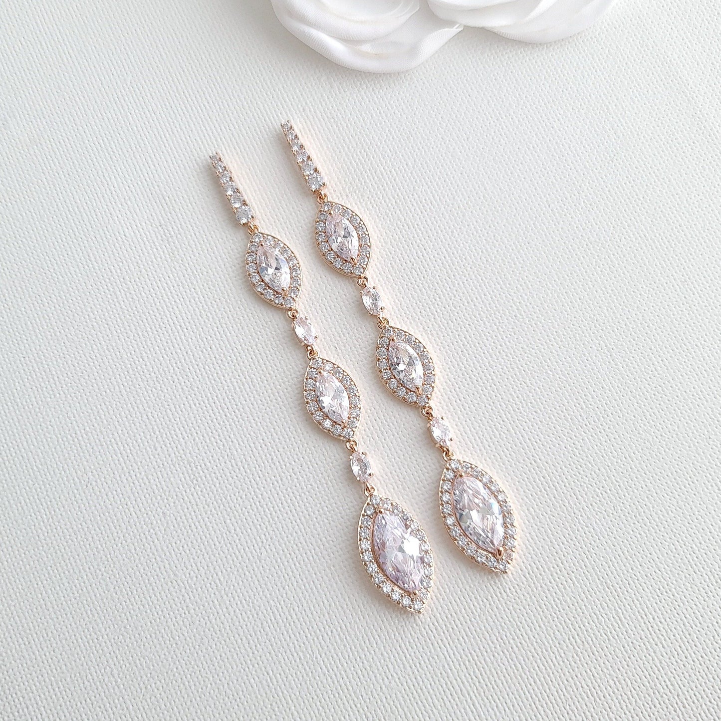 These extra-long rose gold earrings are made of cubic zirconia, the earrings measure 3.25" inches or 8.25 cms. The long bridal earrings have the perfect sway, sparkle, and elegance that you like to add to your perfect wedding day look.