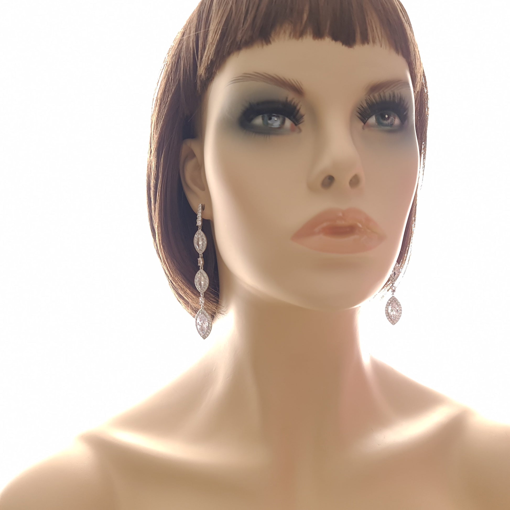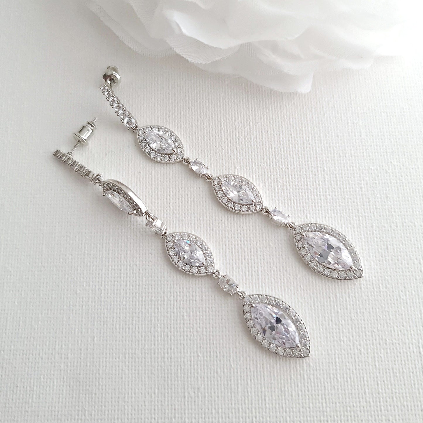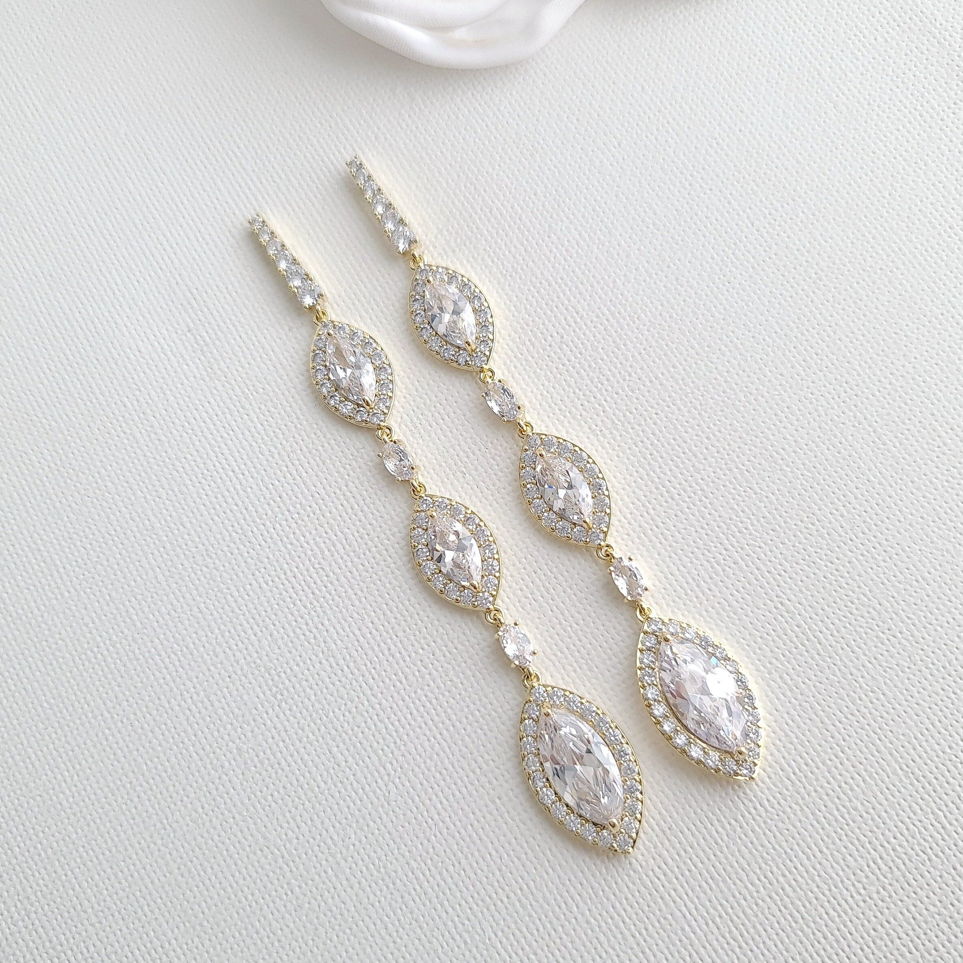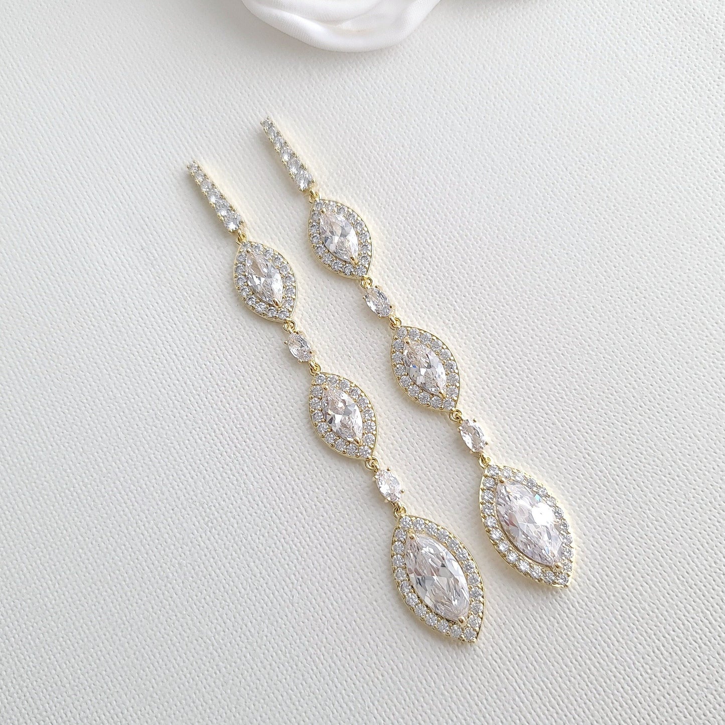 These extra-long rose gold earrings are made of cubic zirconia, the earrings measure 3.25" inches or 8.25 cms. The long bridal earrings have the perfect sway, sparkle, and elegance that you like to add to your perfect wedding day look.