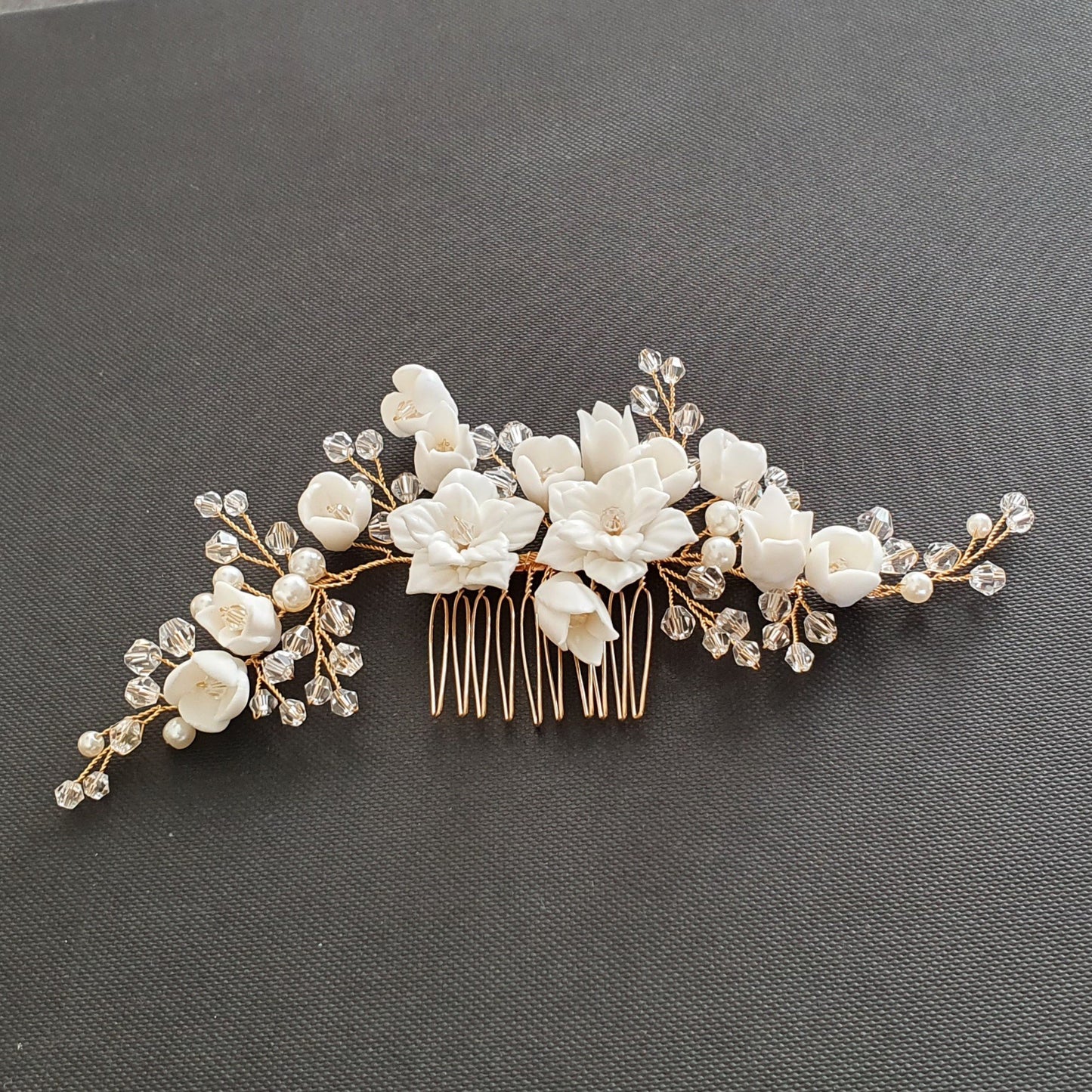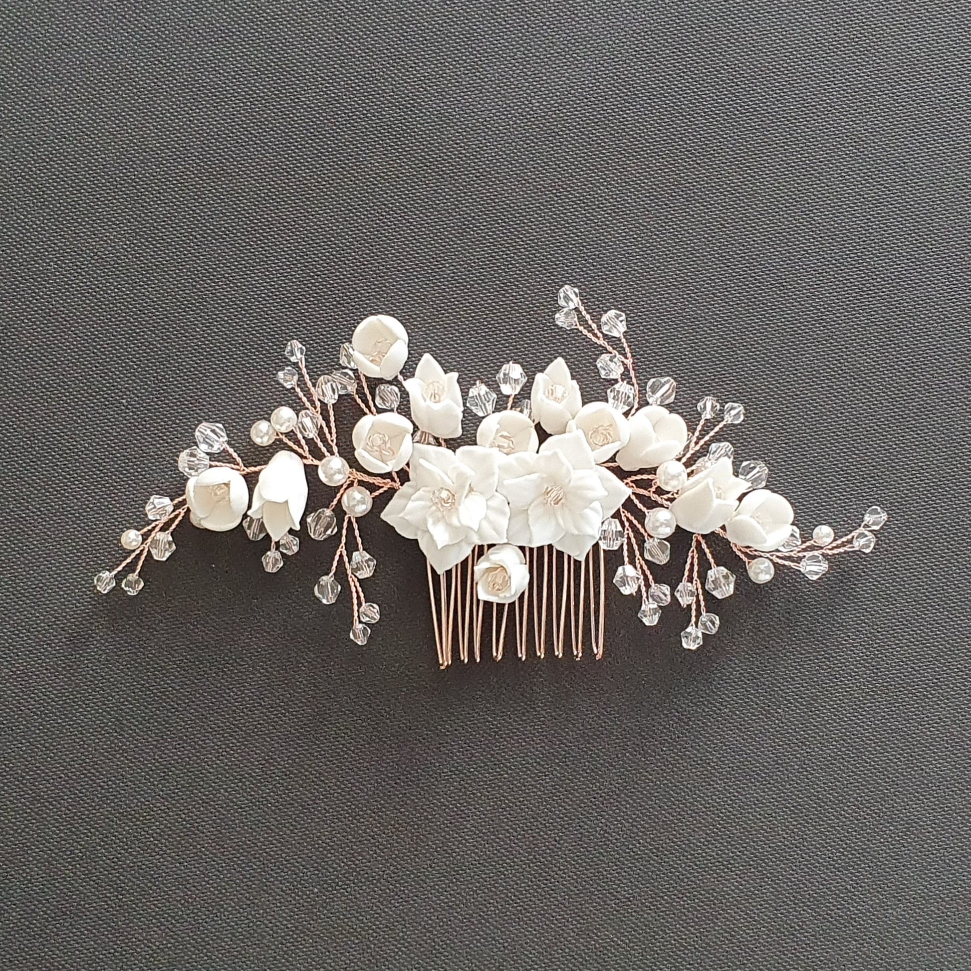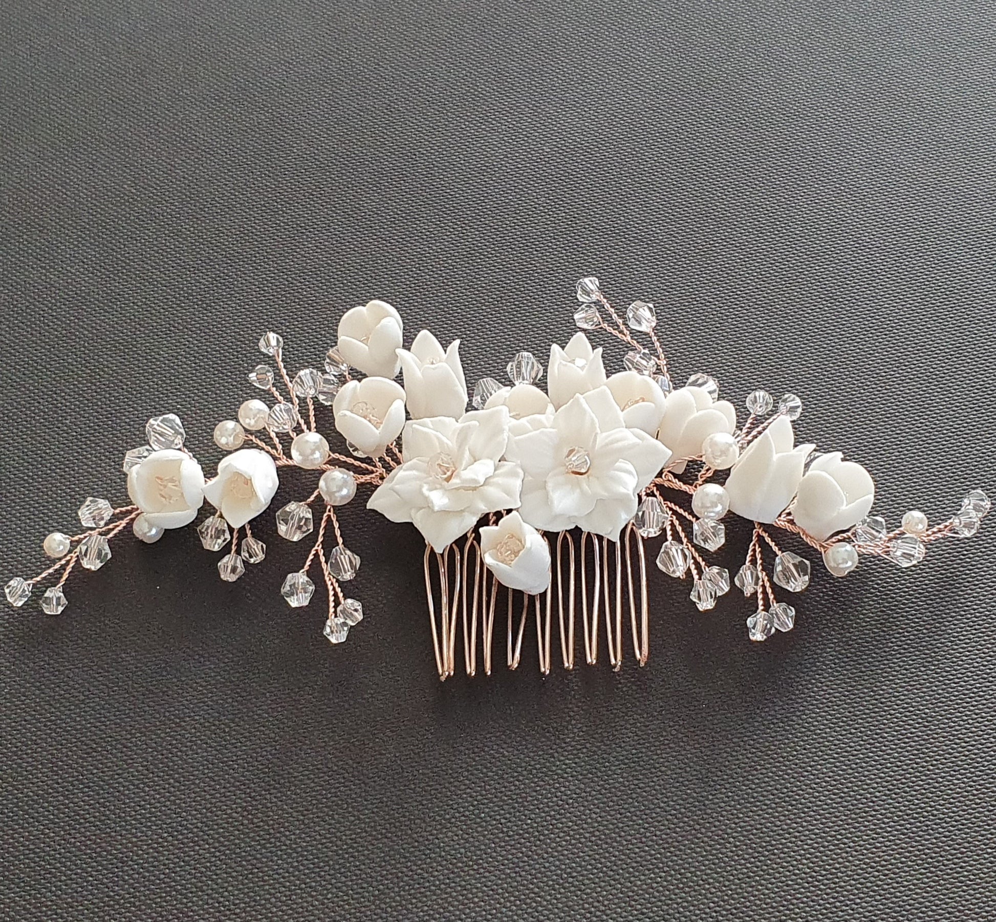 This vine hair comb in silver is delicate and elegant. The hair comb is made with porcelain white flowers and crystal beads. The combination of small and big flowers white porcelain flowers are wire wrapped on a silver comb with silver wire sparsely dotted with few pearls.