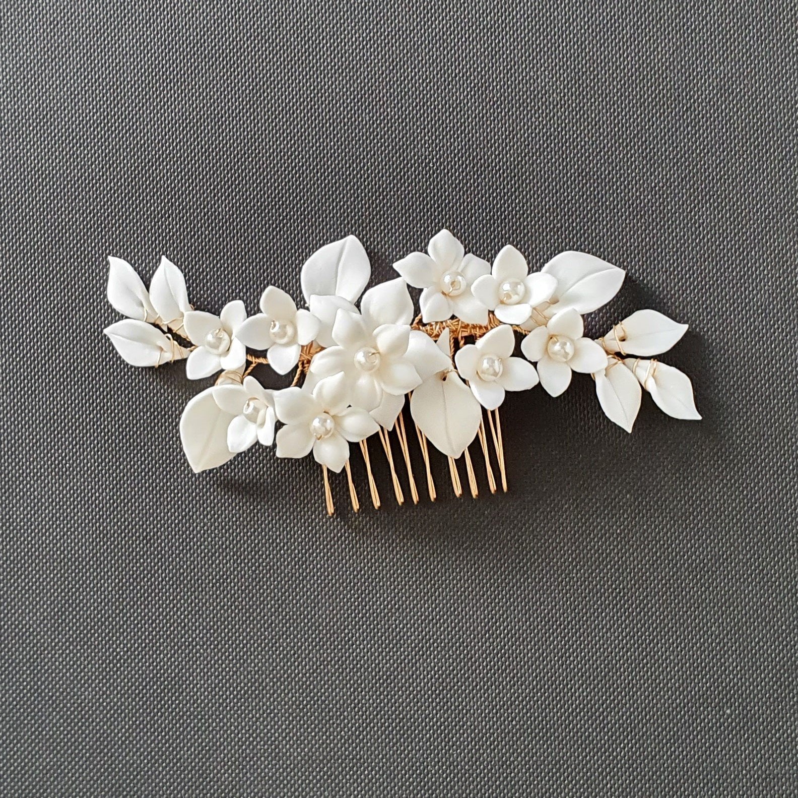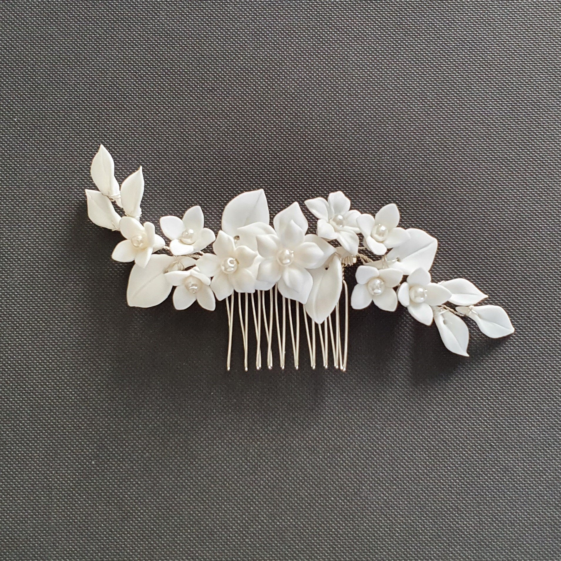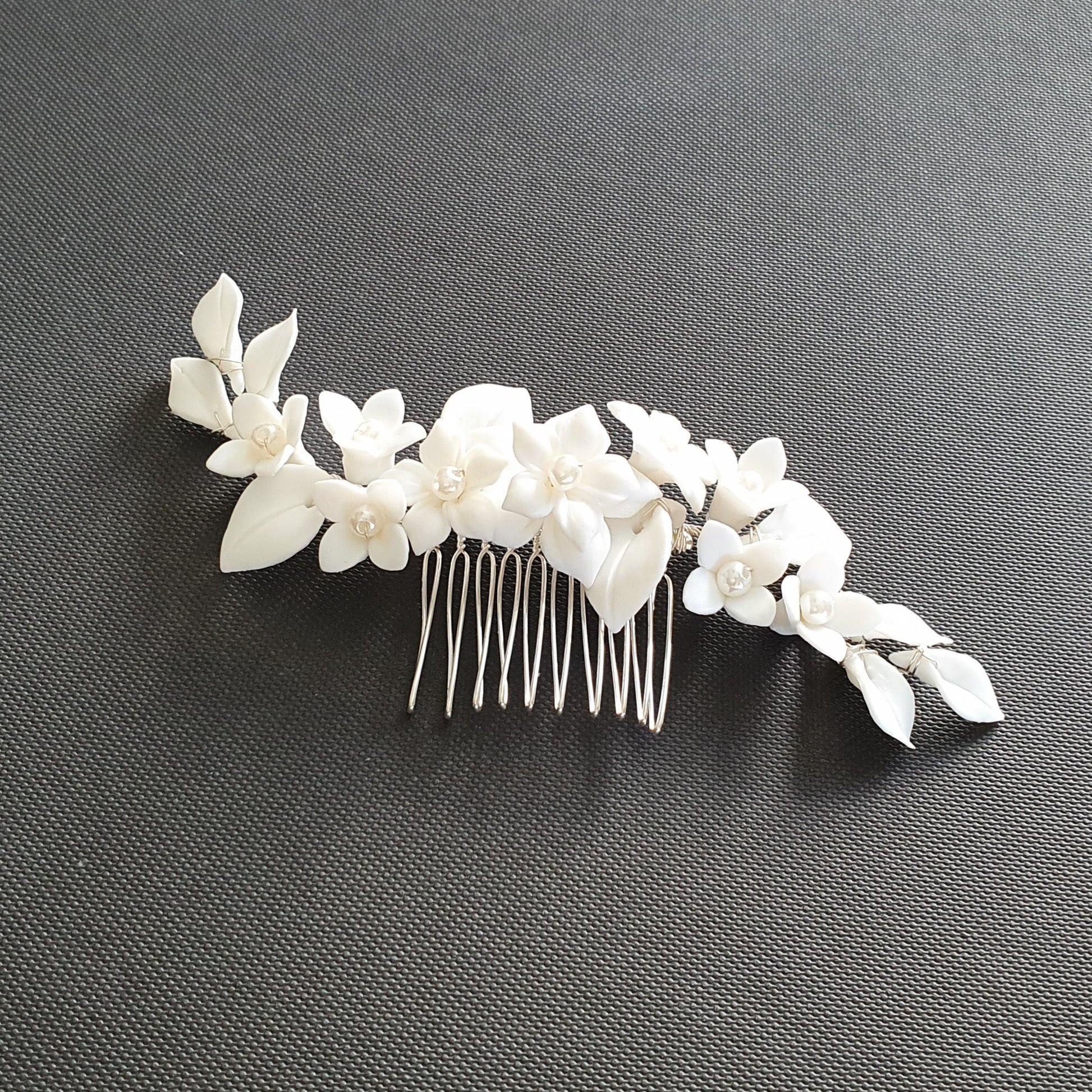 This bridal hair comb with white flowers and white leaves is made of porcelain. Each flower is carefully studded with a white pearl to give each flower some extra depth and dimension.