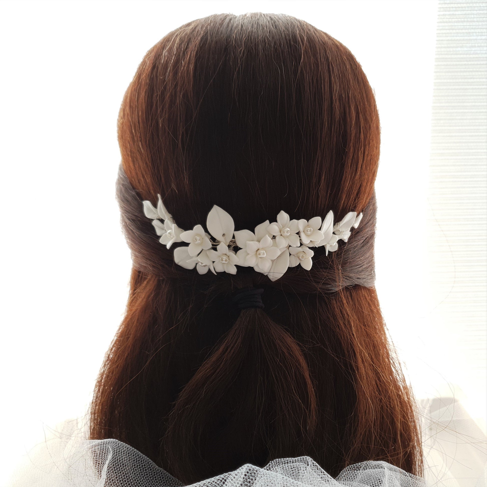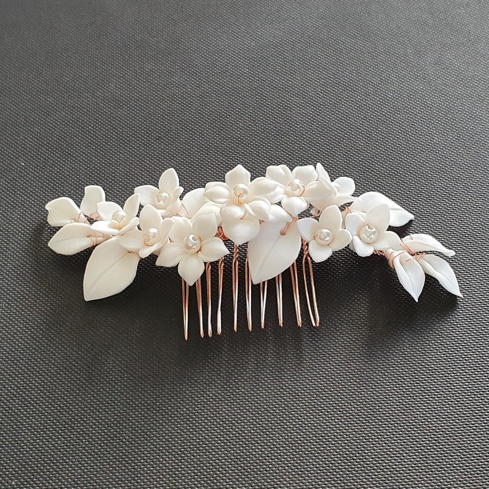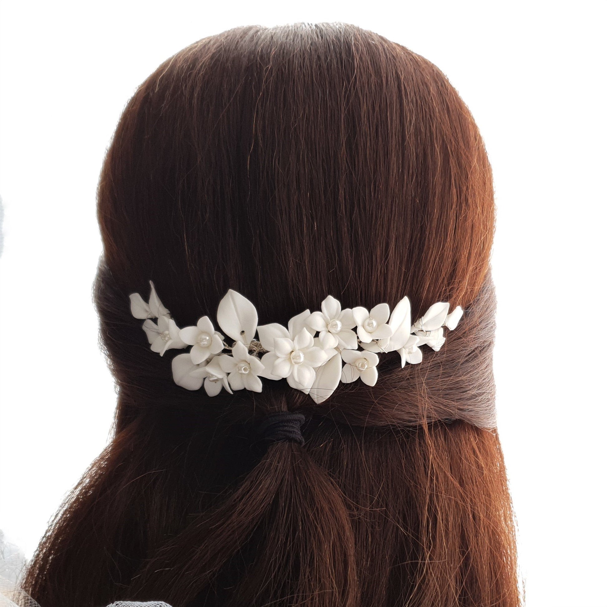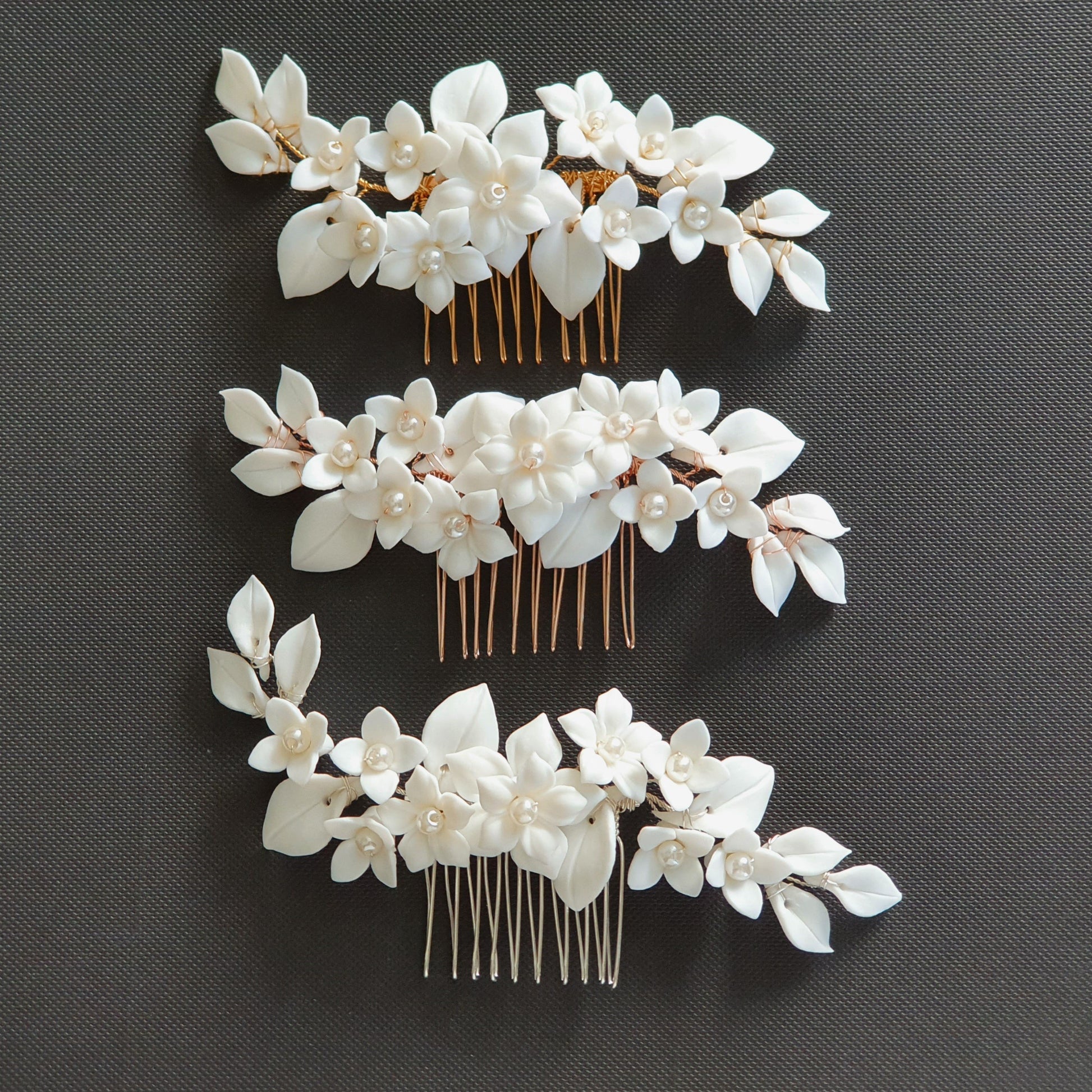 This bridal hair comb with white flowers and white leaves is made of porcelain. Each flower is carefully studded with a white pearl to give each flower some extra depth and dimension.