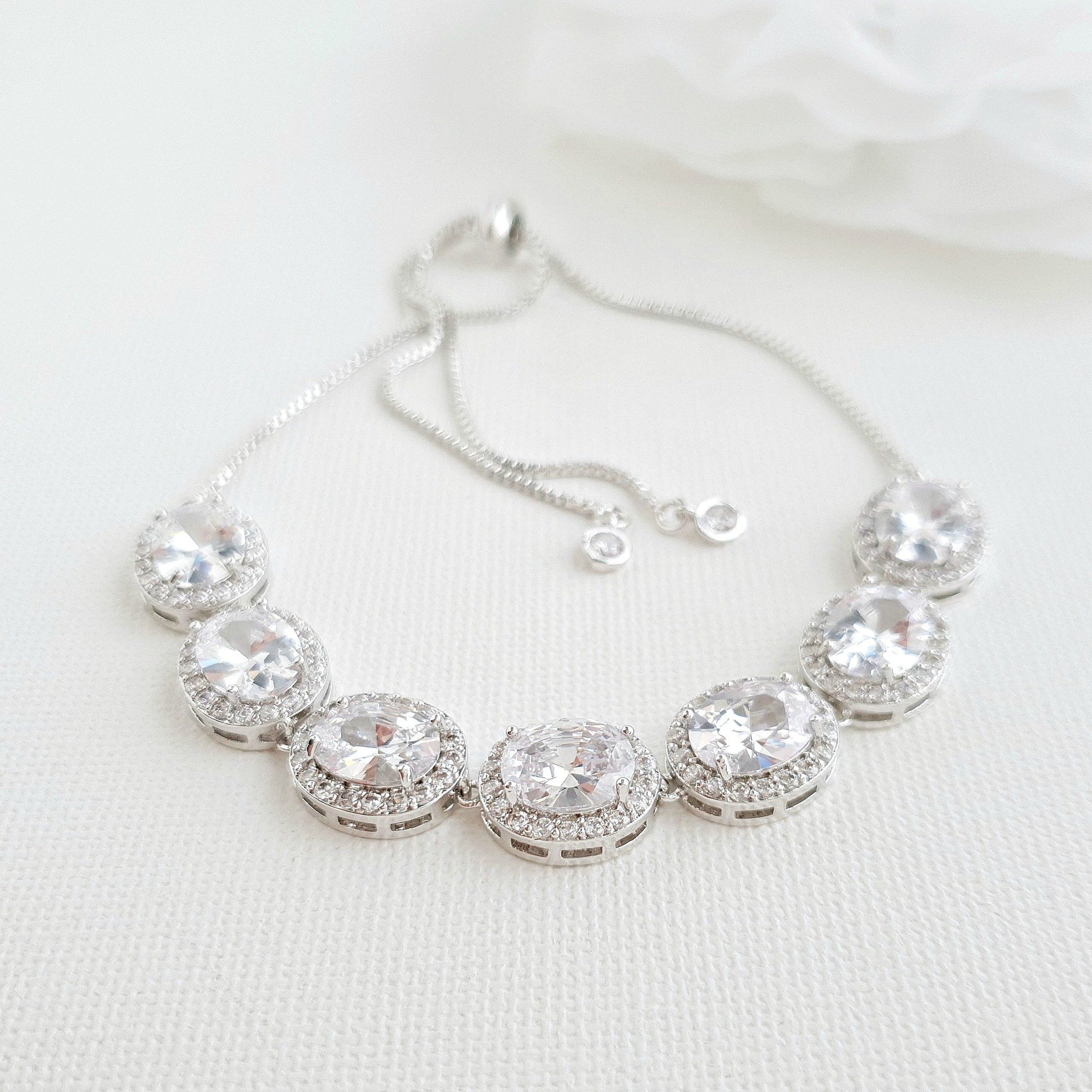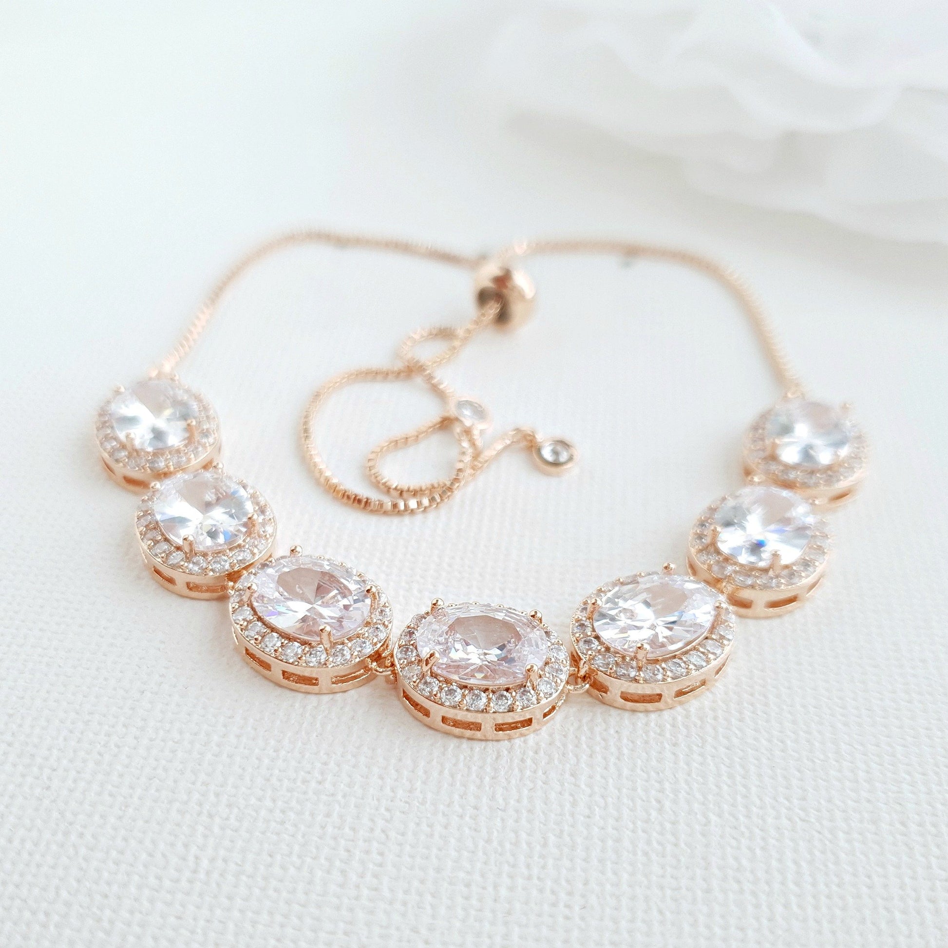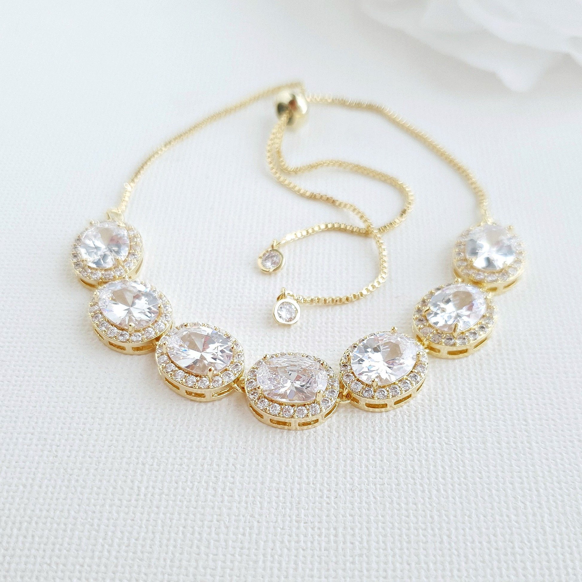 This adjustable cubic zirconia bracelet has a moveable slider clasp that fits small and large wrist types, this gold oval bracelet is made with an elliptical halo set CZ stones surrounded with tiny crystals that add extra sparkle with your wedding day wrist wear. The material used to make the bracelet is 14K gold plated on brass. It is also available in silver/rhodium finish and rose gold finish.