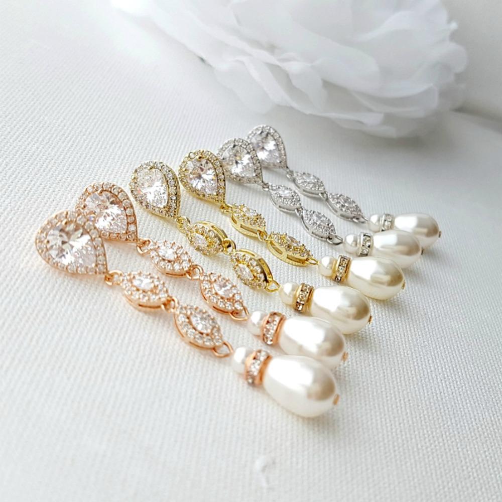 Earrings- The wedding earrings with pearl drops are very pretty and long, made of teardrop ear post and marquise CZ crystal beads. Great to wear after your wedding on several occasions.