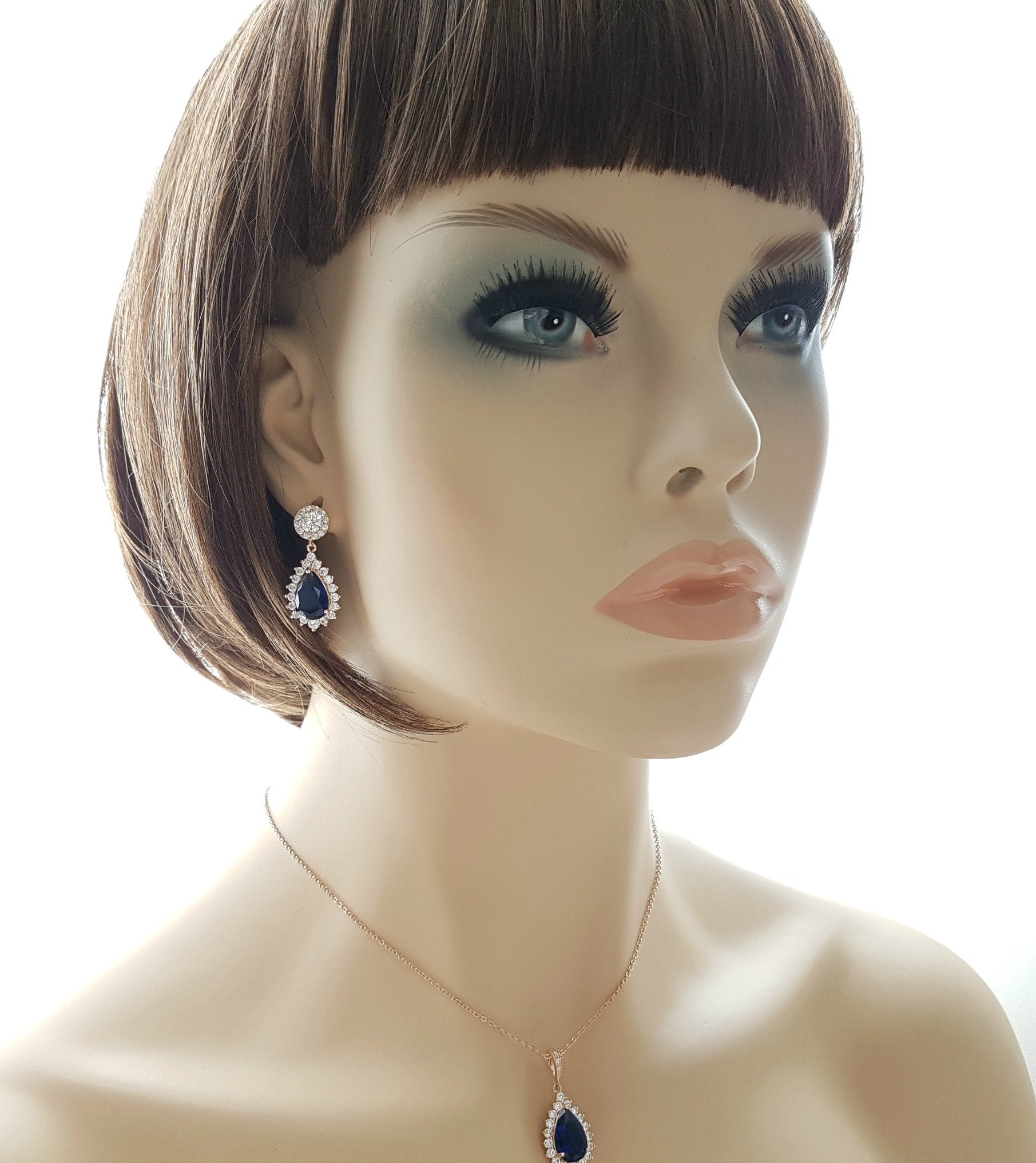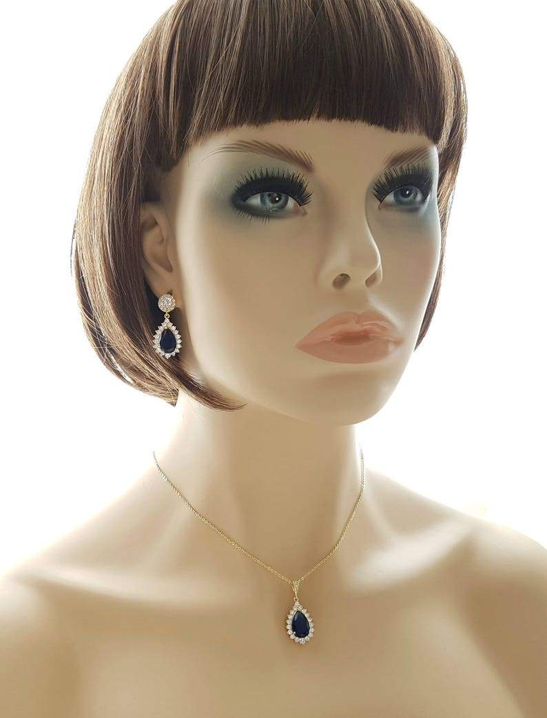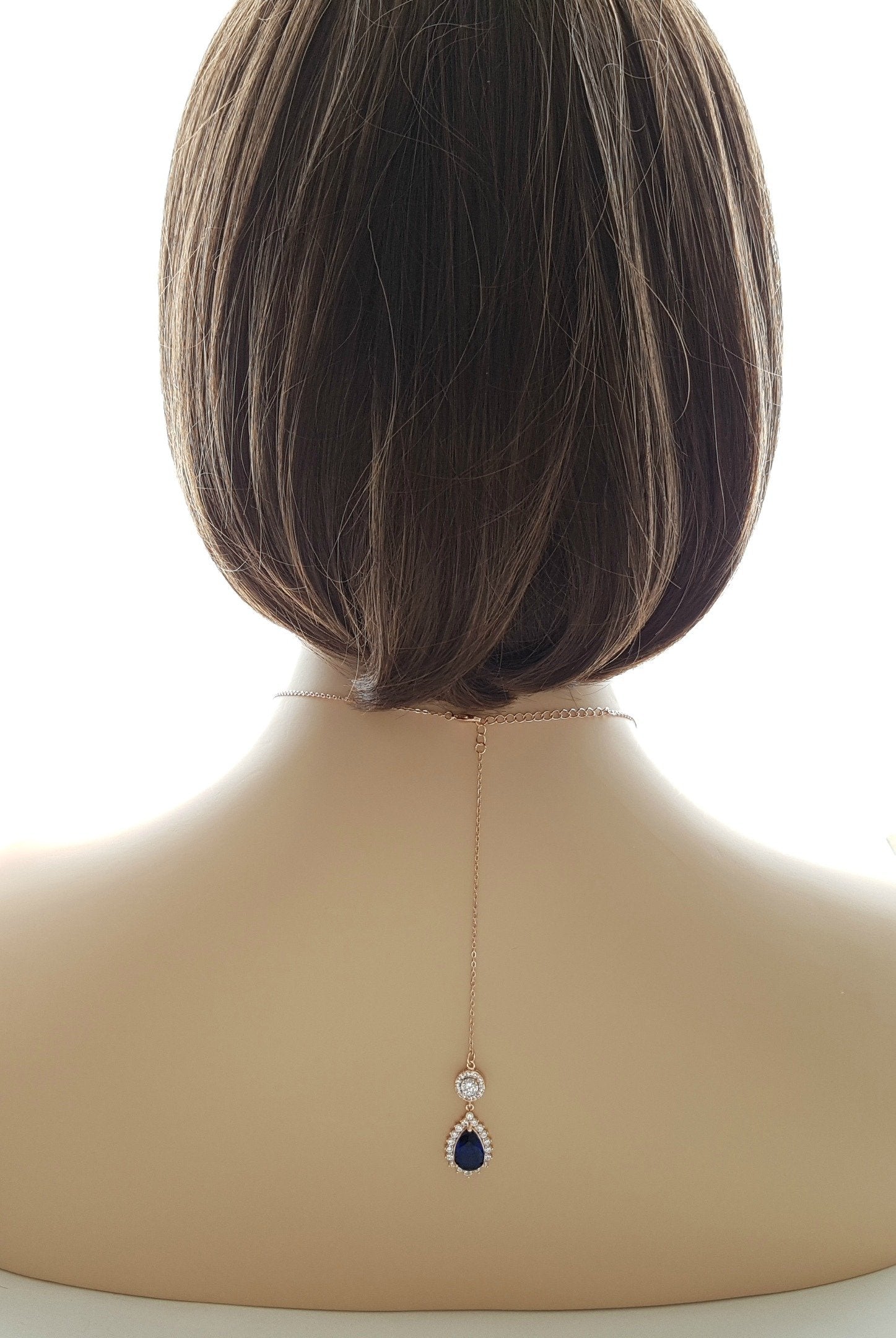 Looking to add something blue on your wedding day, here is a delicate blue & gold necklace with a backdrop. This blue bridal necklace is made of sapphire blue teardrop cubic zirconia with gold plated drops with a delicate chain. This bridal necklace will add sparkly something blue to your wedding day look.