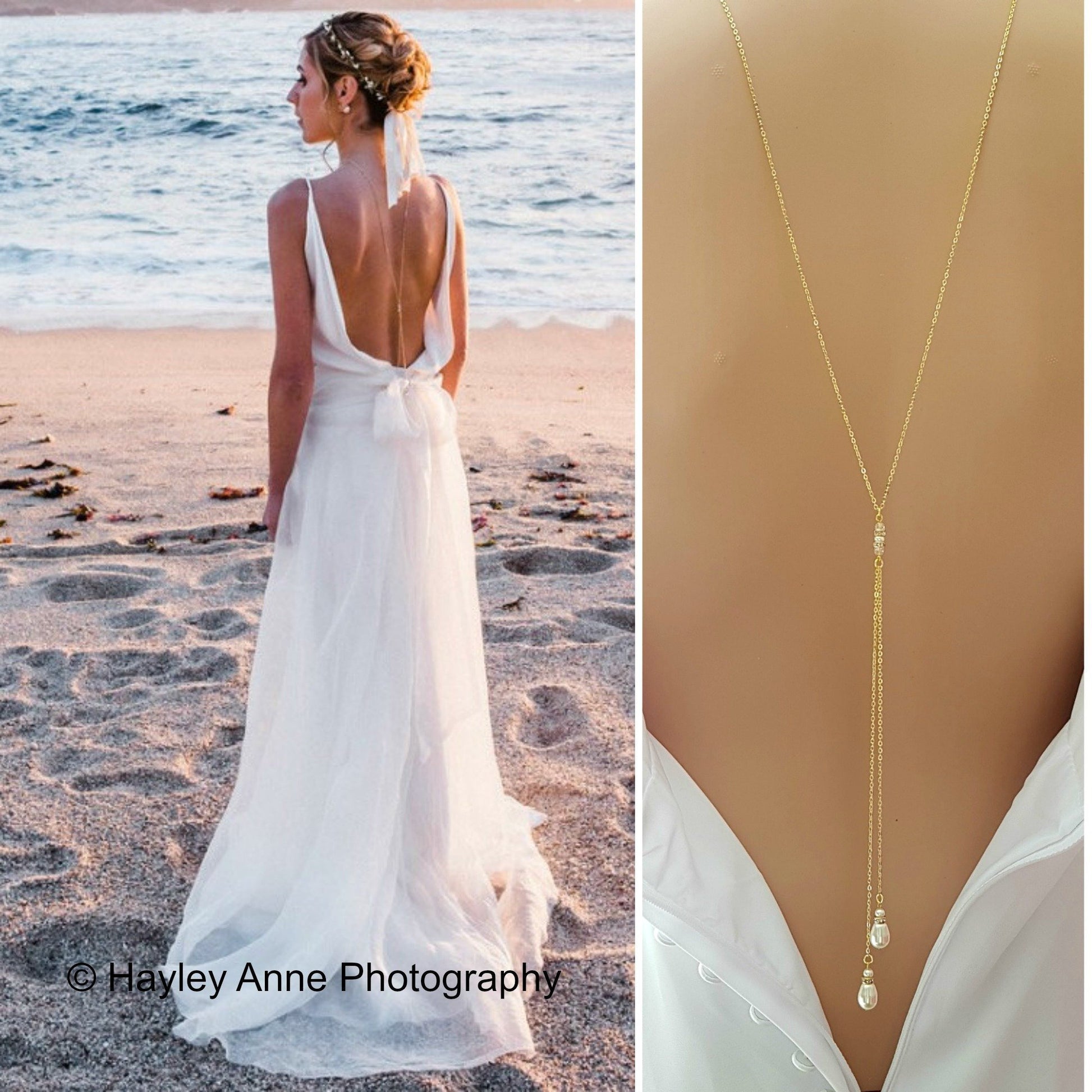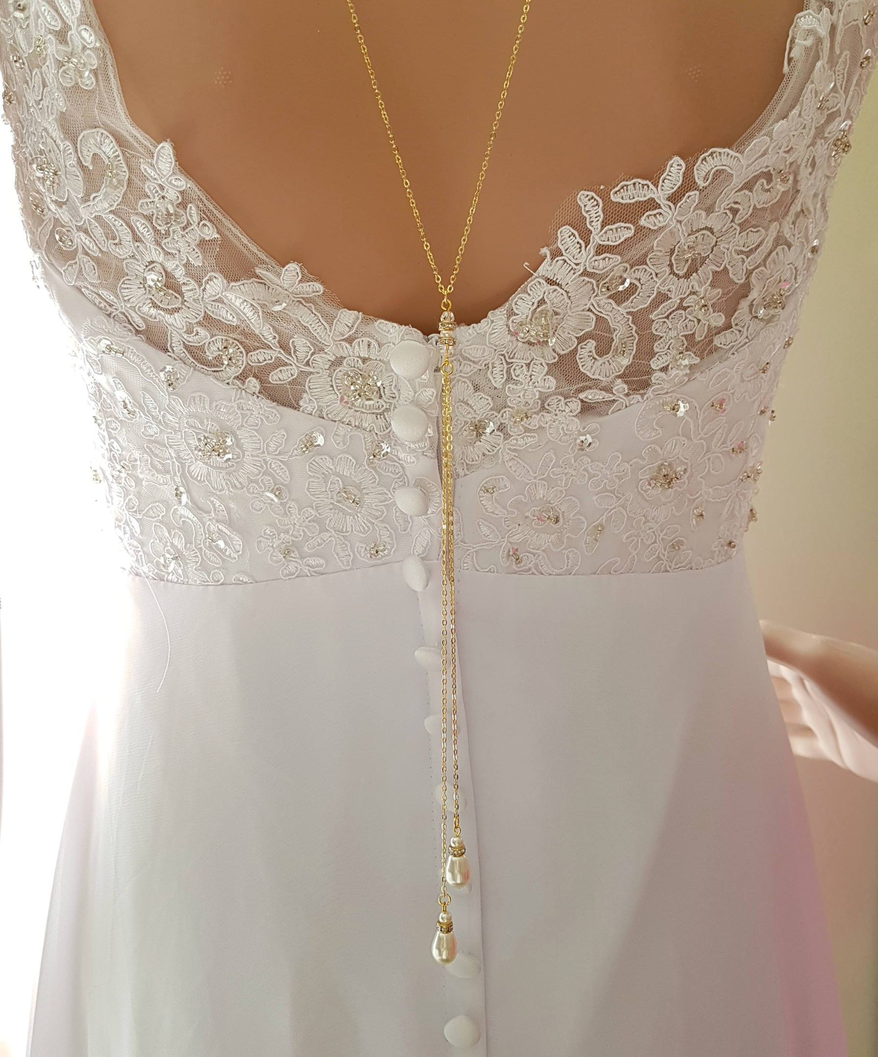 Dainty gold back wedding jewelry in 14k gold finish. The June necklace is a simple gold back necklace. I have designed the bridal necklace with teardrop pearls. The dainty pearl back drop necklace is available in a soft white pearl to match light ivory and white dresses or in a creamy pearl to match darker ivory dresses. I have paired it up with a pearl and put onto a delicate link chain with two pearl drops at varying lengths. The material used is 14k gold plated brass.