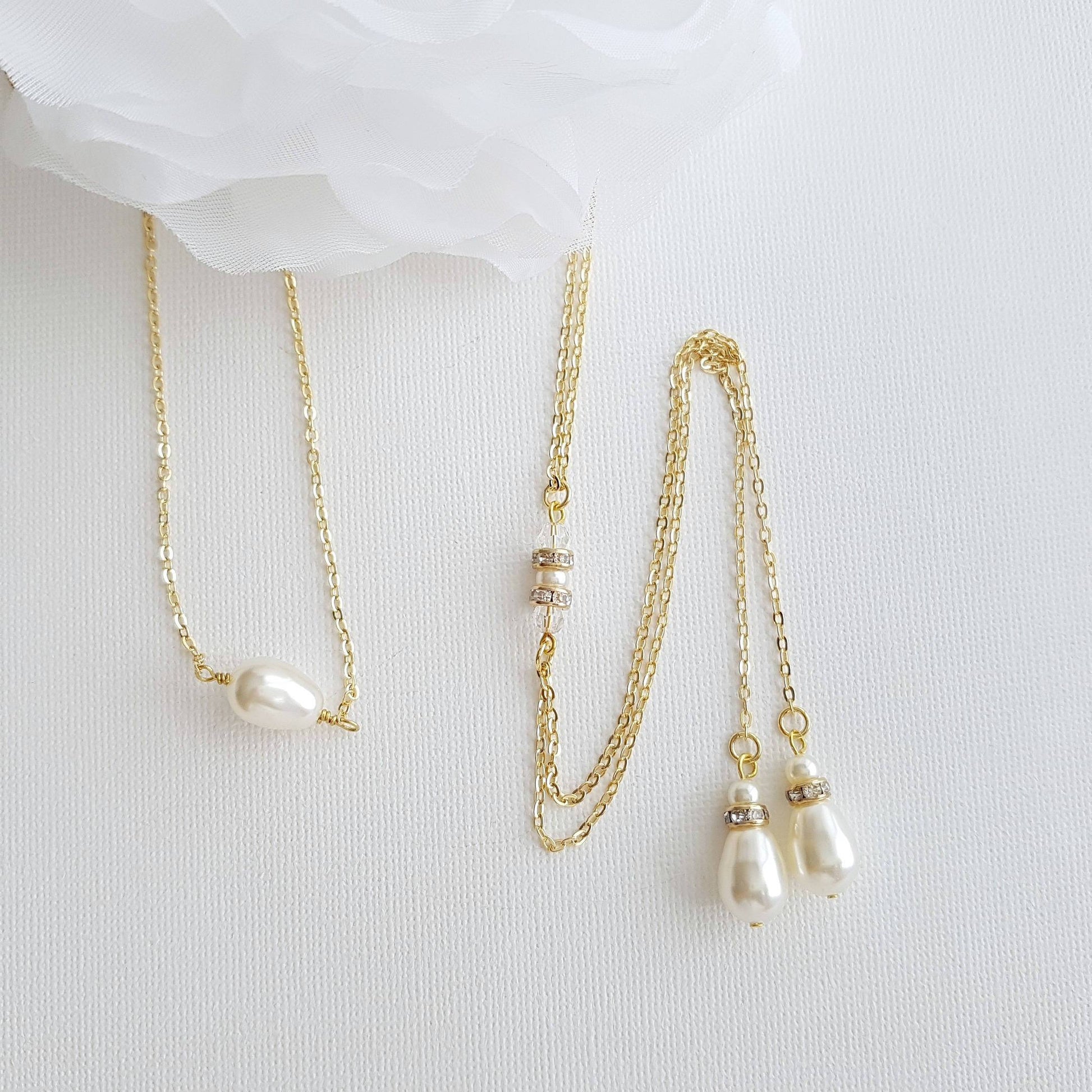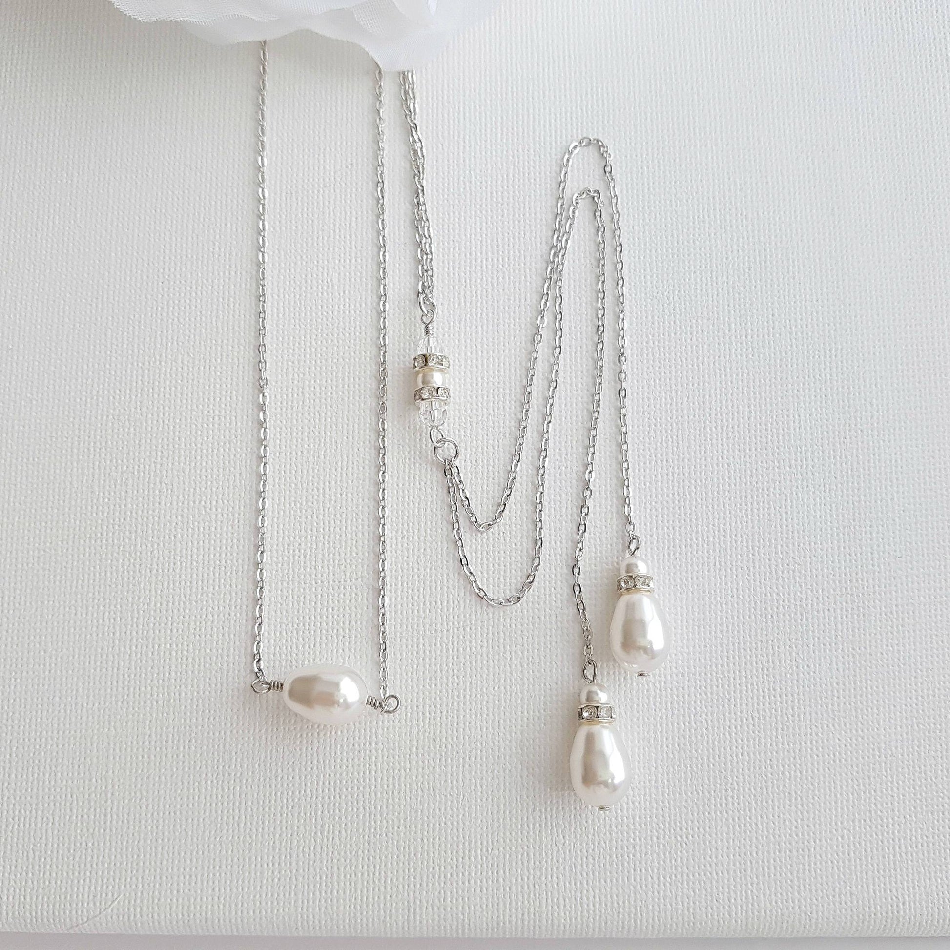 The necklace is designed without a clasp and meant to be slipped over the head. It can also be worn with the pearl drops in front for a deep V Dress or at the back. Available in silver/rhodium and rose gold finish. Also available with a matching pair of simple earrings.