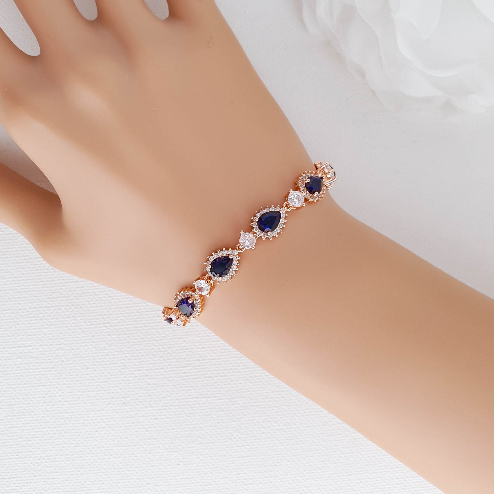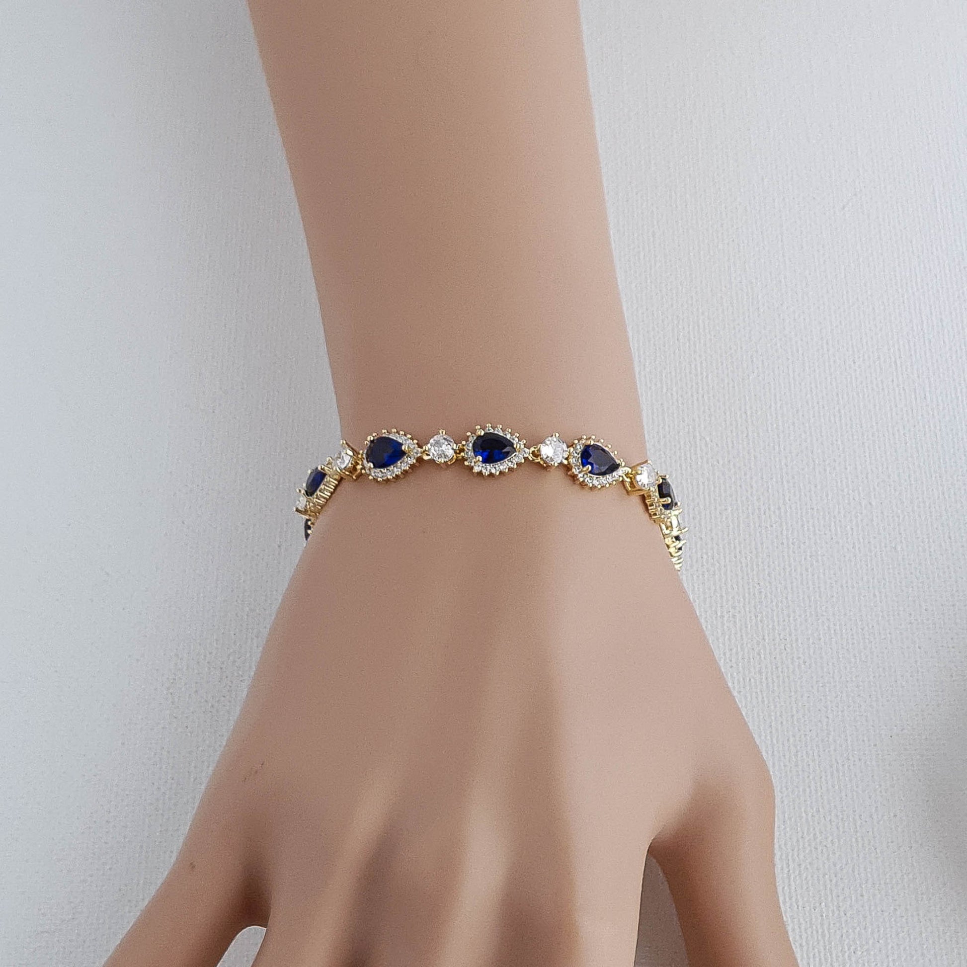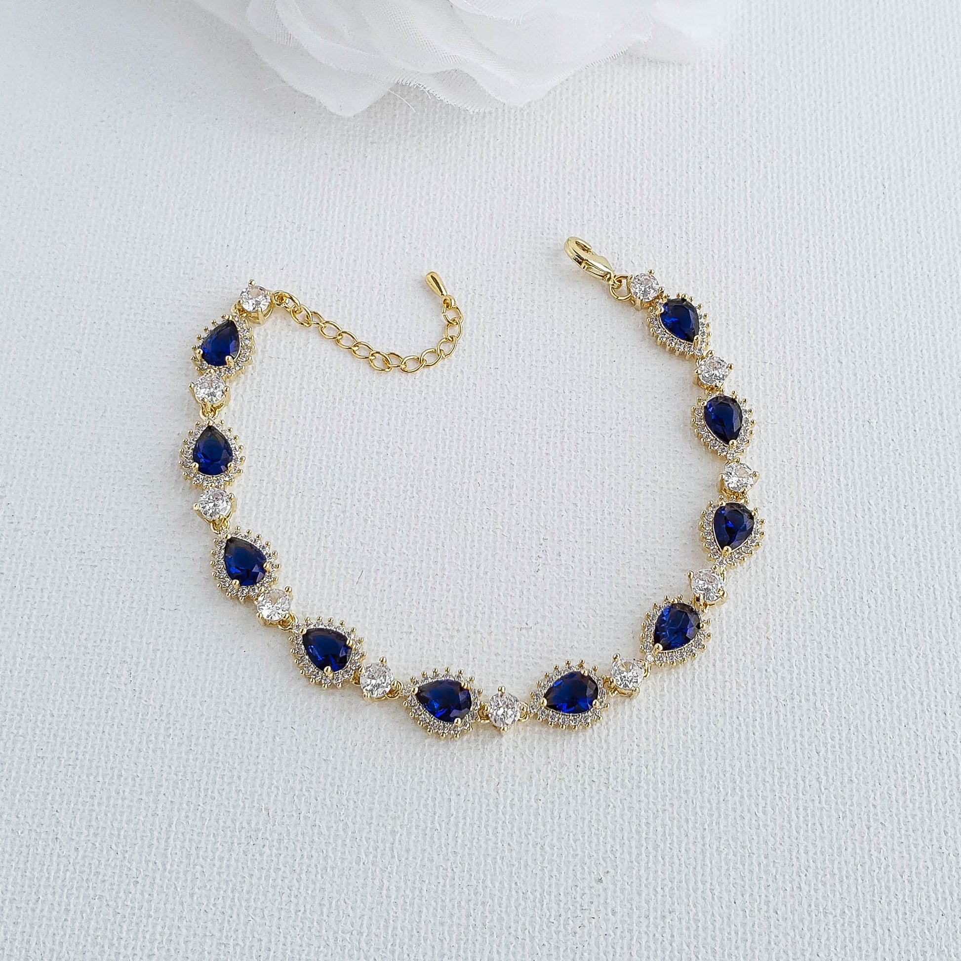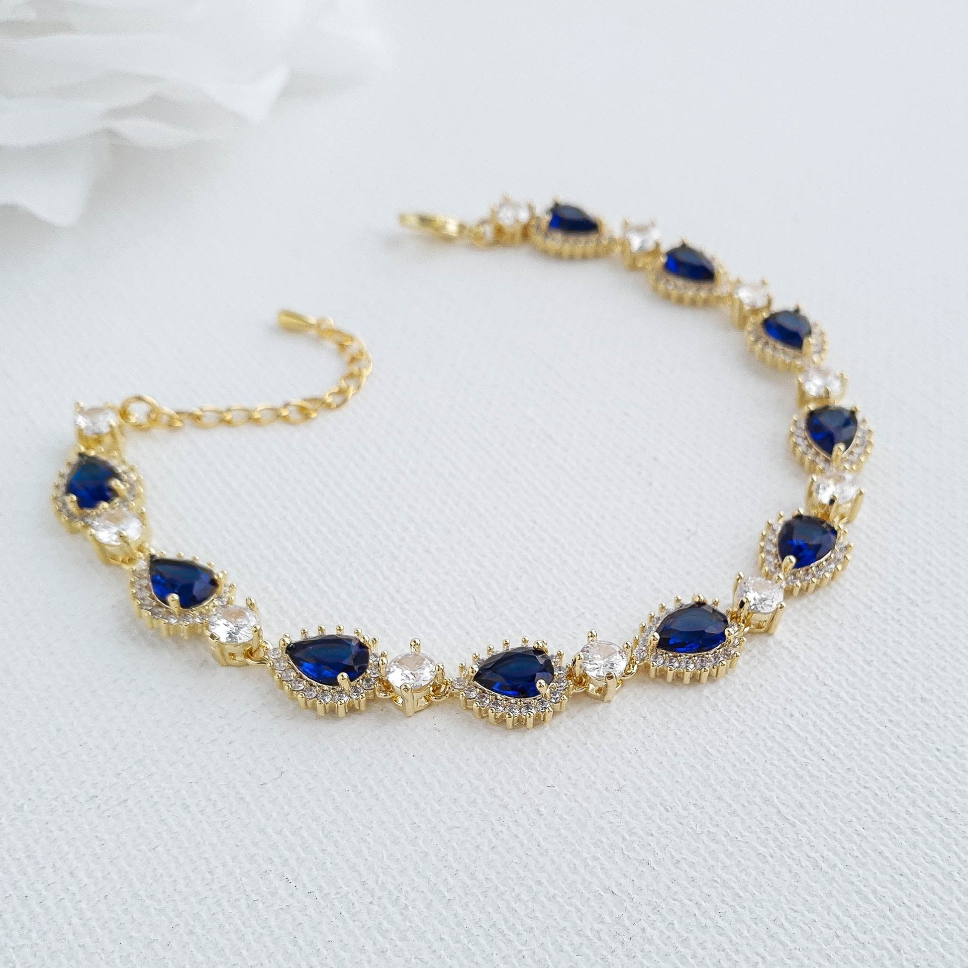 The bracelet is made of sapphire blue color cubic zirconia crystals, which are in teardrop shapes. If you like this gold bracelet design with a blue CZ crystal combination, we have them in silver and rose gold shades with blue stones to suit your style.