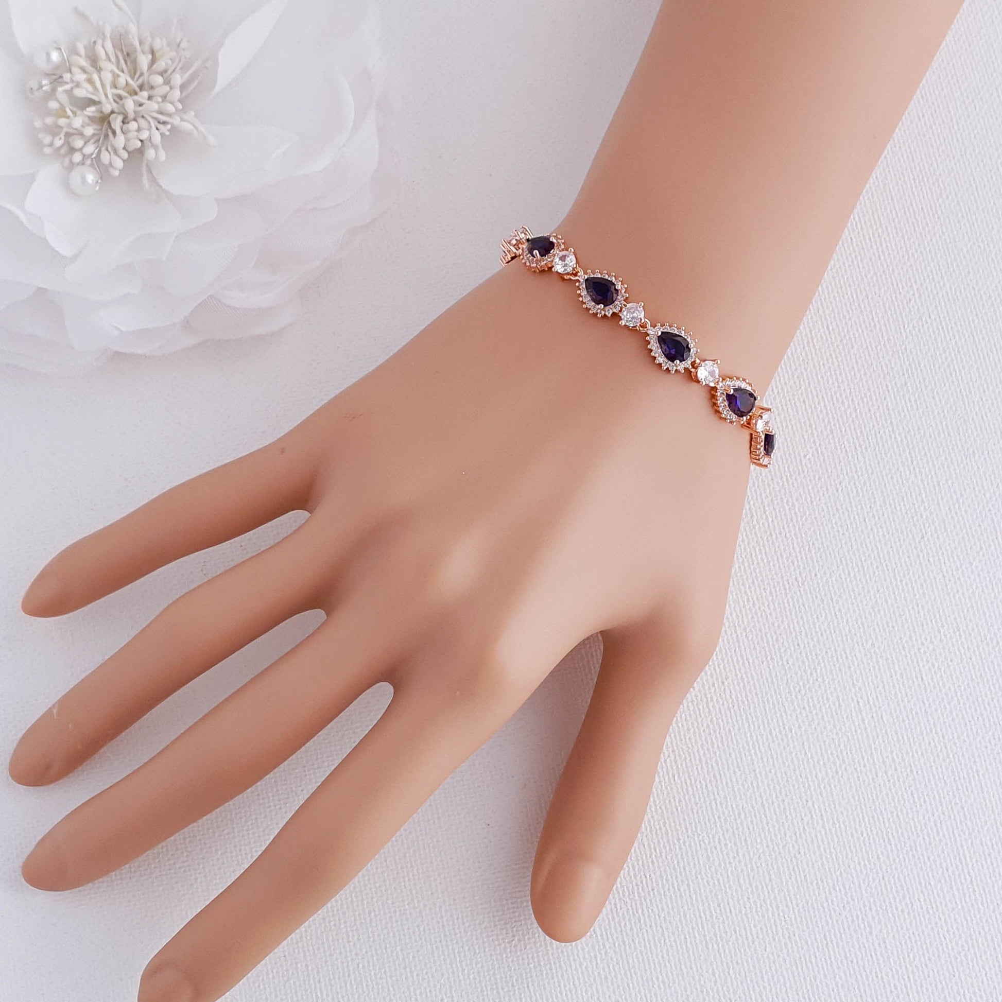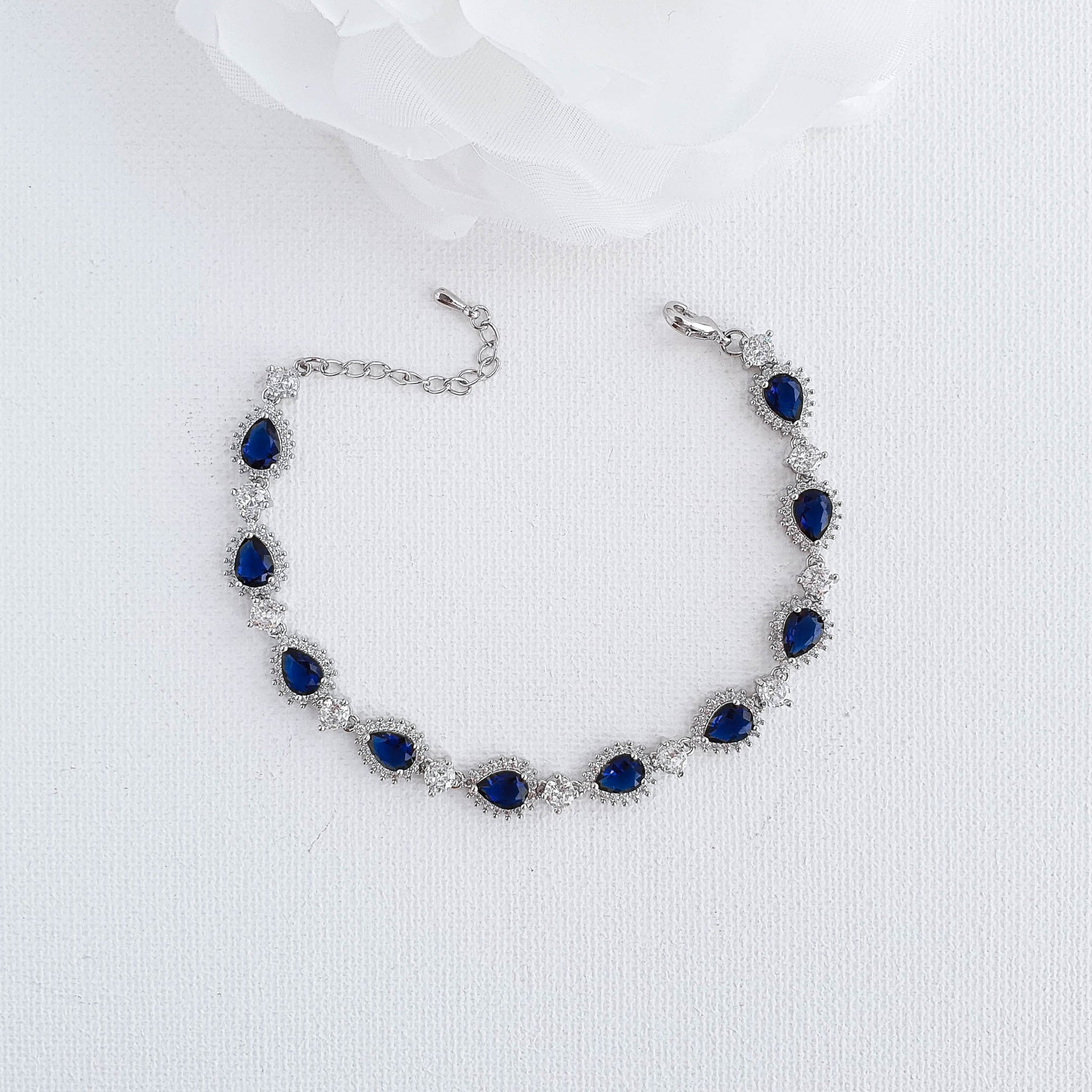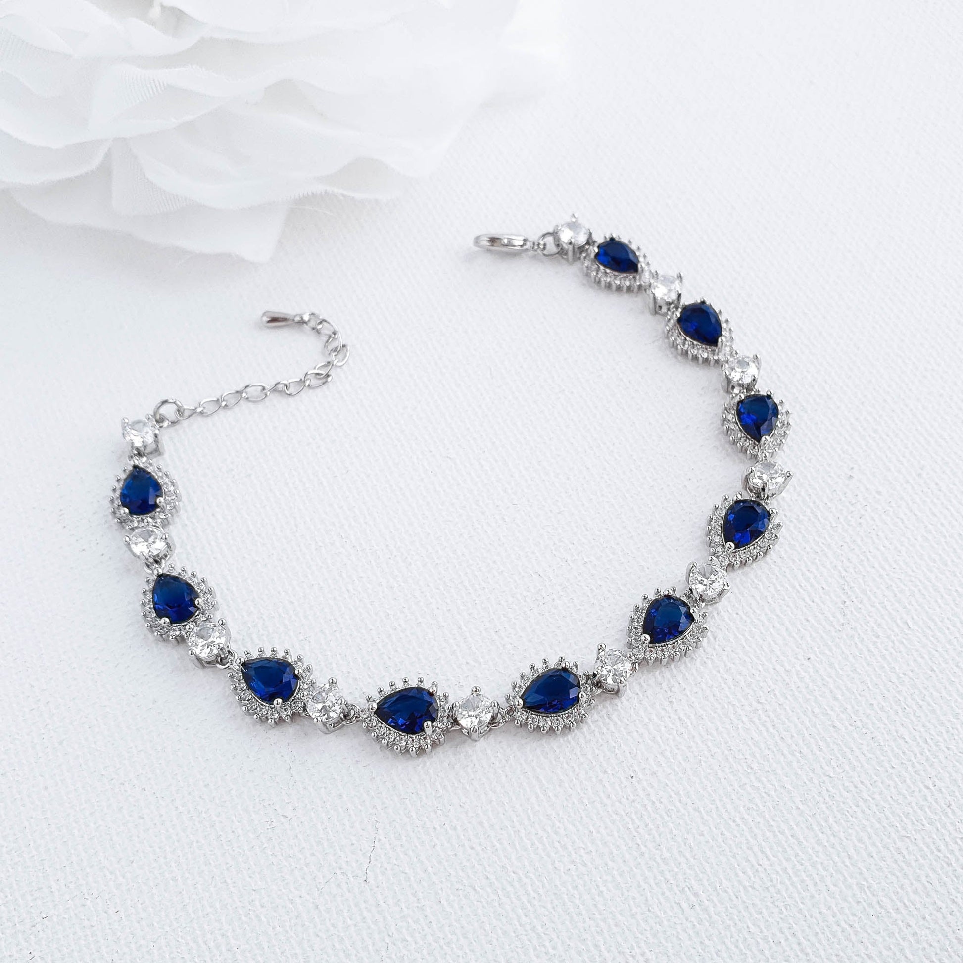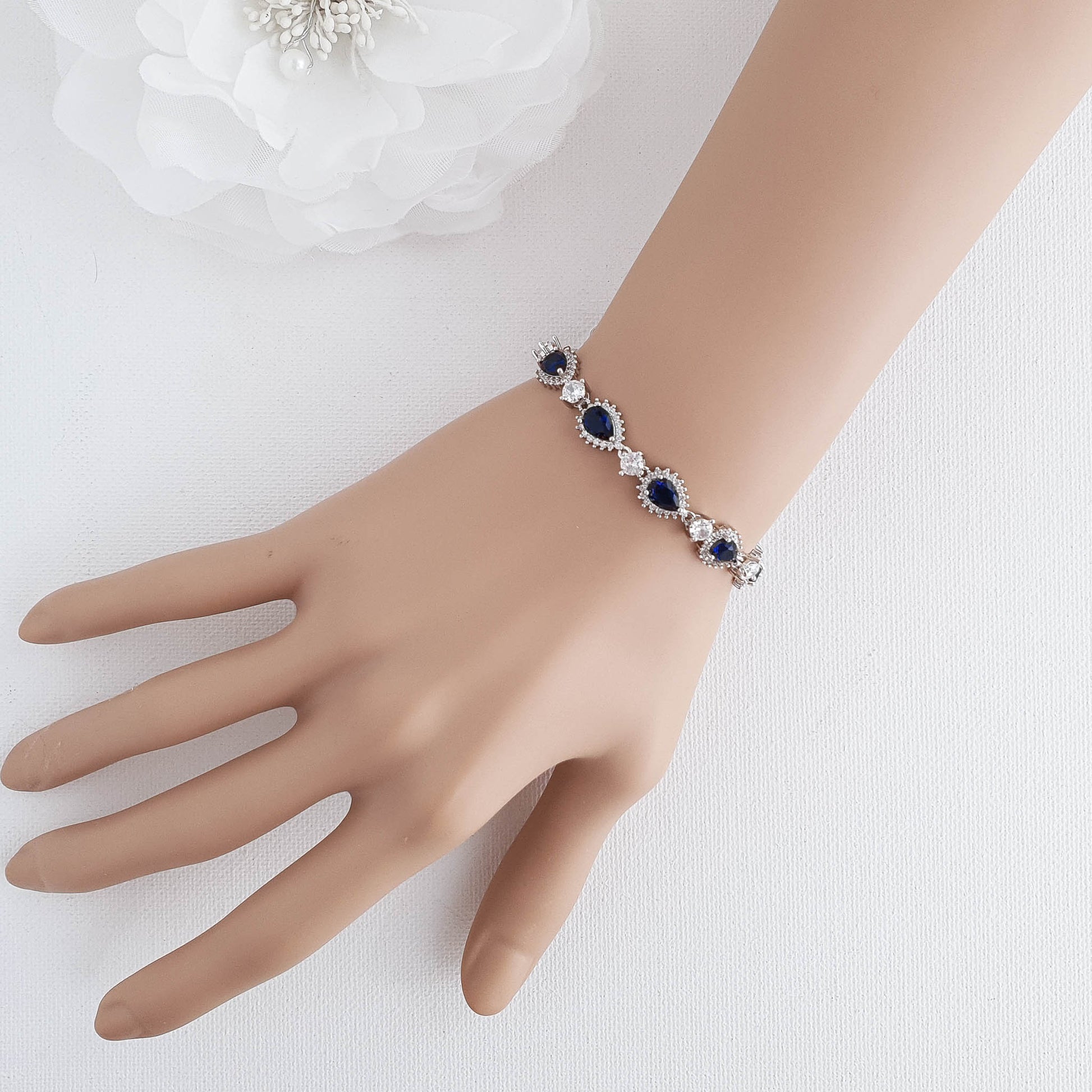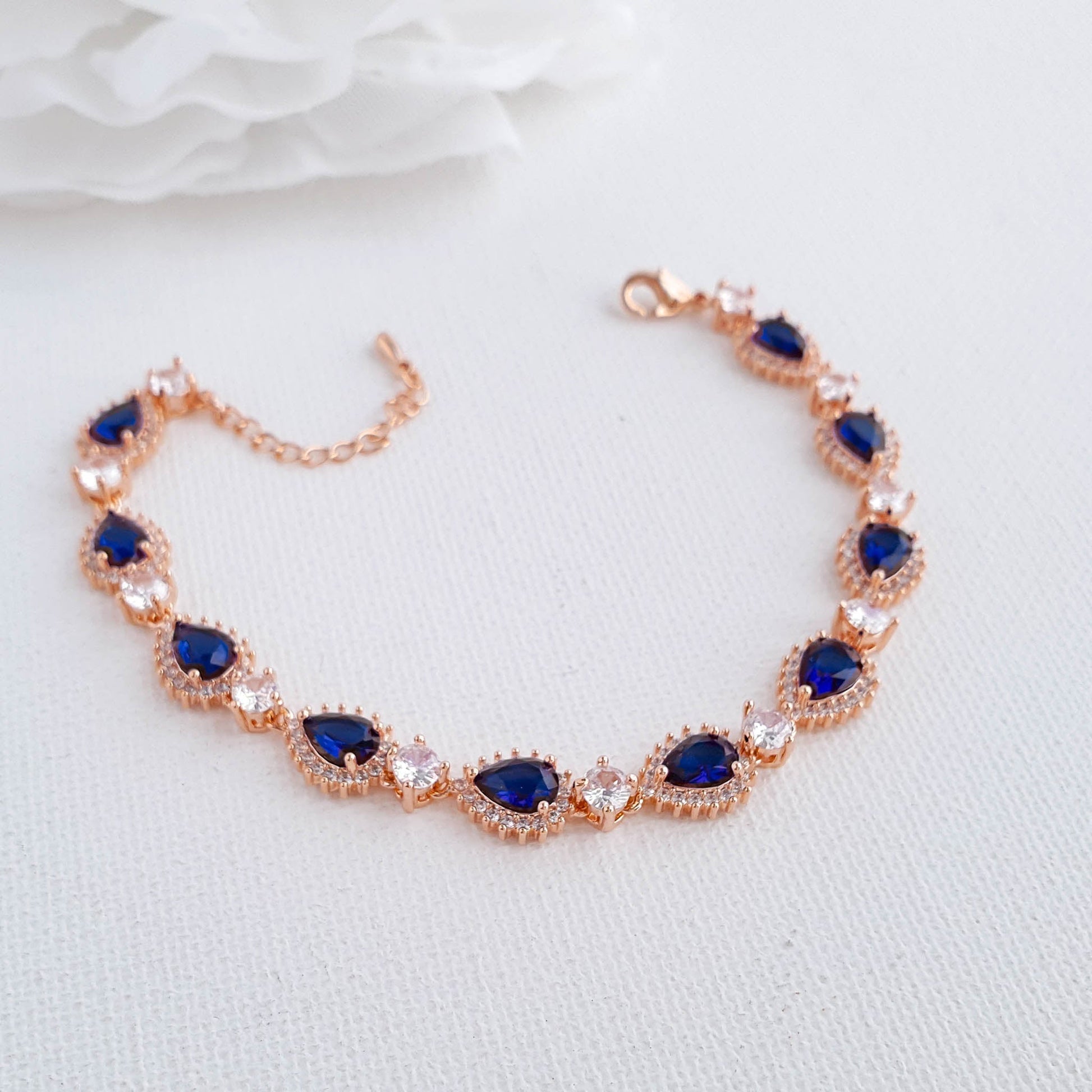 The bracelet is made of sapphire blue color cubic zirconia crystals, which are in teardrop shapes. If you like this gold bracelet design with a blue CZ crystal combination, we have them in silver and rose gold shades with blue stones to suit your style.
