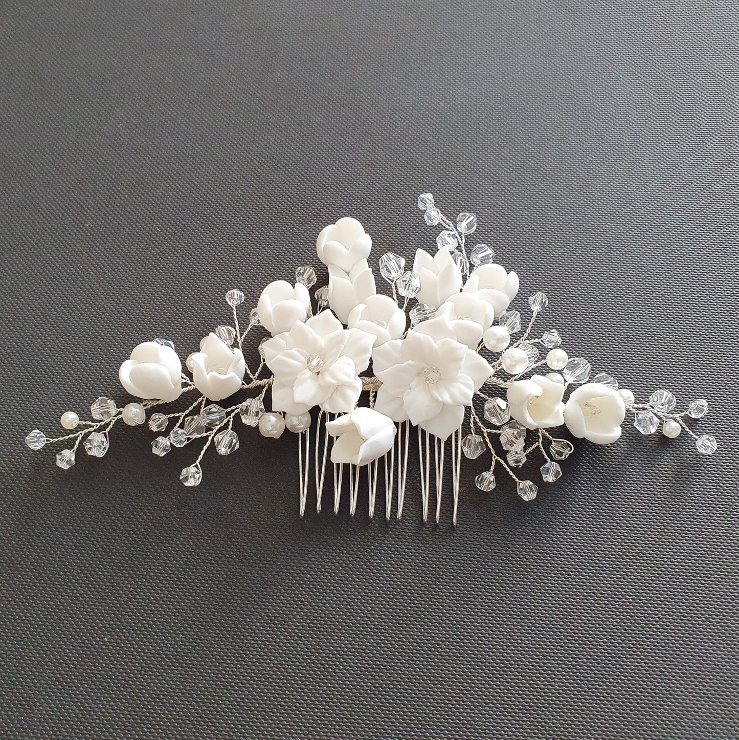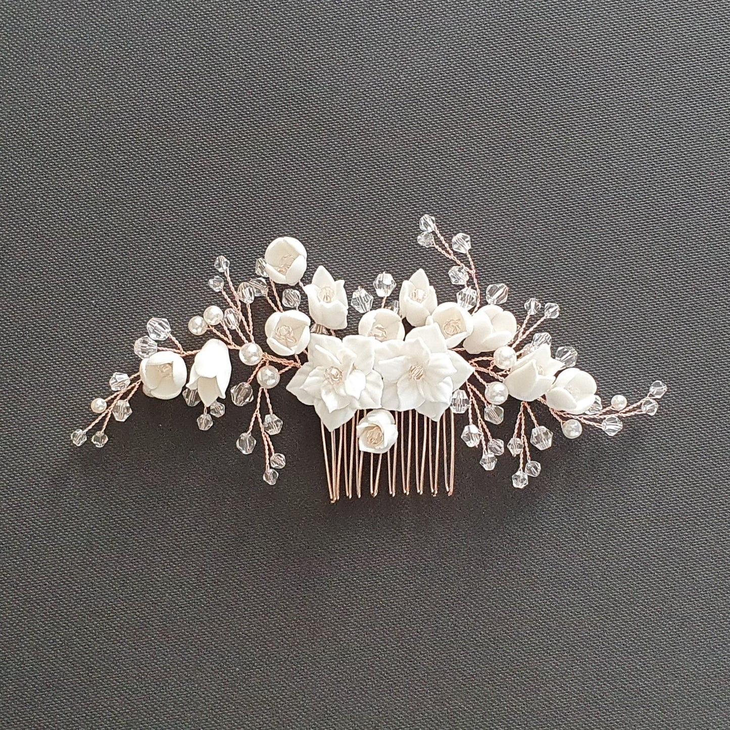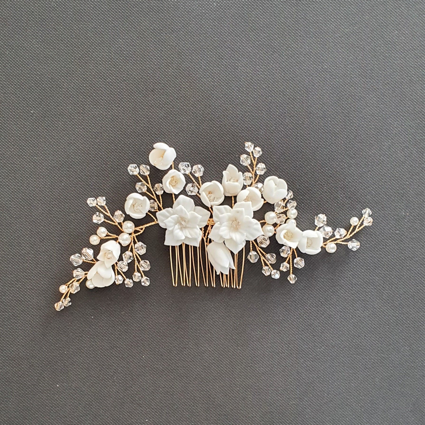 Here is a gold bridal hair comb with white porcelain Flowers and Crystal Beads, which you will love.
