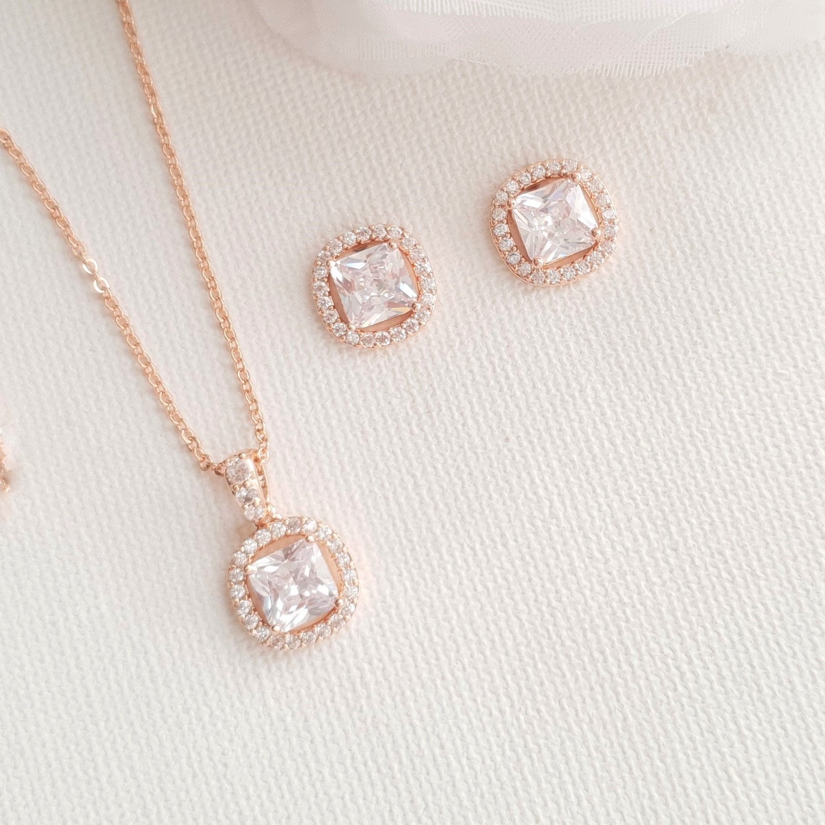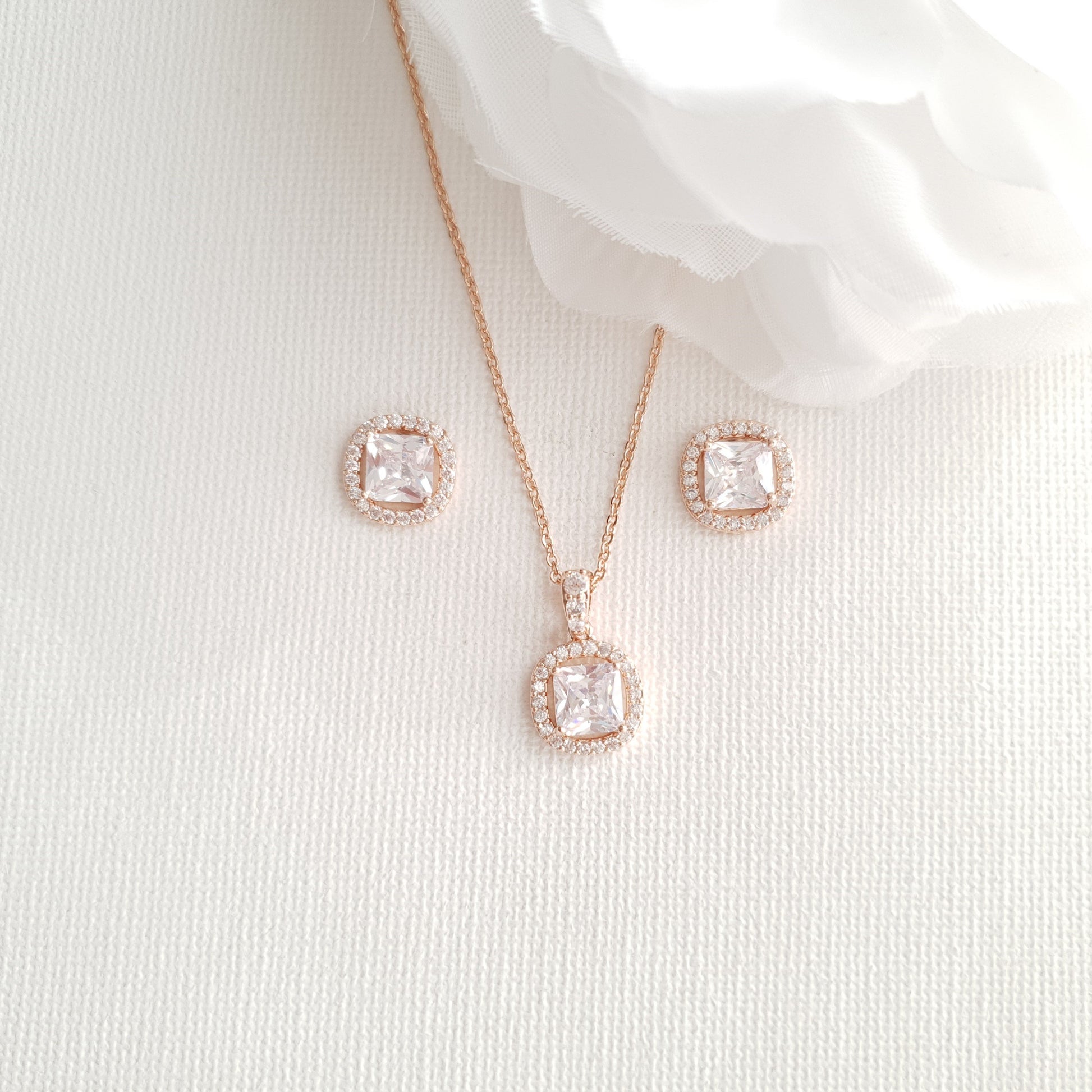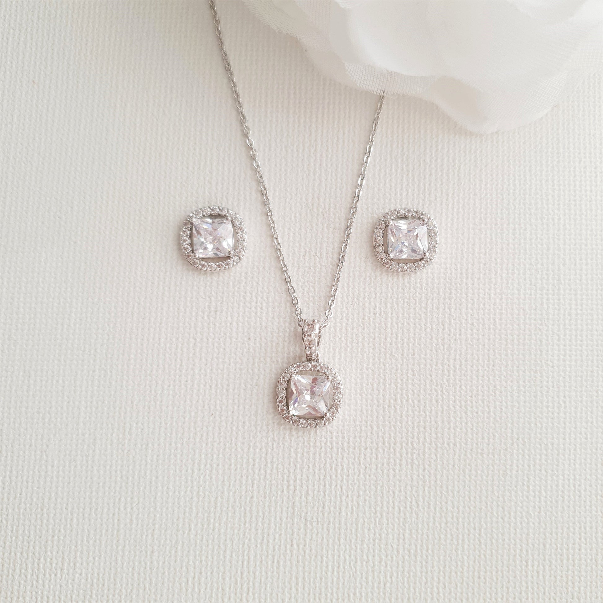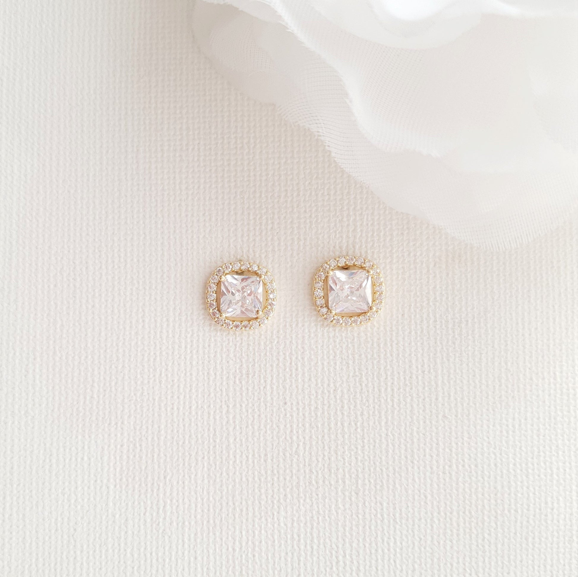 Earrings- The earrings are round stud earrings featuring a square cushion cut CZ stone in the middle. The stud earrings are comfortable and the ear pins are made of stainless steel.