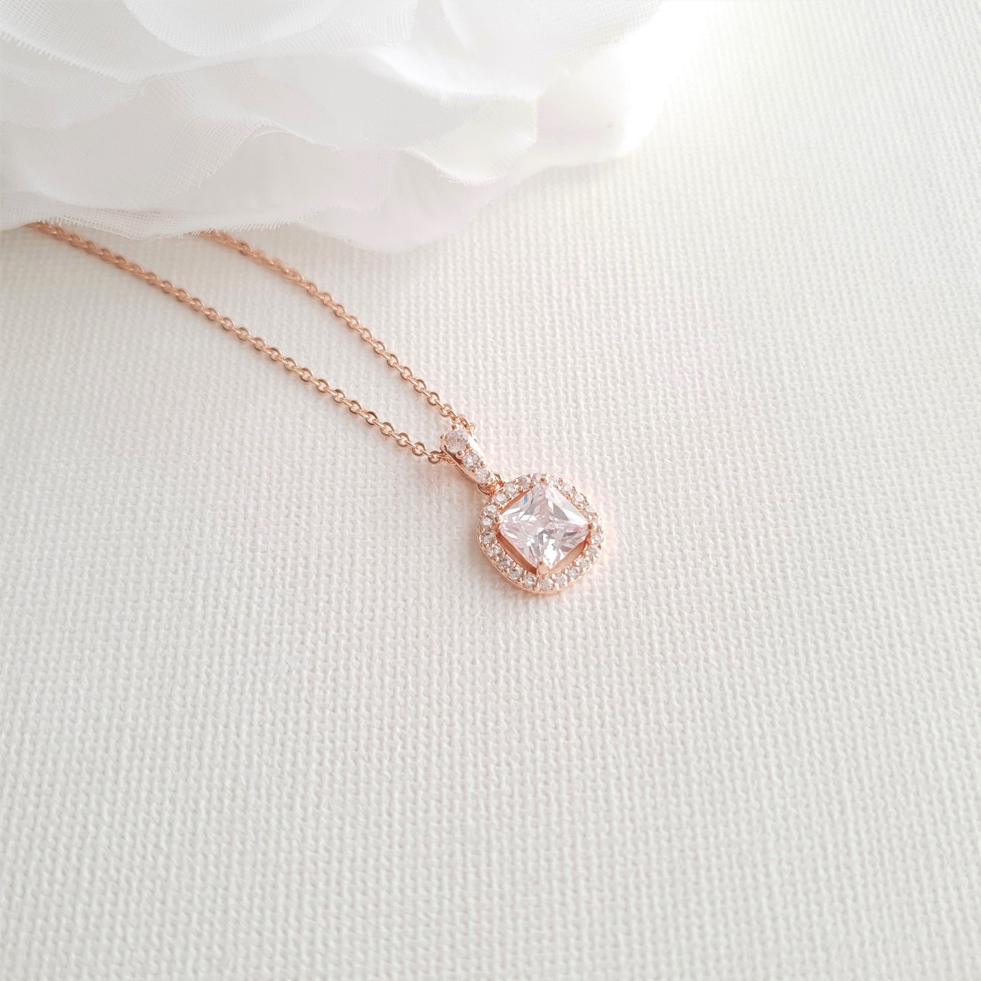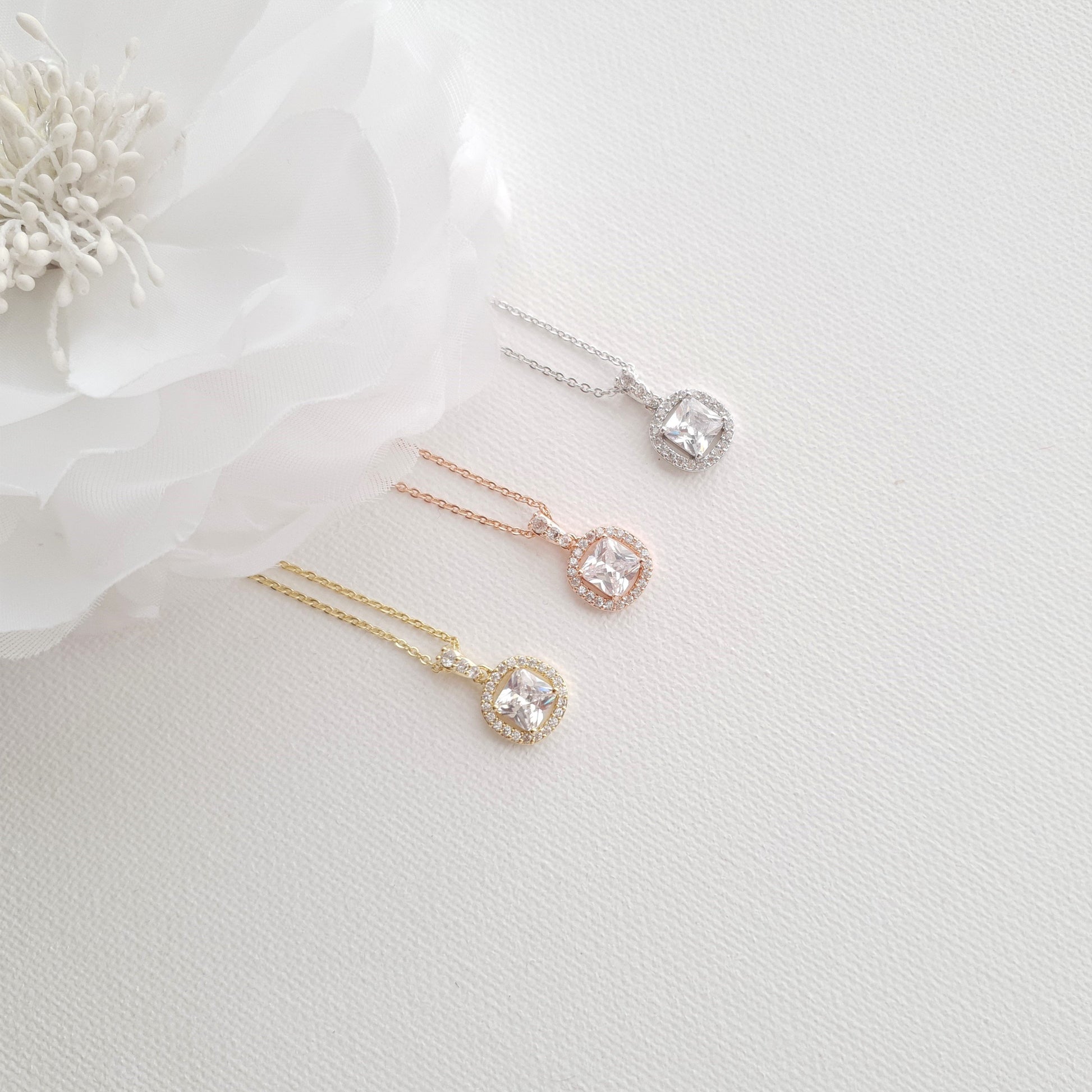This gold bridesmaids' jewelry combines simple stud earrings and a pendant necklace. Both the earrings and necklaces are made of cubic zirconia with 14K gold plating. The pins on the earrings are made of stainless steel.