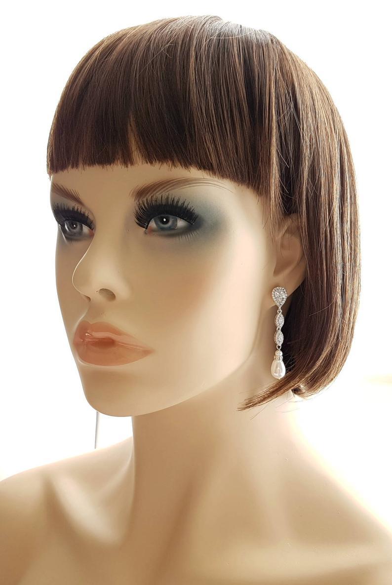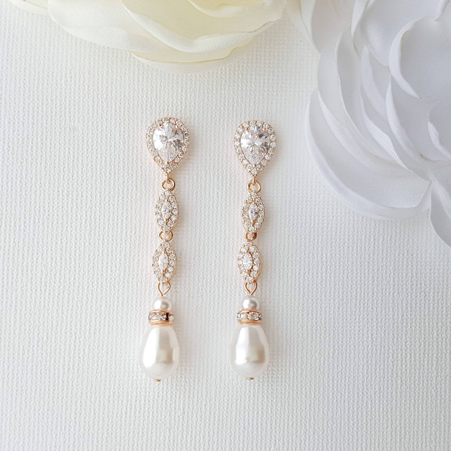 Explore these beautiful Abby gold clip-on bridal earrings which are made of brides and women with non pierced ears. They are long and slim in 14k yellow gold plating on brass. These clip earrings are designed with sparkly marquise cubic zirconia crystals and teardrop pearls. Not just that, you will have an option to choose the pearl color of cream or white to match with your bridal and wedding dresses. These long clip-on bridal earrings are lightweight and clip-on clips are comfortable for day-long wear. We use high-quality material on all our products and this is no exception and sure to last forever and a day with little TLC ( see our Care of Jewelry) to use long after your wedding on every occasion. The earrings are available in three finishes of Gold, Rose gold, and Silver finishes/ tones.