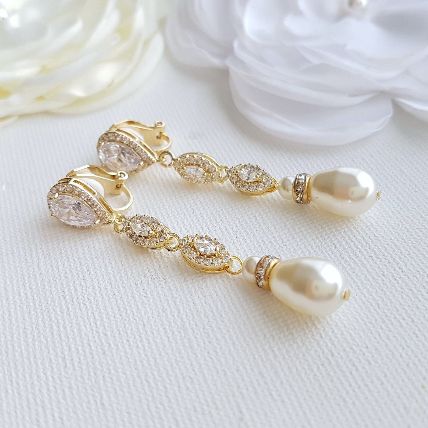 Gold Clip On Bridal Earrings-Abby