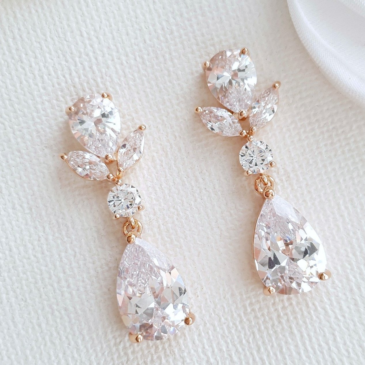 Beautiful small gold clip-on earrings for unpierced pierced ears, which look lovely on brides, bridesmaids, and women of all ages. Though the earrings are petite they are full of sparkle. Both the ear top and the drop in pear shape are made with faceted cubic zirconia to shine and reflect light from all angles. If you have not chosen to pierce your years, don't worry, your option is not restricted for choice. These delicate earrings will seamlessly fit any of your attire for a perfect look every time. The earrings are available in three finishes of silver, gold and rose gold tone. The length of Earring from top approx. ¢¬‚¬Å“1 1/8 inches or 3 cms and 10 mm wide