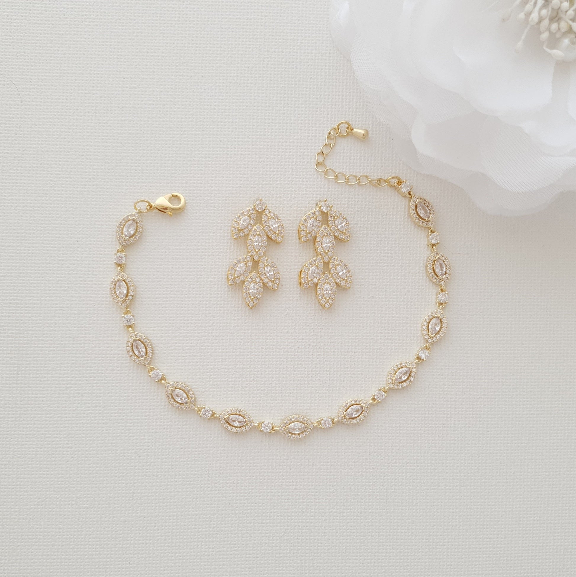 If you are looking for a gold jewelry set for your wedding and need to be simple, here is a gold drop stud earring and bracelet set for your wedding. This stud earrings and bracelet set is perfect as your bridal jewelry set to keep it simple with plenty of glitters.