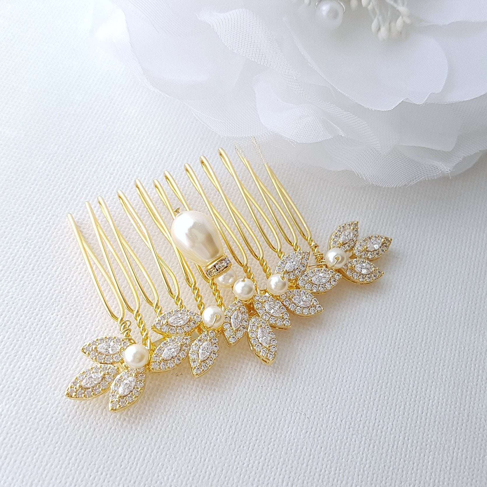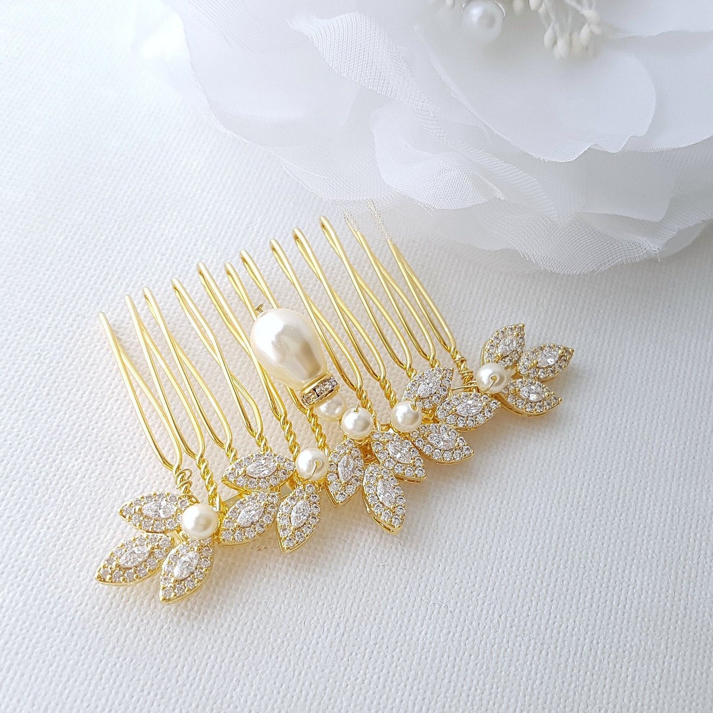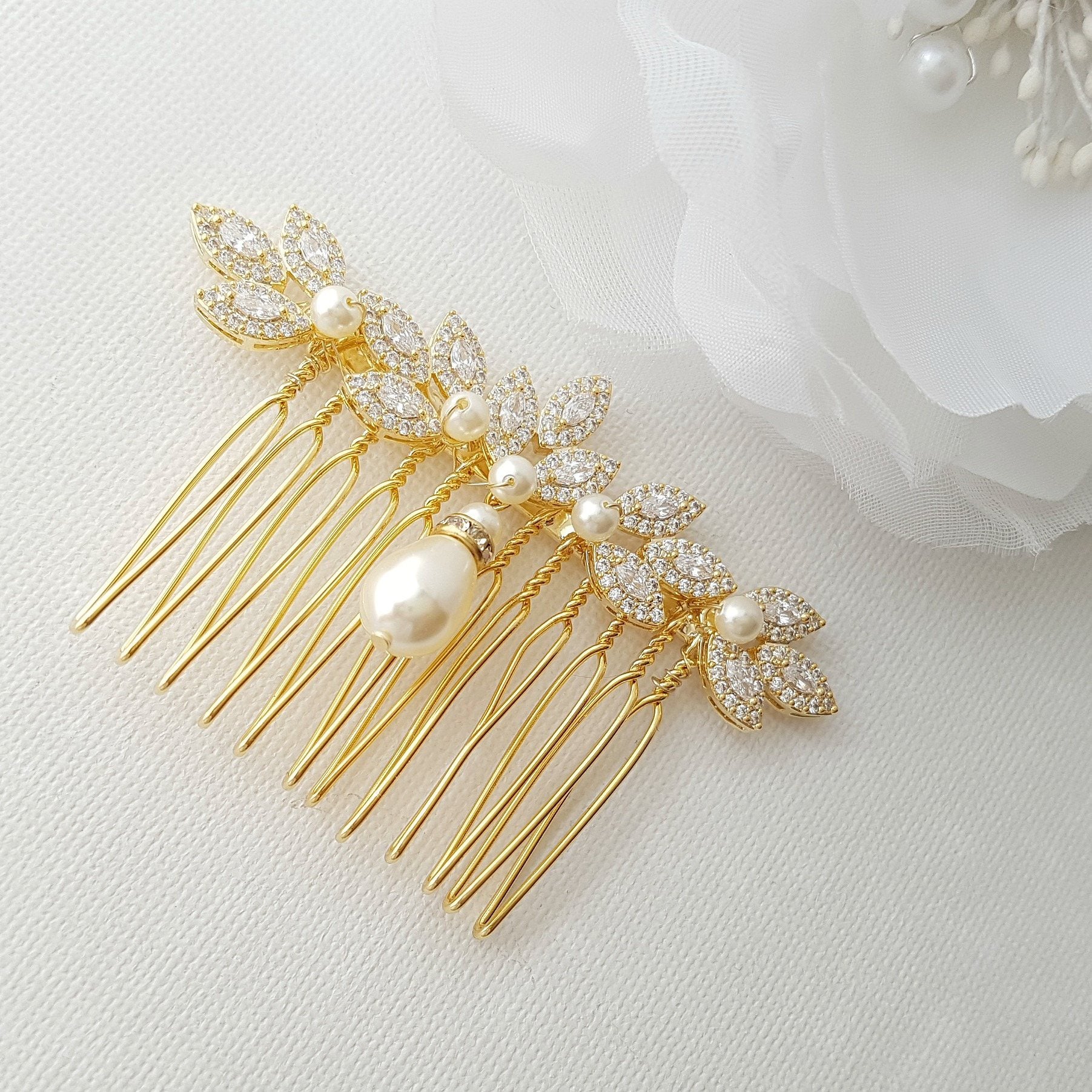 This gold wedding hair comb is available in two other finishes of silver and rose gold, with pearl color options of cream or white.