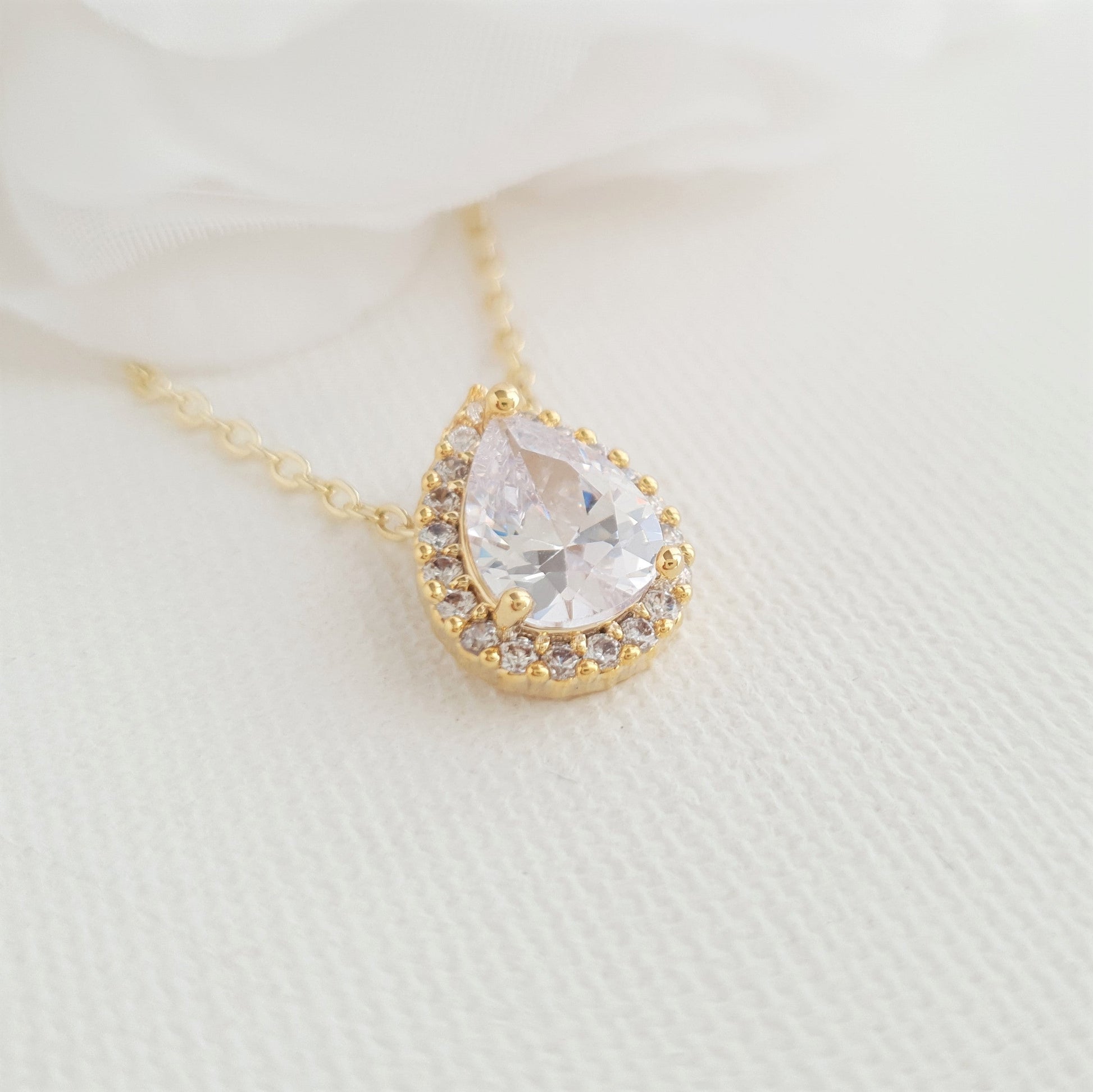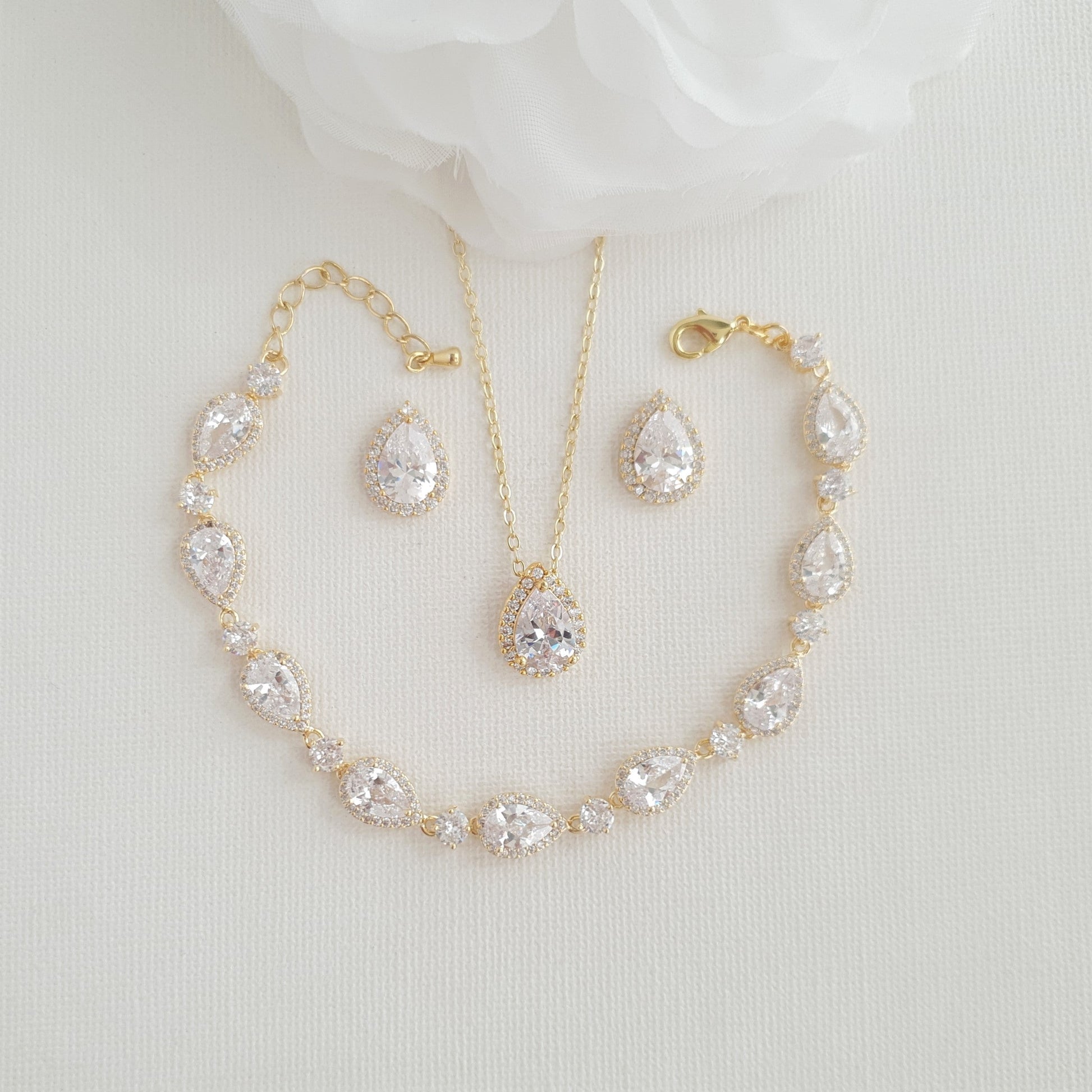 This simple 3-piece gold jewelry set is crafted with sparkly cubic zirconia in a teardrop shape. Get a matching gold jewelry set, a teardrop pendant necklace, a dainty bracelet, and stud earrings.