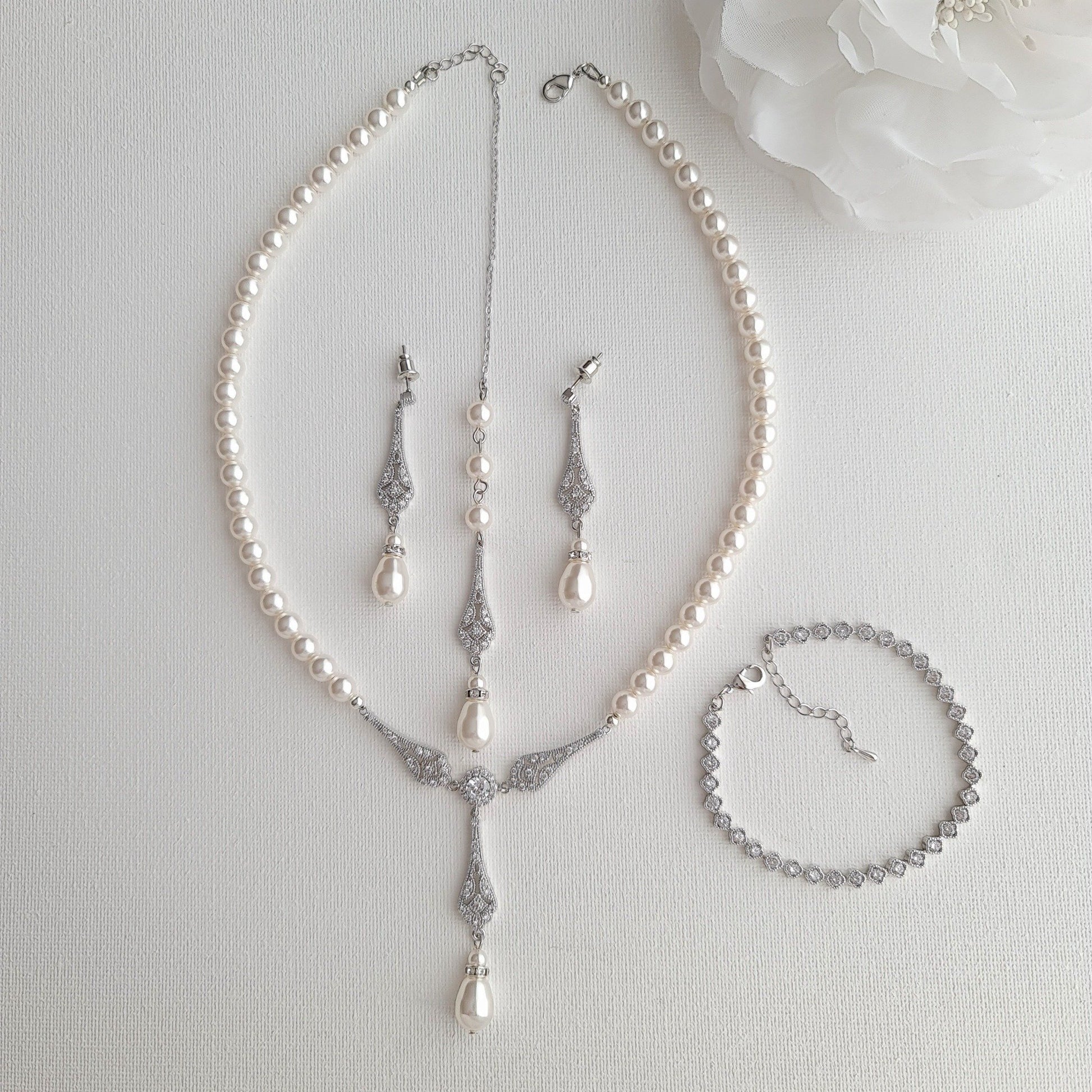 Pearl Bridal Jewelry Set with Earrings, Necklace & Bracelet for Brides