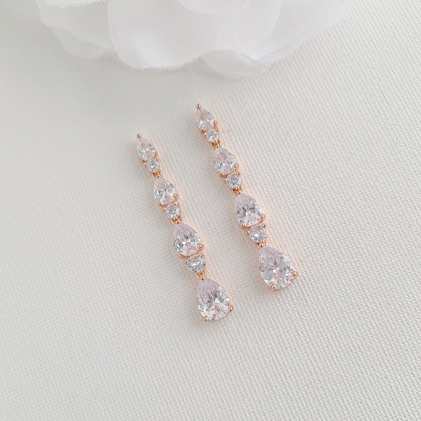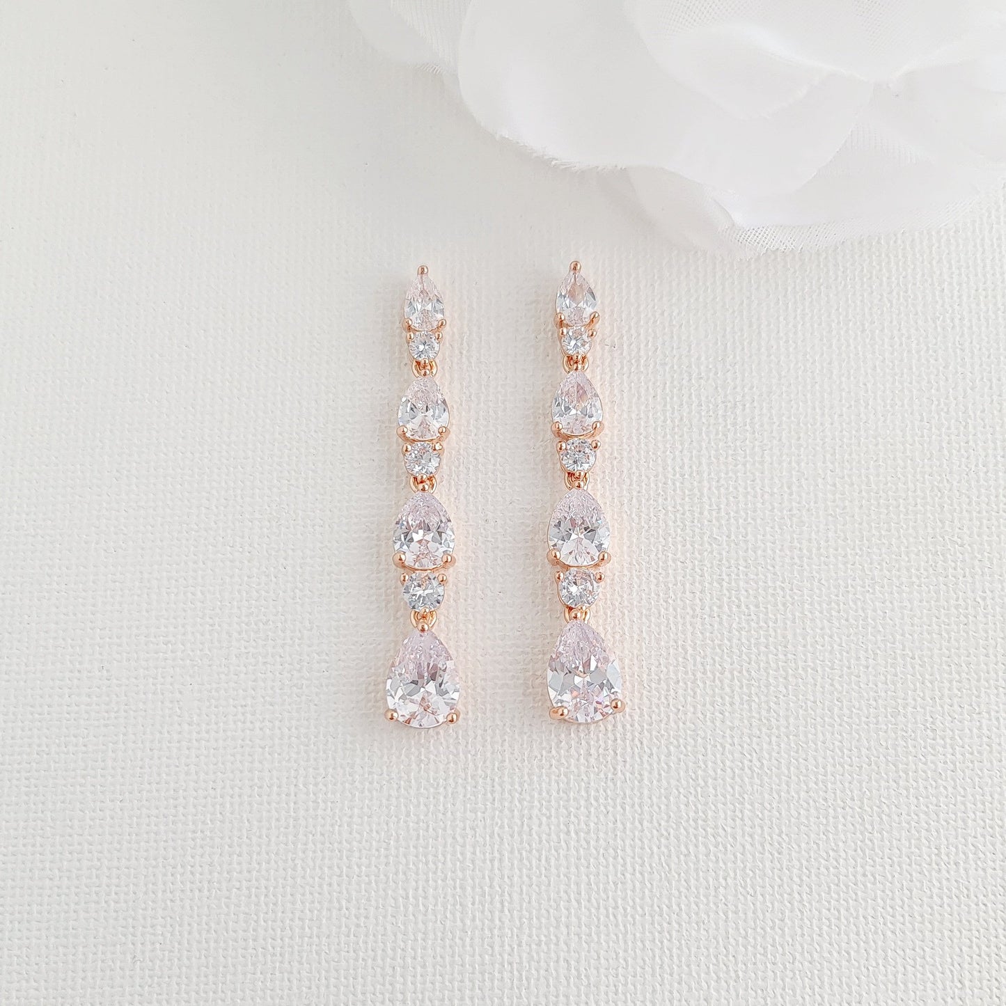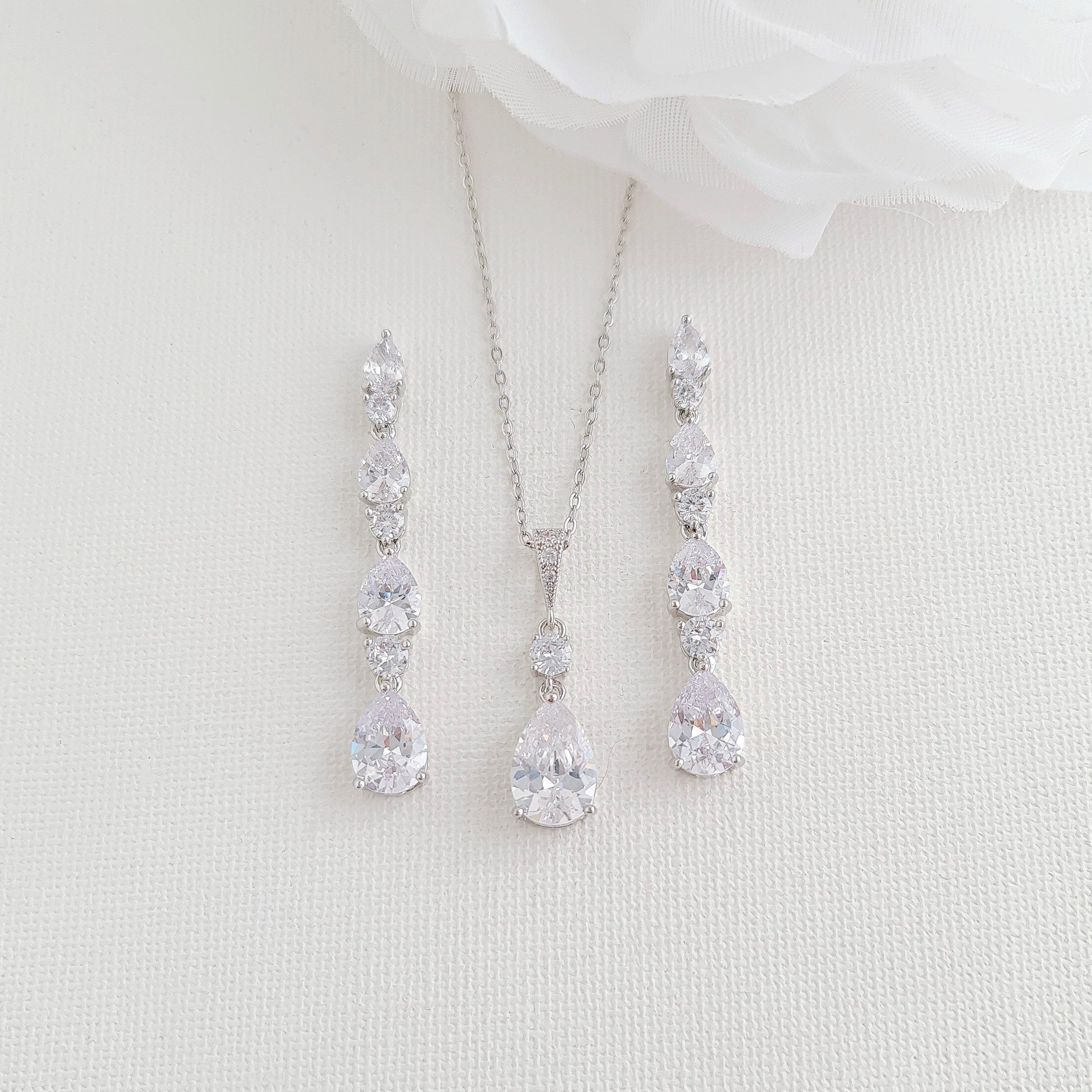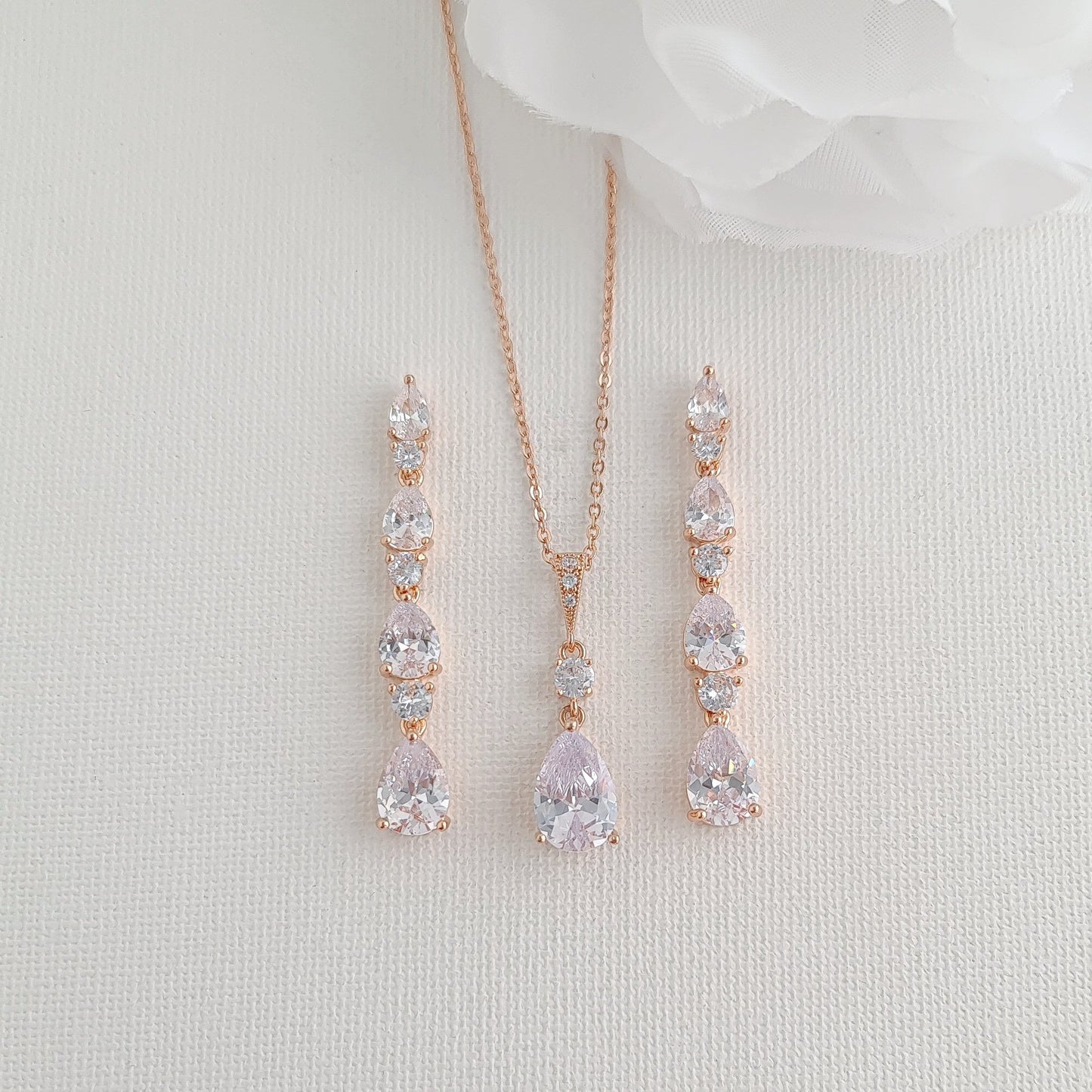 This wedding jewelry set is made with plenty of sparkles and a hint of gold. The earrings and pendant are elegant, long, and slim.