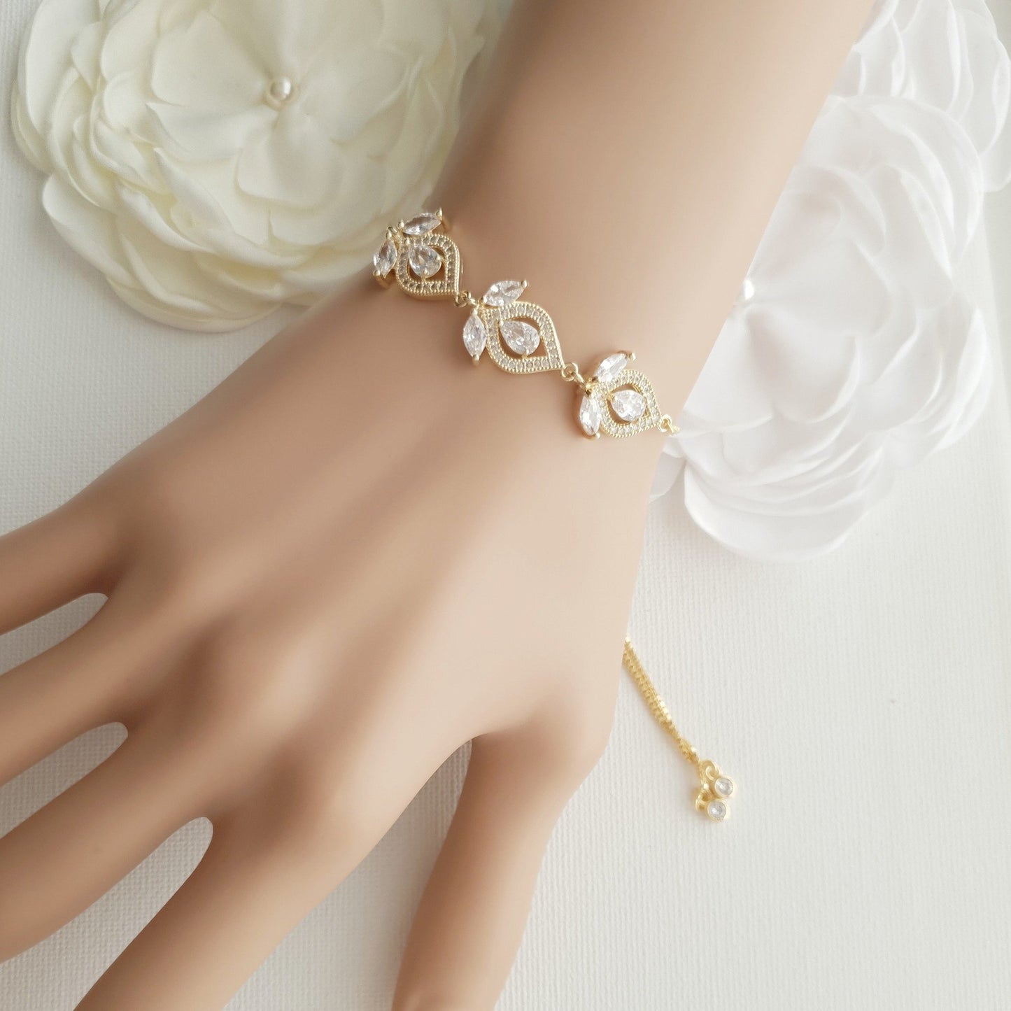 This Meghan gold slider bracelet is an elegant piece for weddings or any special occasion. These beautiful bridal slider bracelets are available with matching Meghan earrings and necklaces to complete your wedding day look.