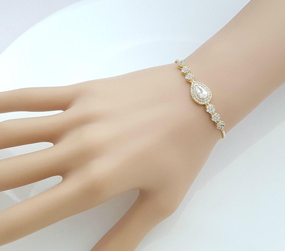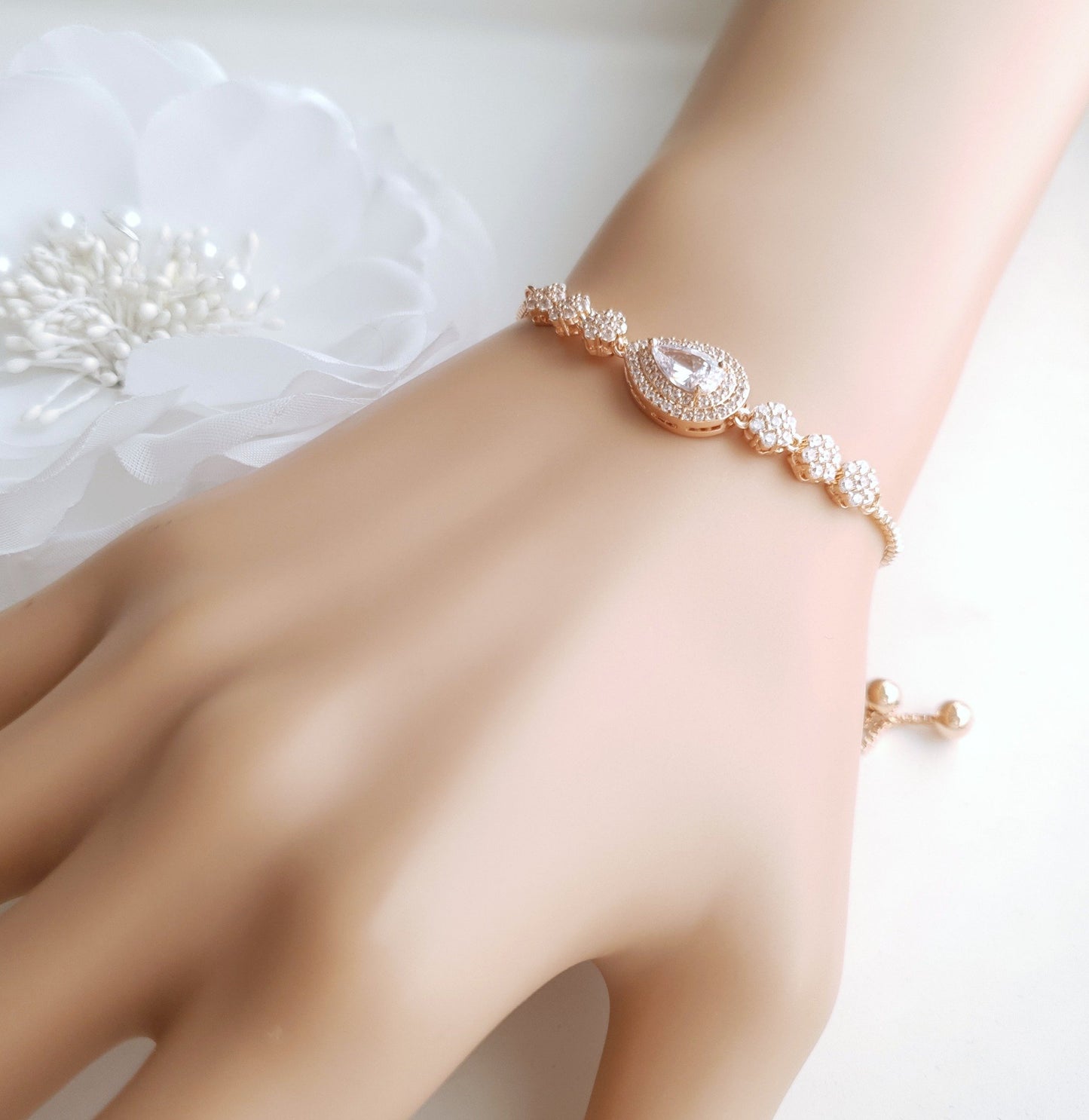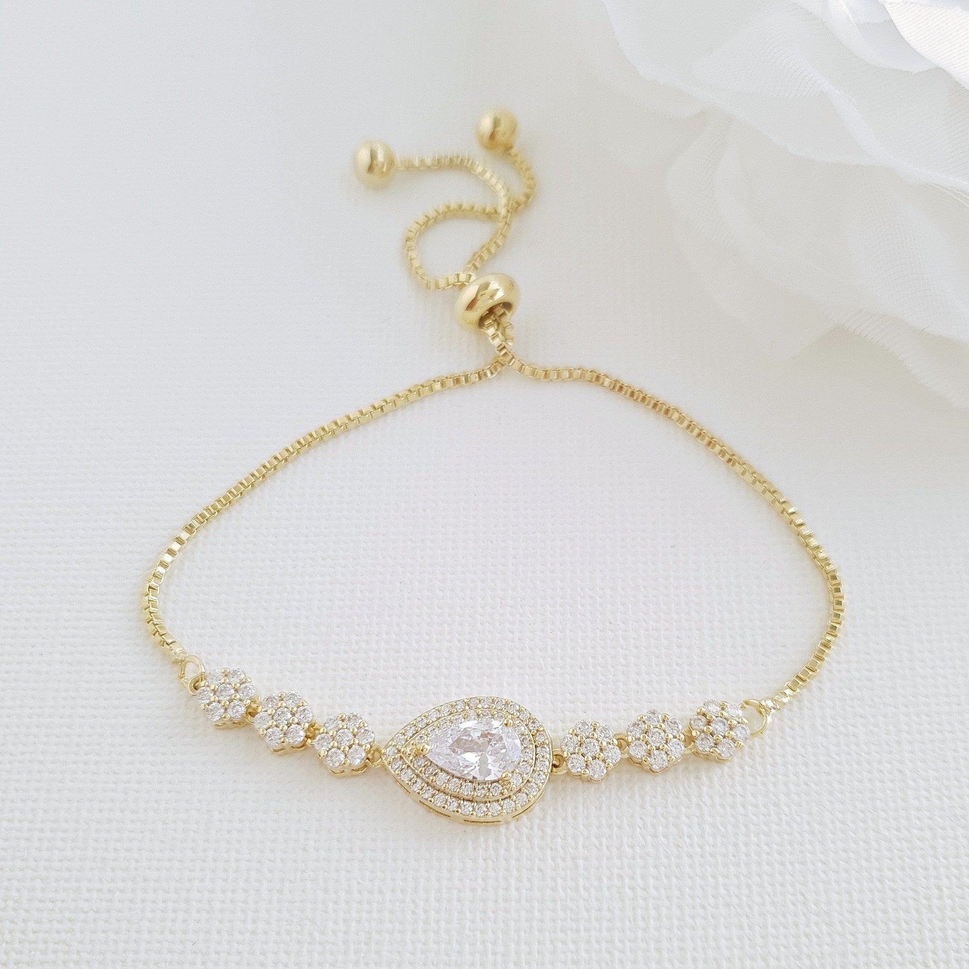This wedding Bracelet is made with teardrop cubic zirconia in the center that is detailed and layered with circle floral CZ beads on the bracelet. The gold bracelet is 14K gold plated for a light gold tone. The cubic zirconia bracelets are also available in rose gold and silver plating. The measurement of the bracelet.