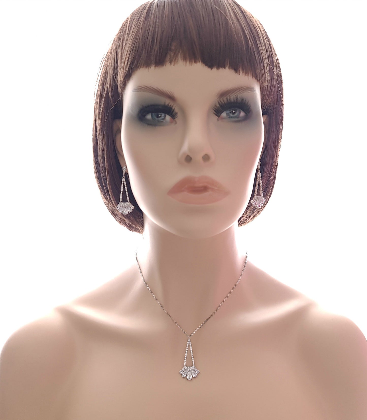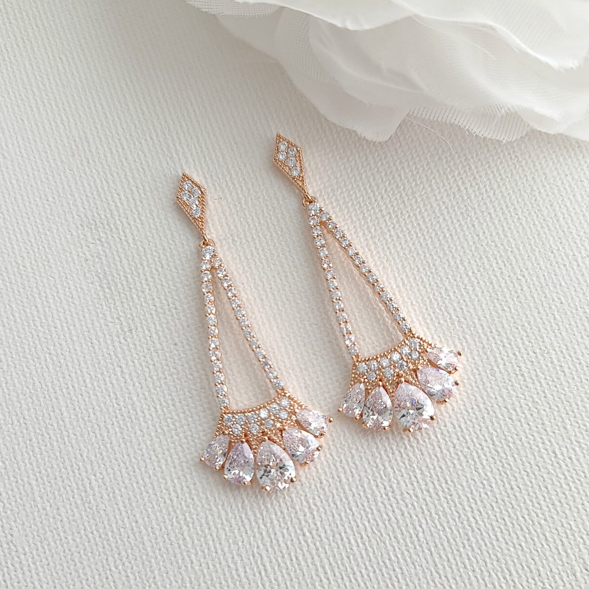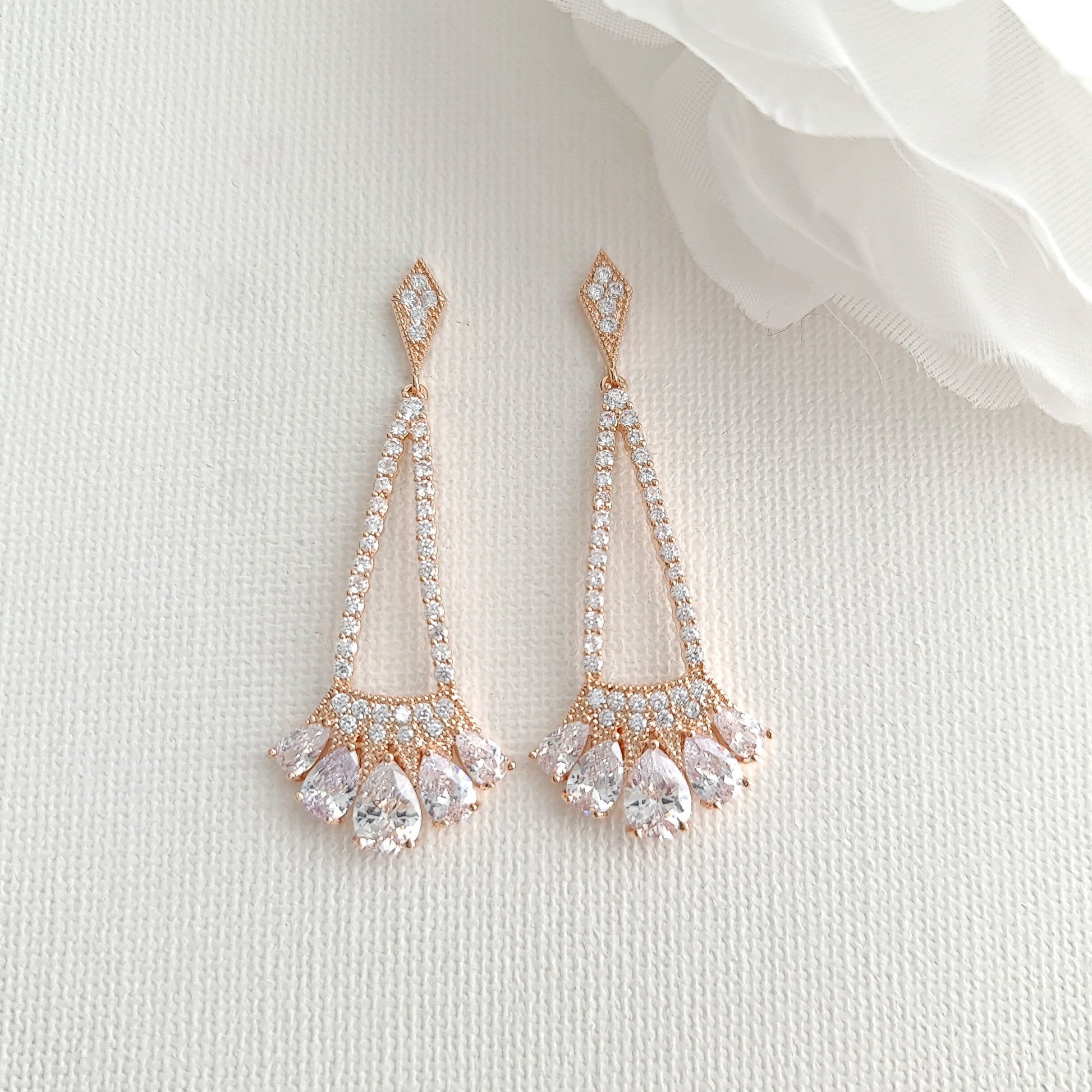 These lovely gold and crystals drop triangle earrings in a hollow design make it comfortable and lightweight weighing 4 grams. The triangle bridal earrings are set in 14K gold plated brass with stainless steel posts. These wedding earrings are off a great length to be visible enough but not too long to be too big. They are available in a silver/rhodium finish, rose gold finish, and 14k gold finish.