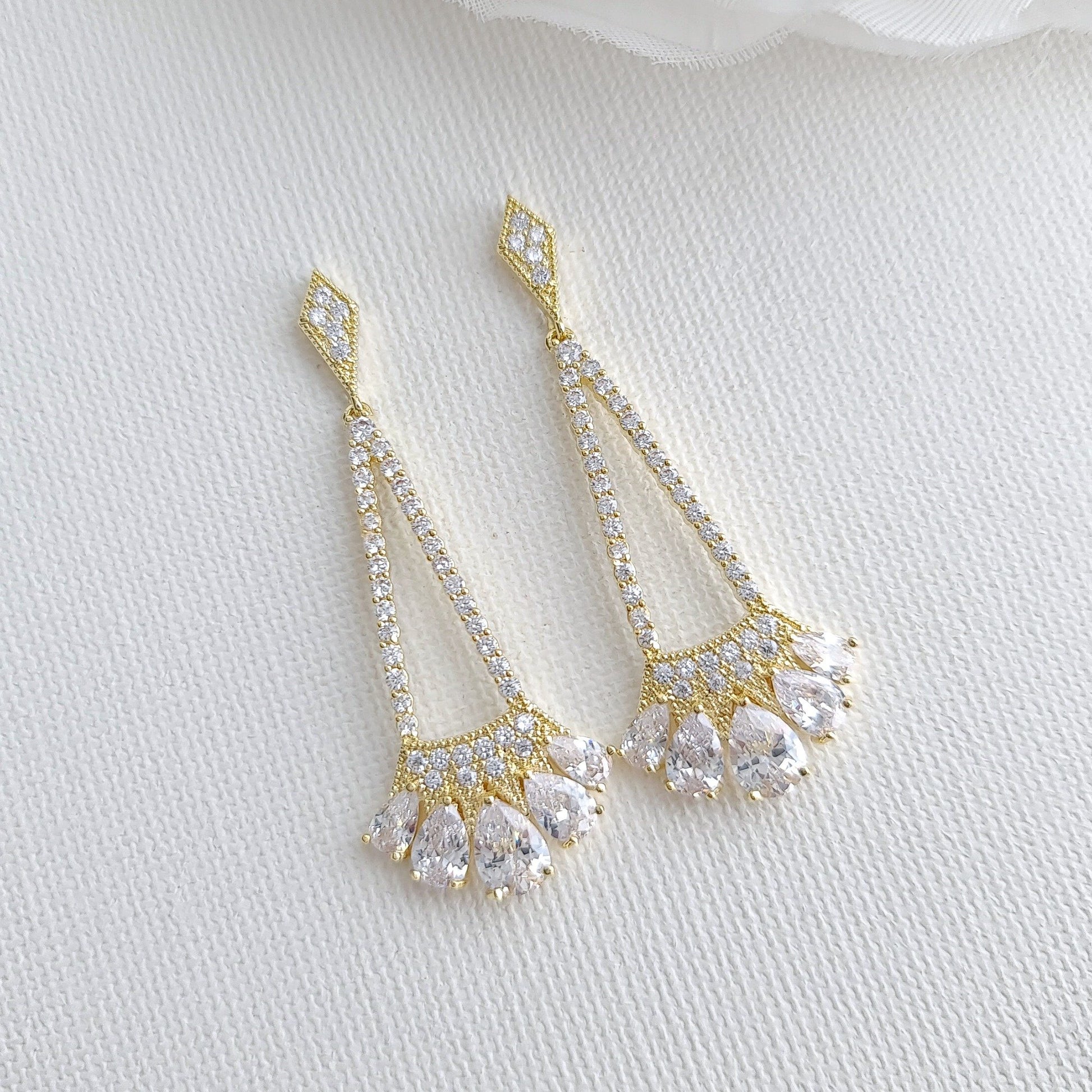 These designer gold triangle drop earrings are in geometric design, which adds a contemporary feel to your bridal, prom, and event look. These Sydney bridal earrings are long, exotic, and glamorous. The sparkly earrings are designed with sparkling triangle drop with small teardrops crystals added to this 14K gold plated triangle dangle earring design.