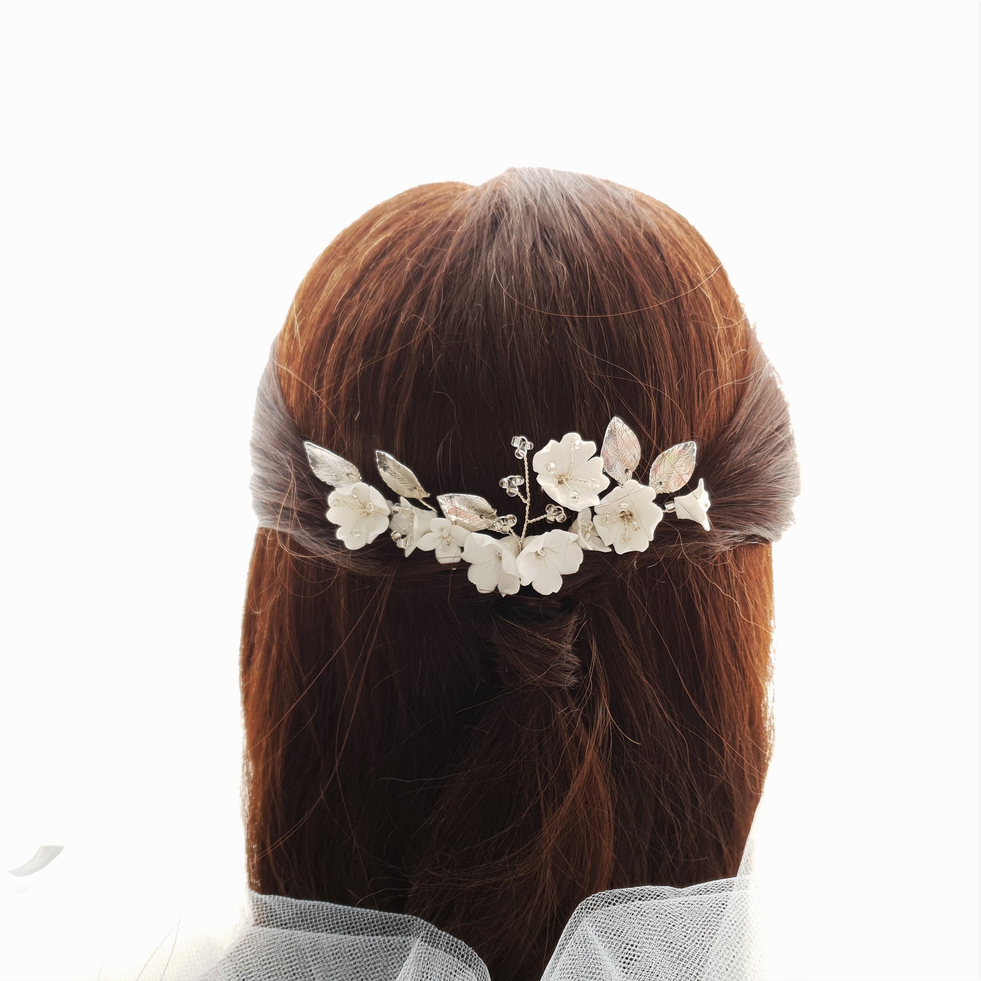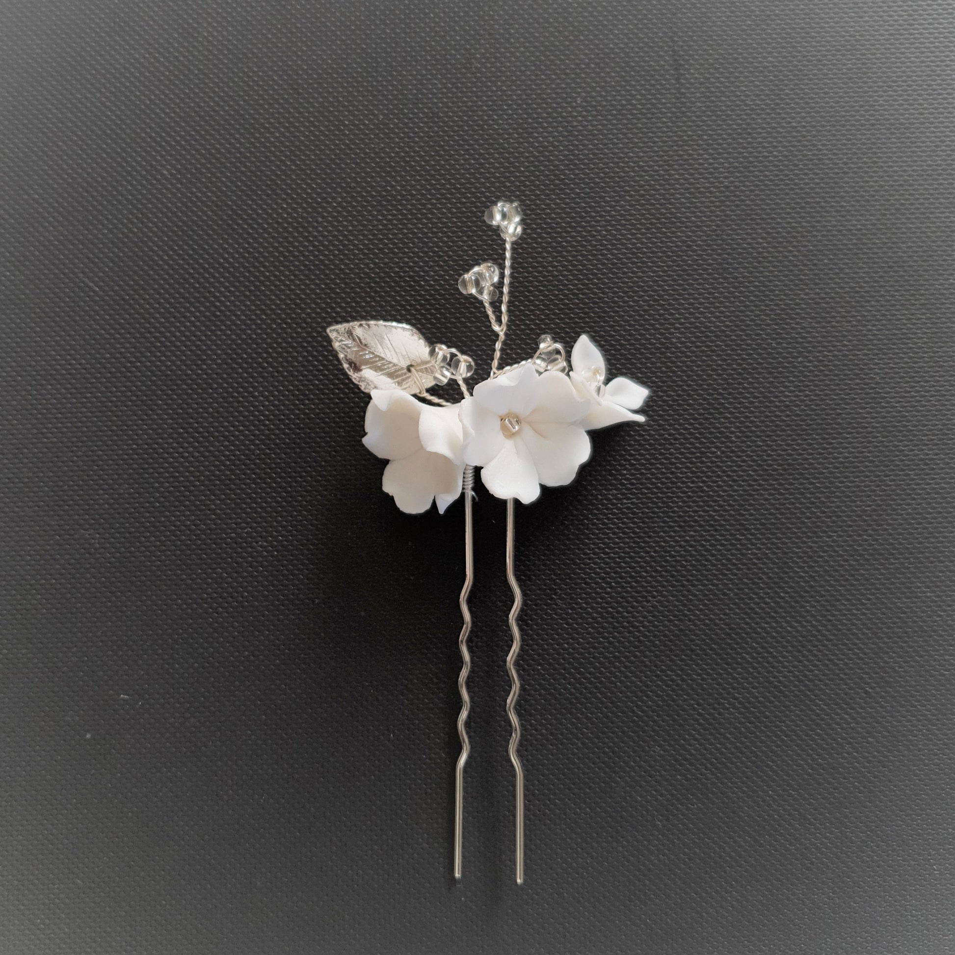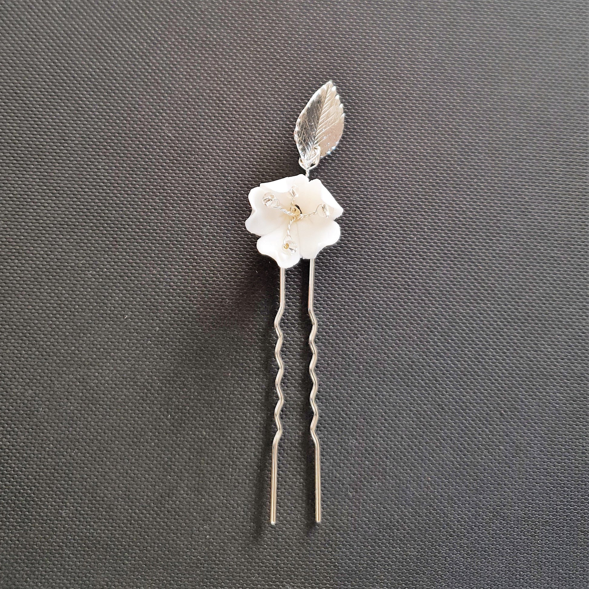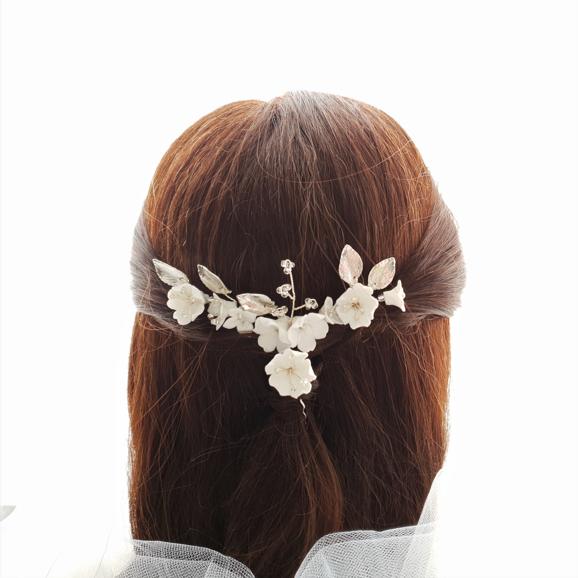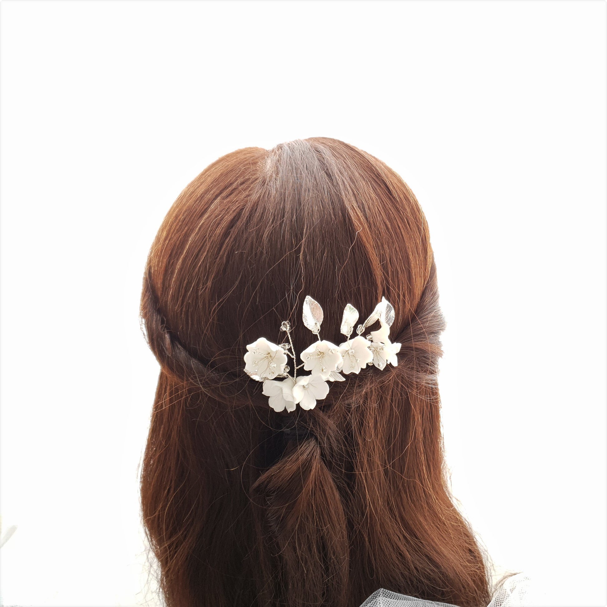 These gold wedding hairpins with white flowers, give you an opportunity to get creative with your wedding day hair accessory for a unique look.