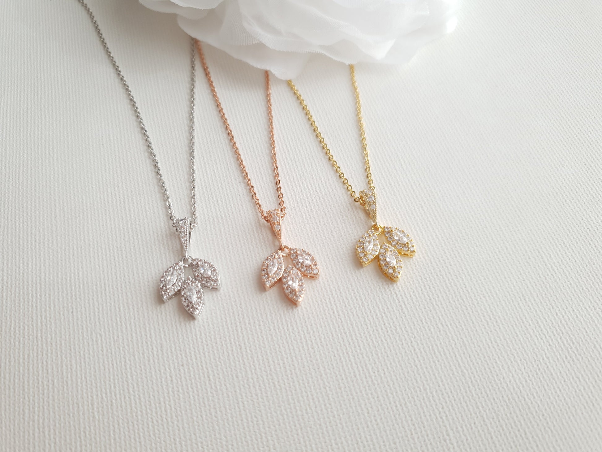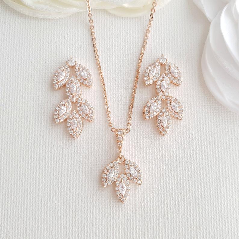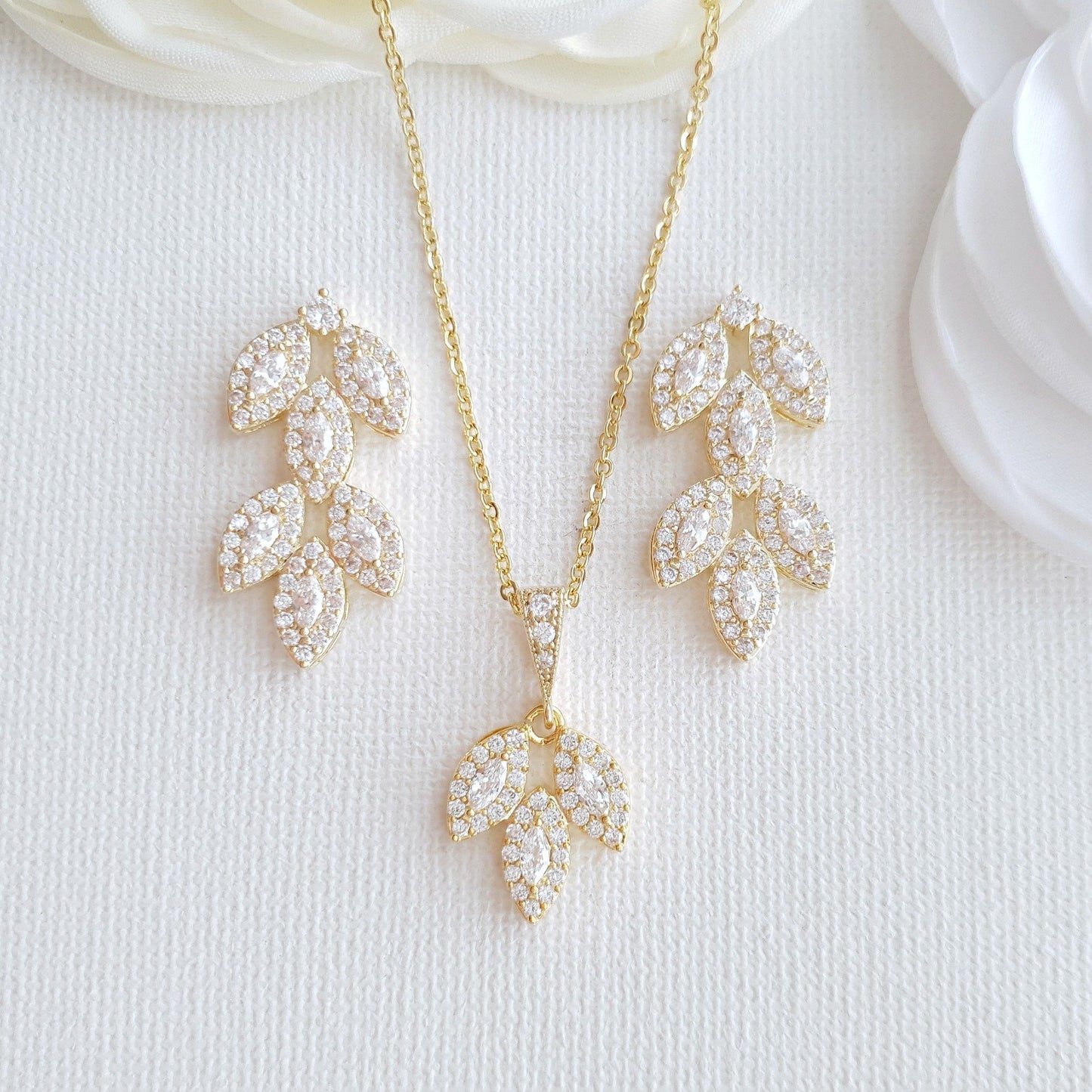 Simple and sparkly gold wedding jewelry sets are made of cubic zirconia for brides and bridesmaids. The gold necklace and stud earrings set is styled in a simple leaf drop style for both earrings and pendants.