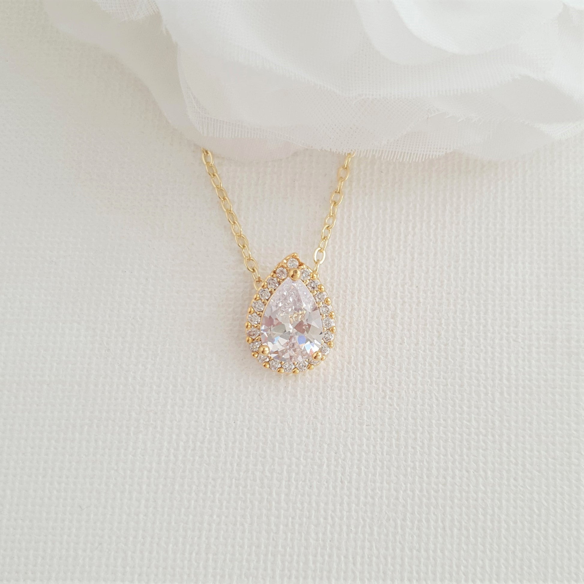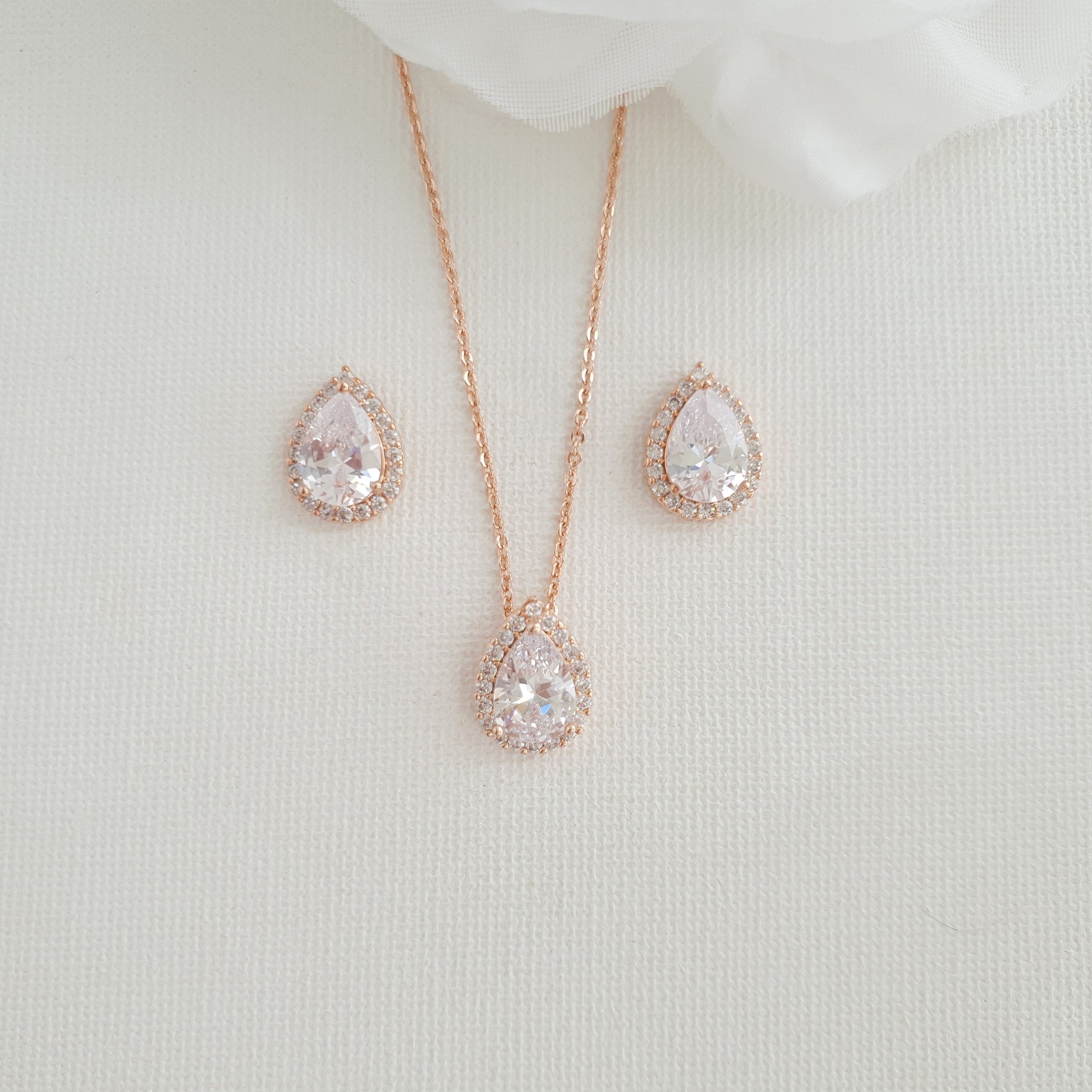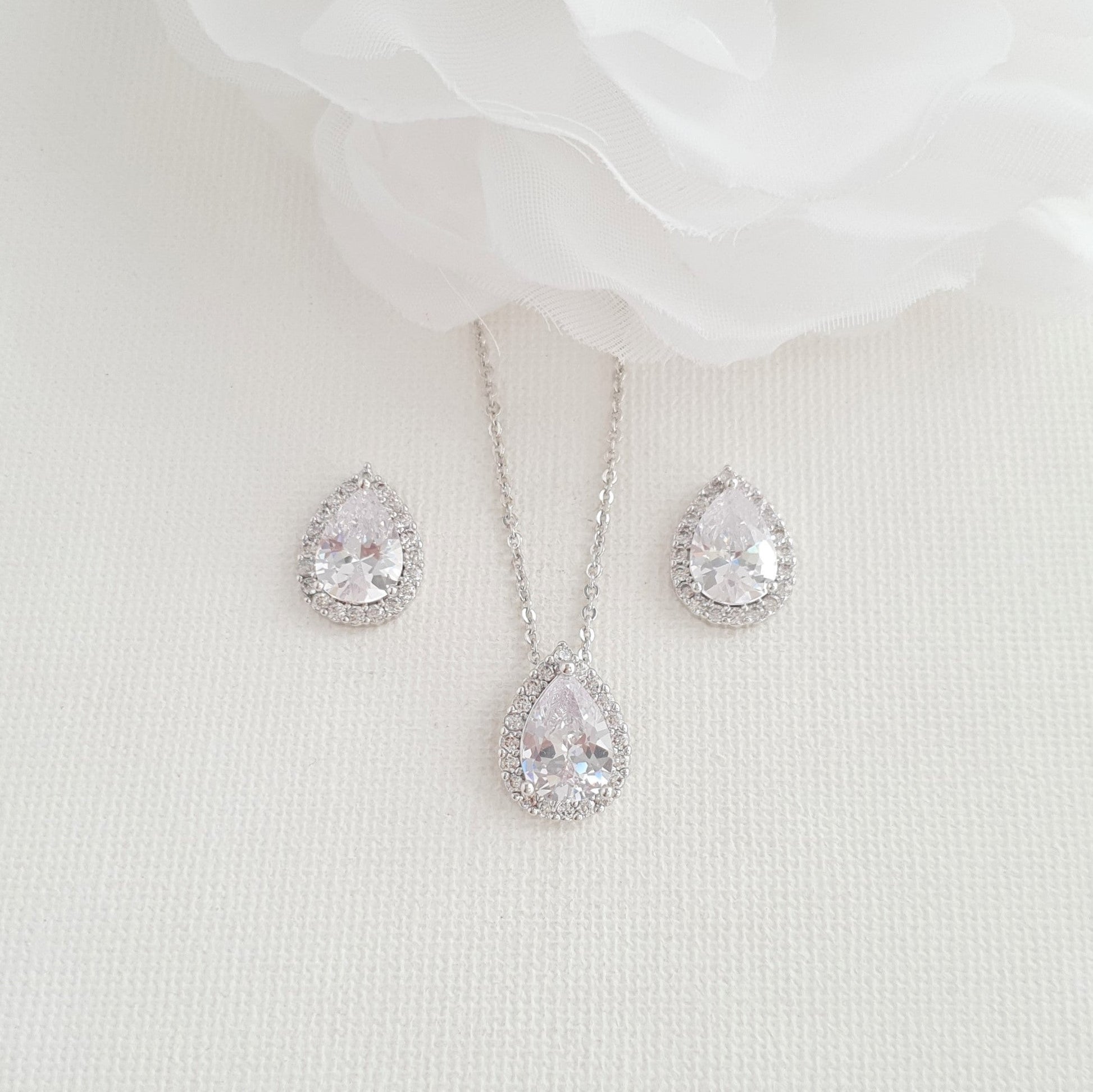 You will love this elegant bridesmaids' jewelry set as it is a perfect addition to any bridal store's collection. The set includes matching teardrop-shaped stud earrings and necklaces made of high-quality cubic zirconia, providing a super sparkly effect.