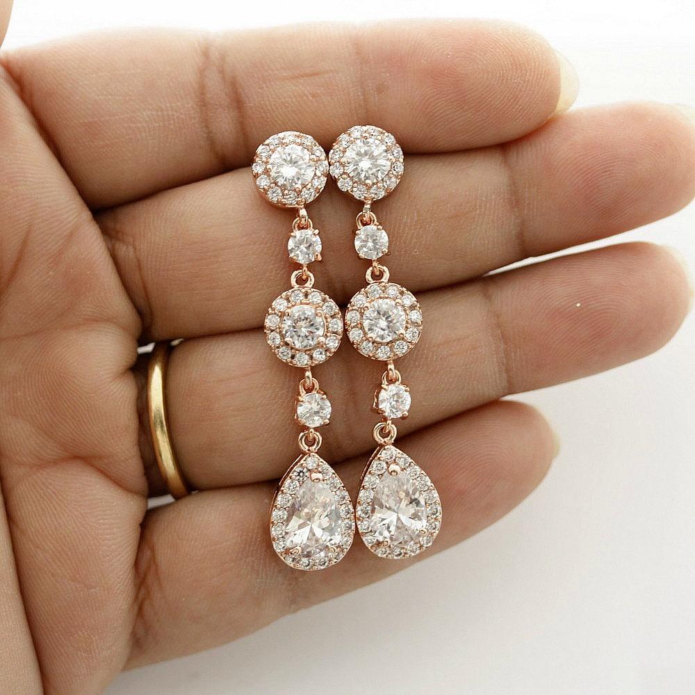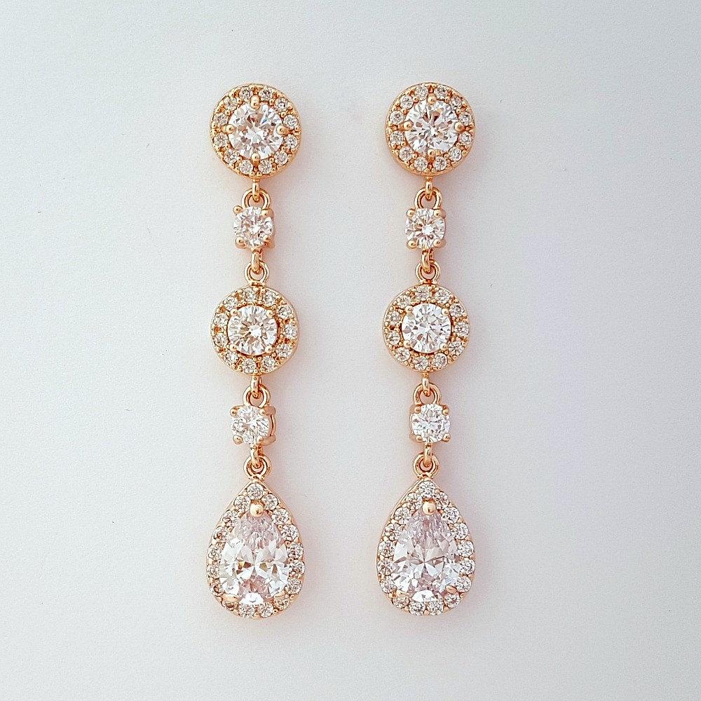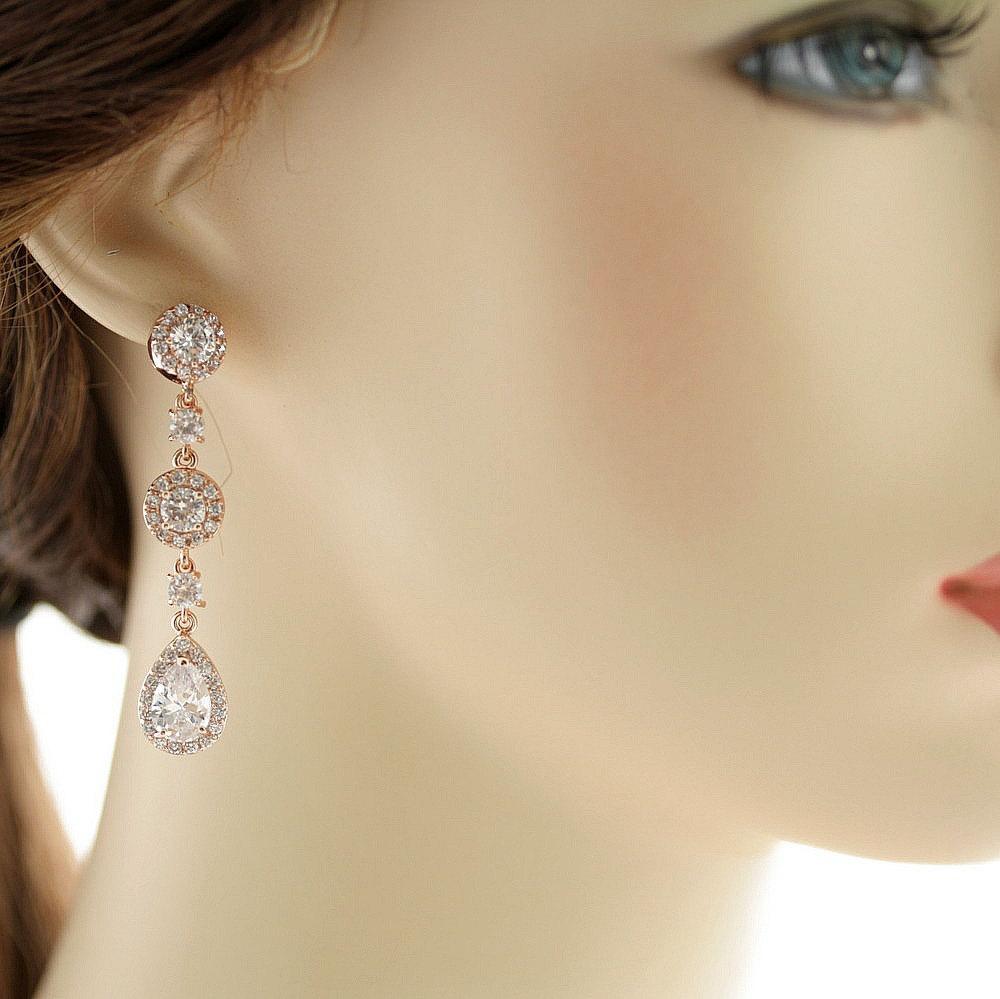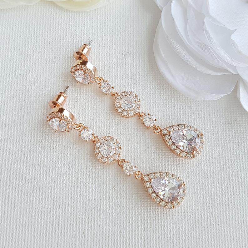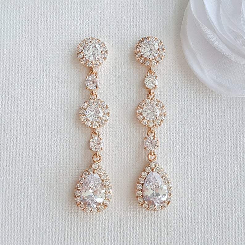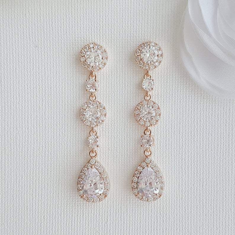 Long Rose Gold Crystal Teardrop Earrings for Brides