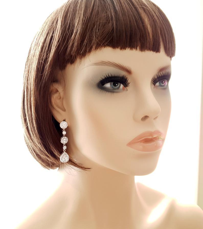 Elegant and long rose gold teardrop earrings are beautiful for brides, weddings or an event. These lovely earrings are made with sparkly cubic zirconia crystals with rose gold plating on brass. These long rose gold drop earrings will easily match with any of your bridal and formal dresses to add a stylish look. The earrings are comfortable to wear and measure approx. 2 inches or 5.1 cms in length. This lovely pair of earrings is assured to add to your perfect bridal or formal look.