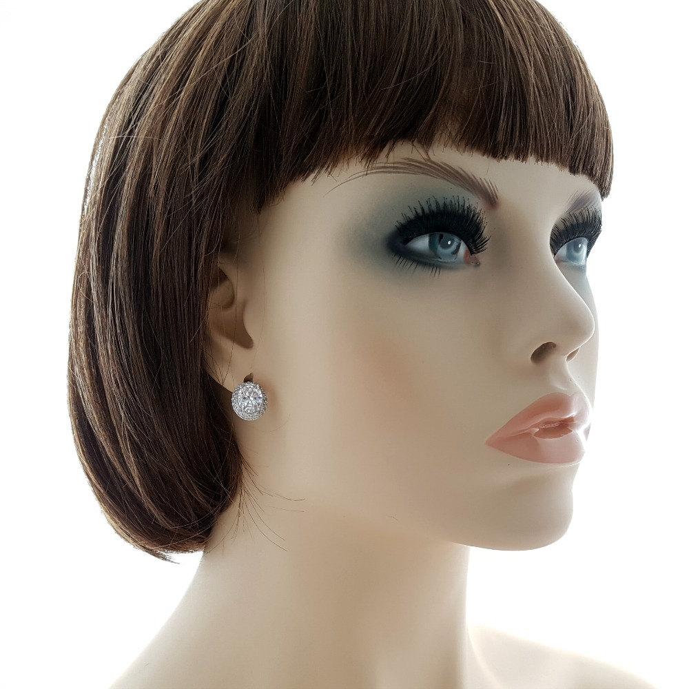 Gorgeous glittering wedding oval stud earrings with a central oval cubic zirconia crystal set in a halo setting surrounded with 2 layers of pave set cz crystals.
