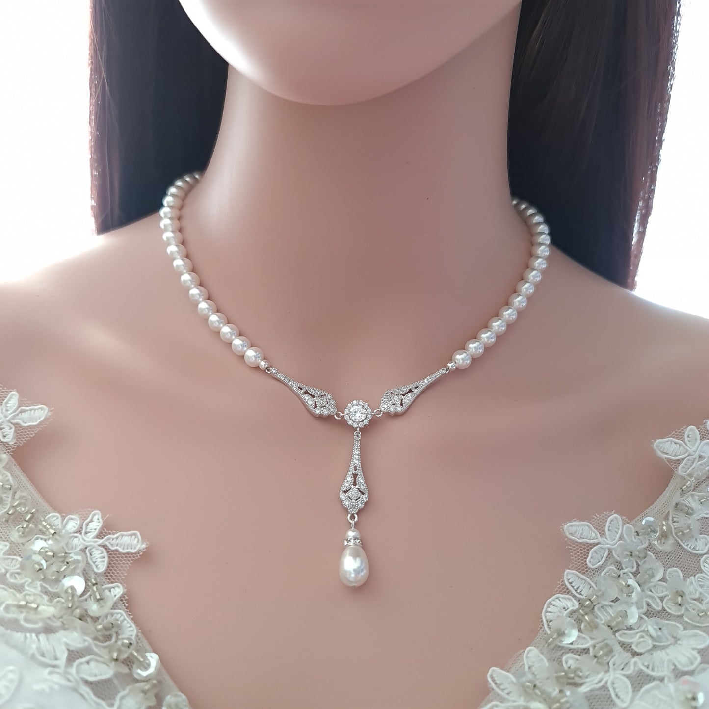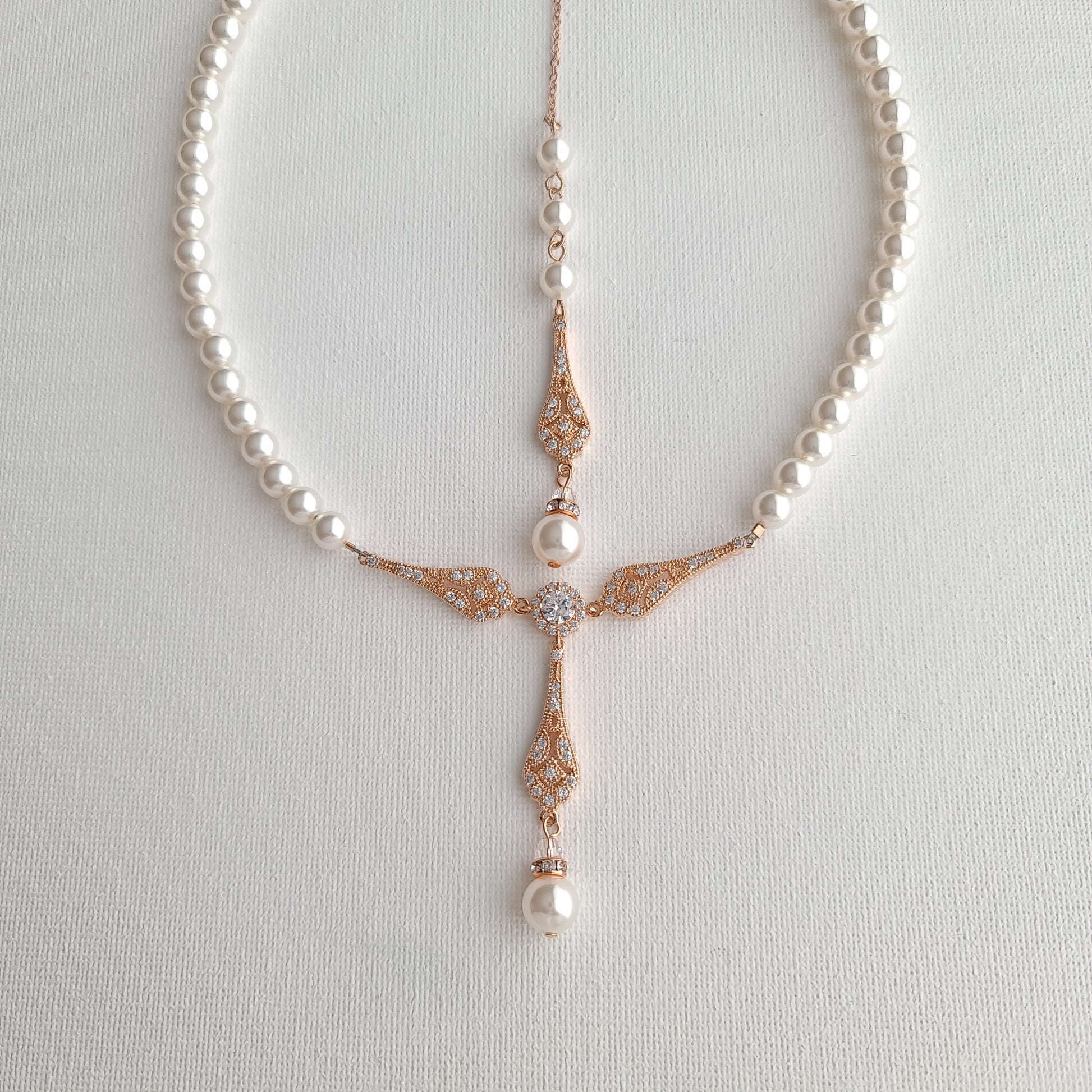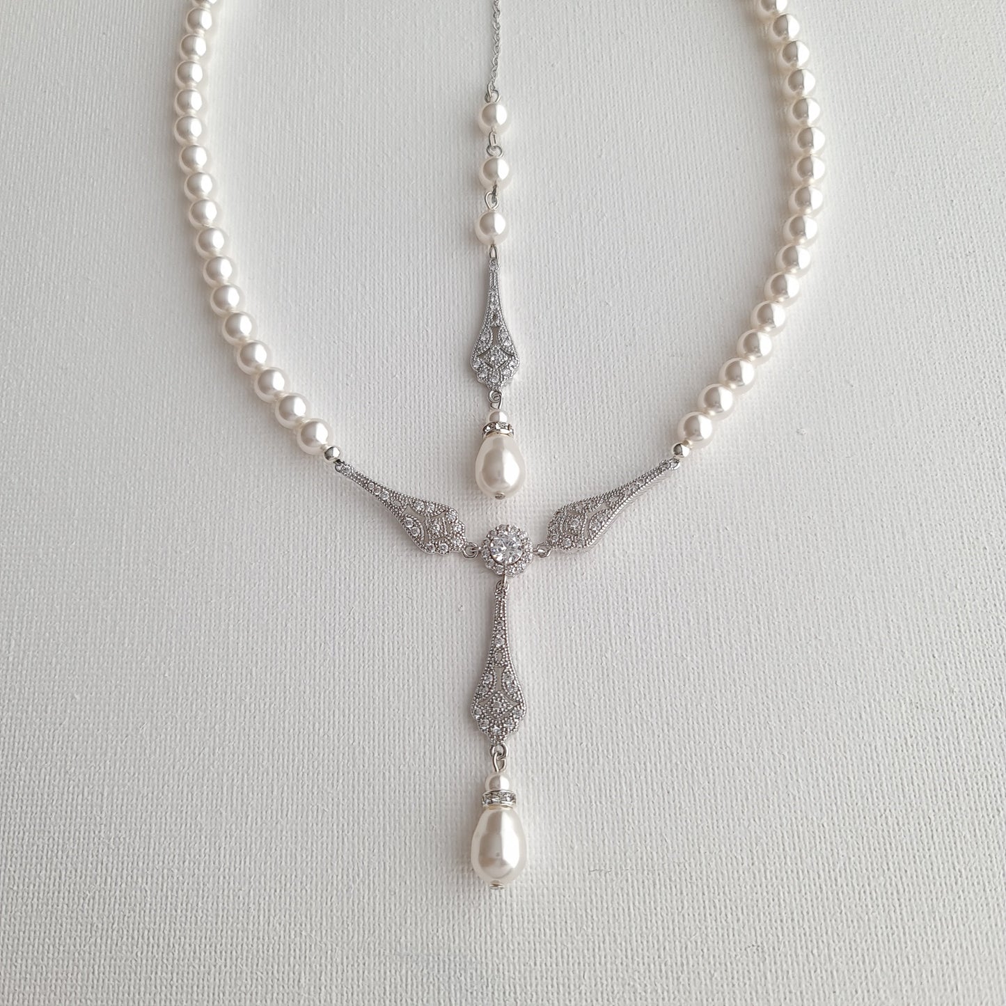 Add this pearl backdrop necklace on your wedding day with a long pendant drop, This wedding backdrop necklace will look stunning, especially if your wedding dress is a backless, or off-shoulder dress, or a modern bridal dress with a low back. This backdrop pearl necklace is designed mixing vintage style long pendant drop and pearls to give you a traditional feel with your modern wedding dress designs.