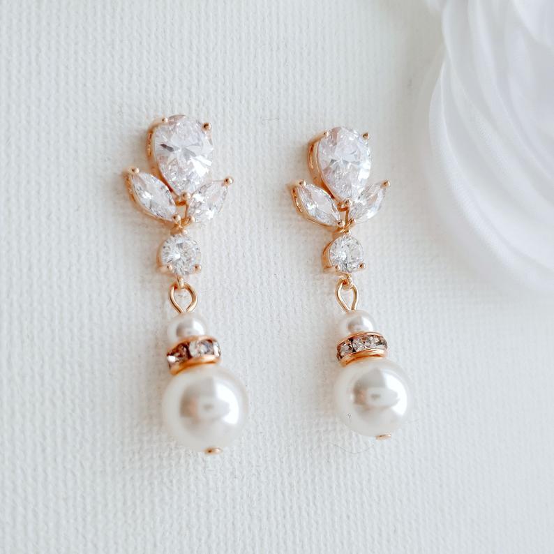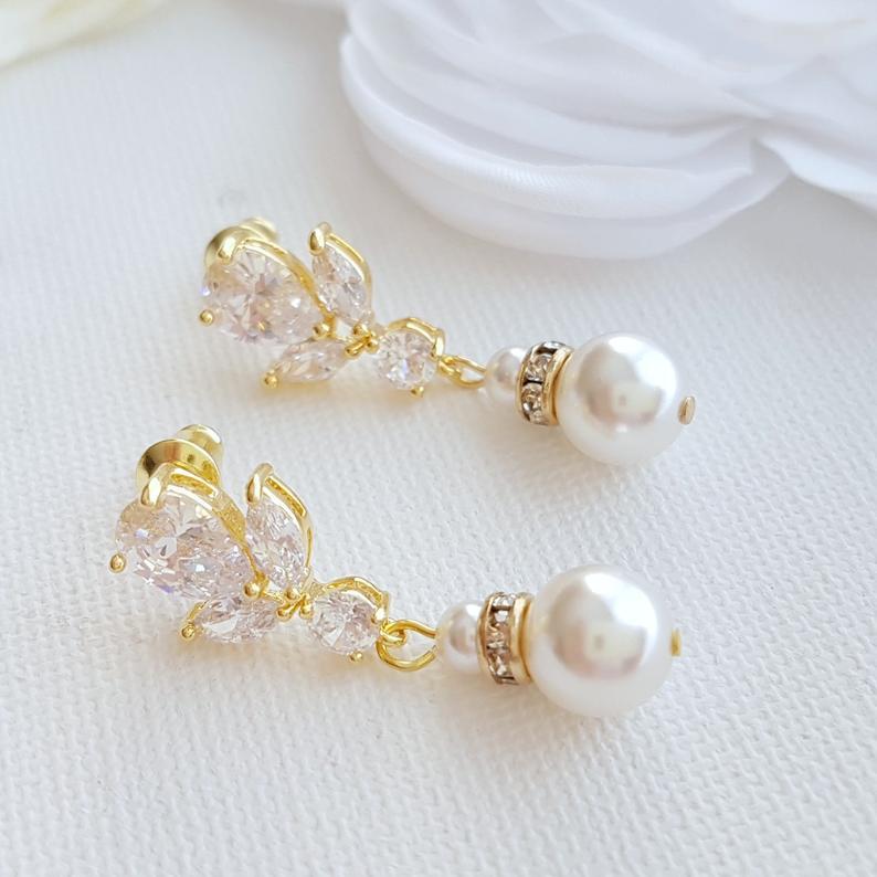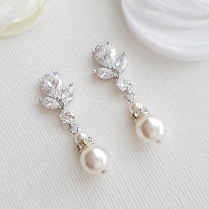 If you need dainty pair of earrings for brides and bridesmaids, these beautiful pearl bridal earrings are perfect. Made with round pearl drop and sparkly cubic zirconia crystal ear top.
