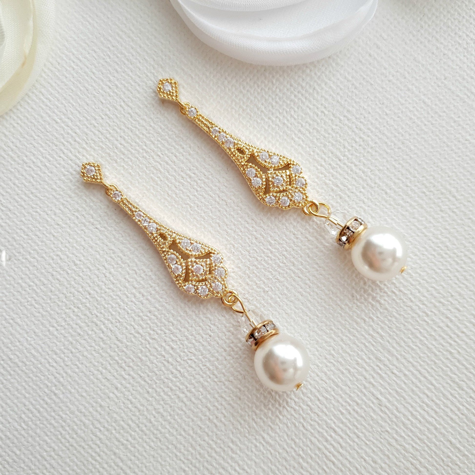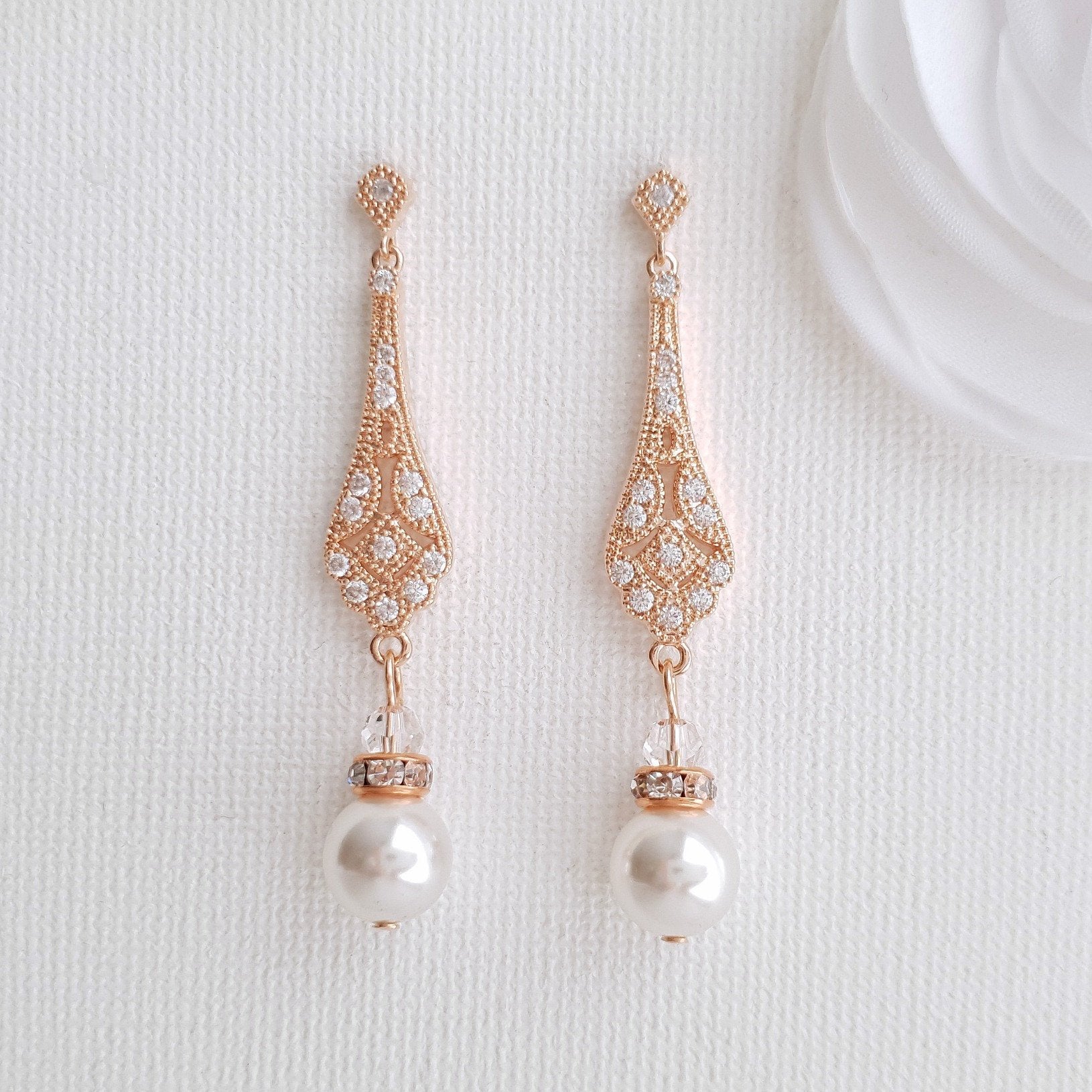 Created in a vintage style the pearl drop bridal earrings are elegant, long earrings embellished with cubic zirconias and are lightweight on the ears. I have put teardrop round pearls onto it. The earrings are tarnish-resistant. The material used is brass metal plated silver/rhodium, rose gold plated and 14k gold plated.