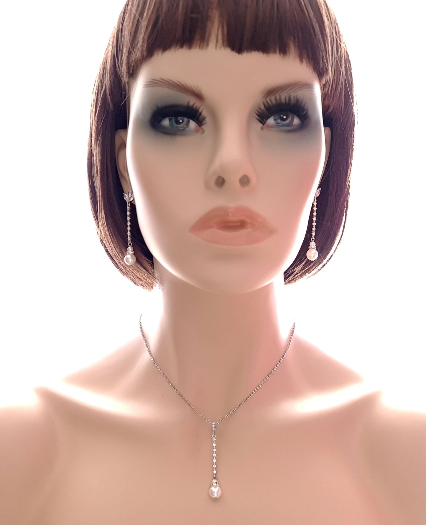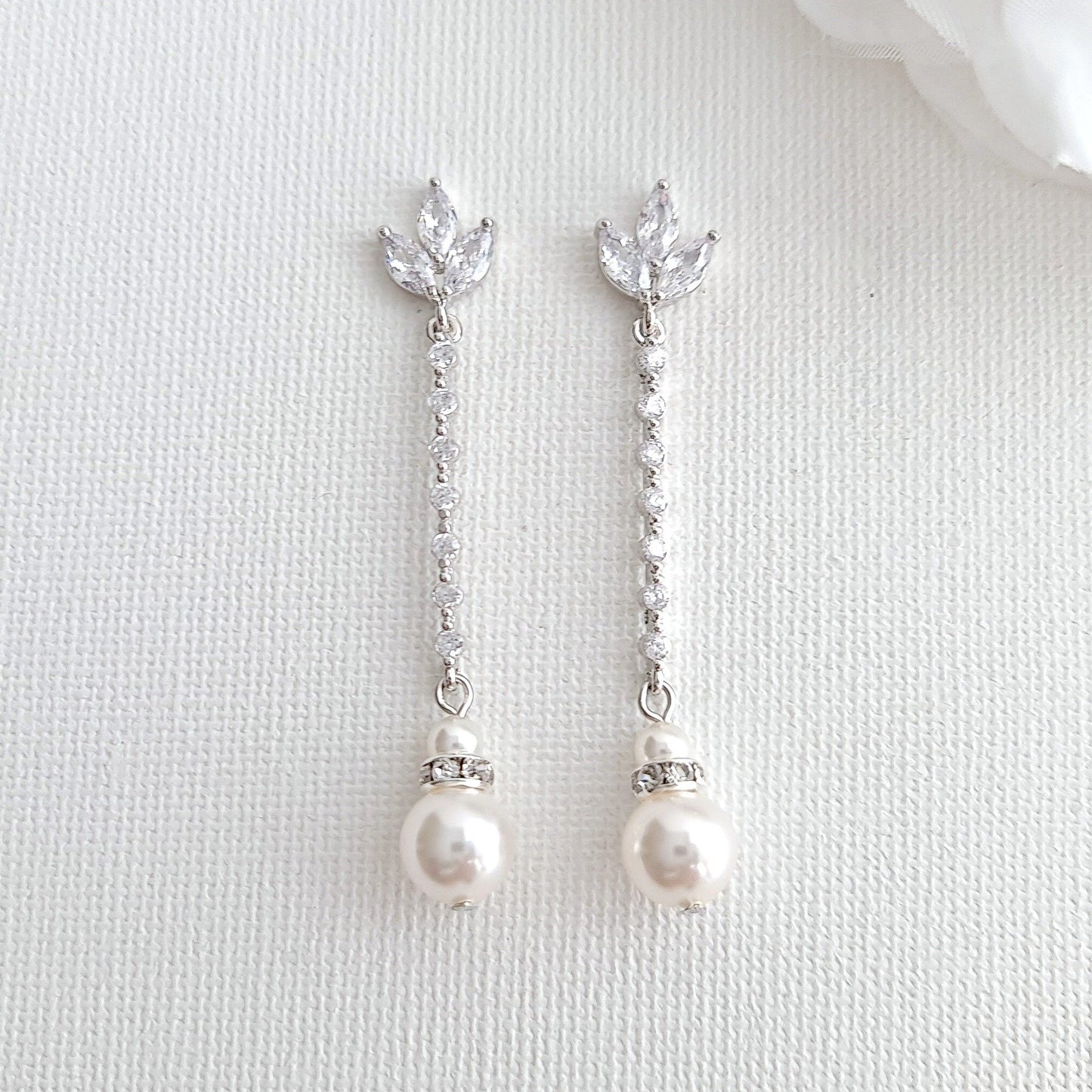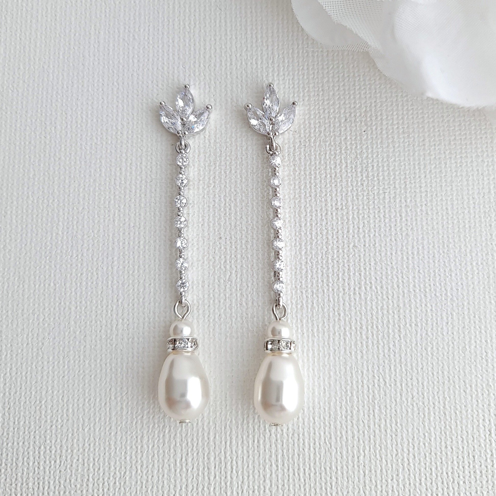 These beautiful bridal and wedding earrings are long and slim and made with a flower ear top with a slim array of sparkly studded cubic zirconia and with pearls either in teardrop or round shapes. The earrings are comfortable to wear and lightweight in design.