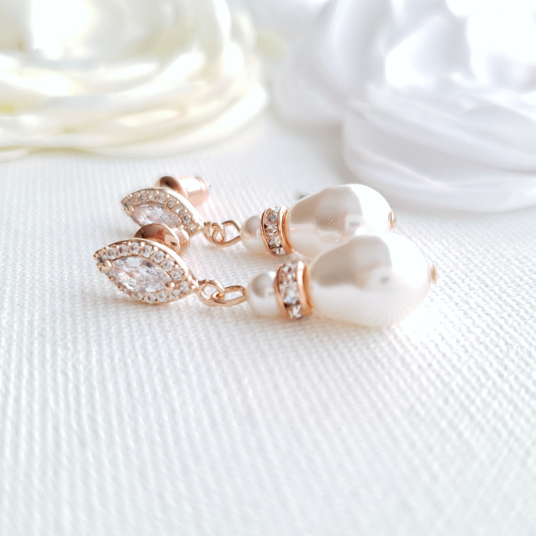 This pearl bridal jewelry set is made of long pear-shaped pearls that are available in cream and white pearl colors. The pearl colors can be easily matched with bridal dresses or family heirloom pearl jewelry of cream or white. The pearl jewelry set is available in three tones of silver, gold, and rose gold plating to choose from