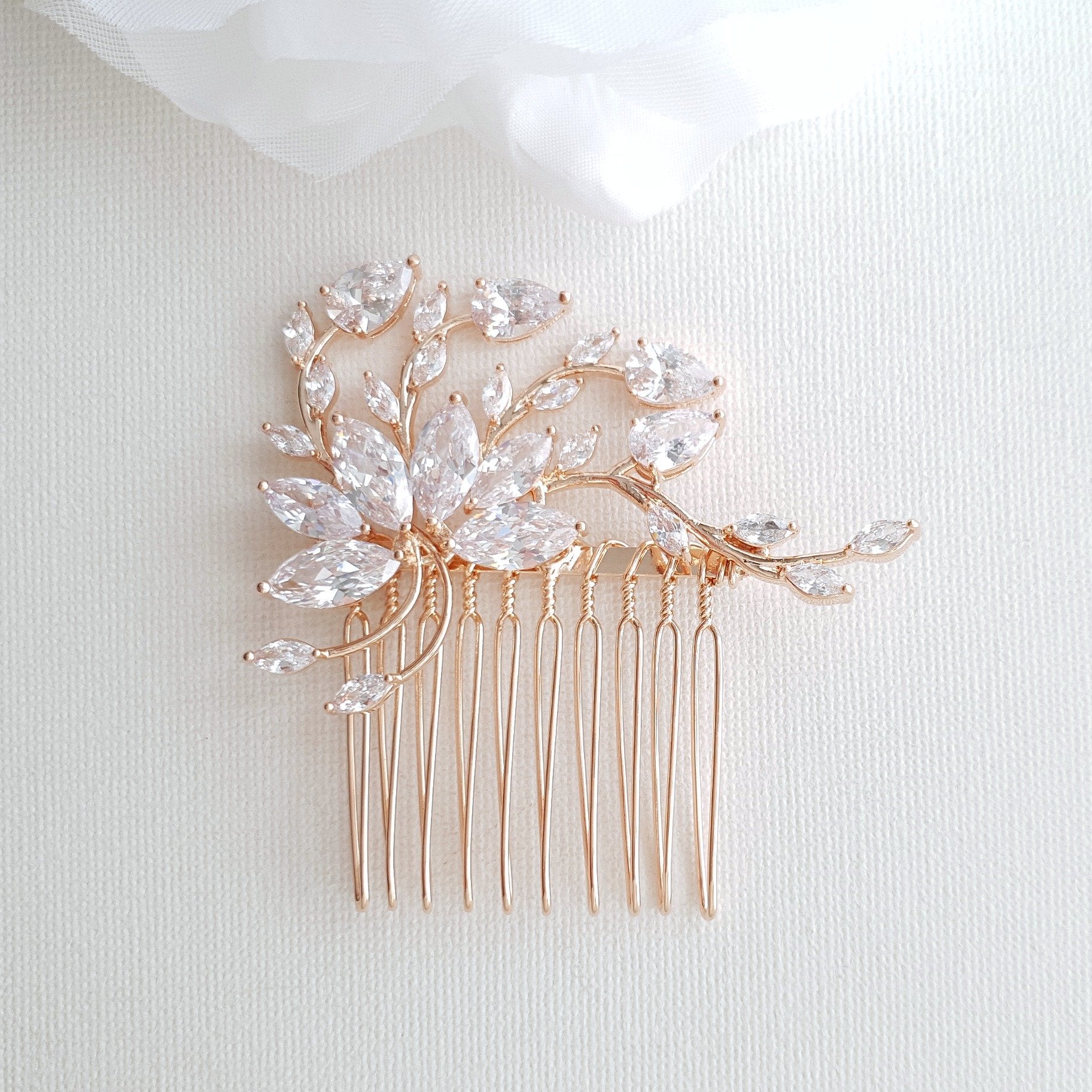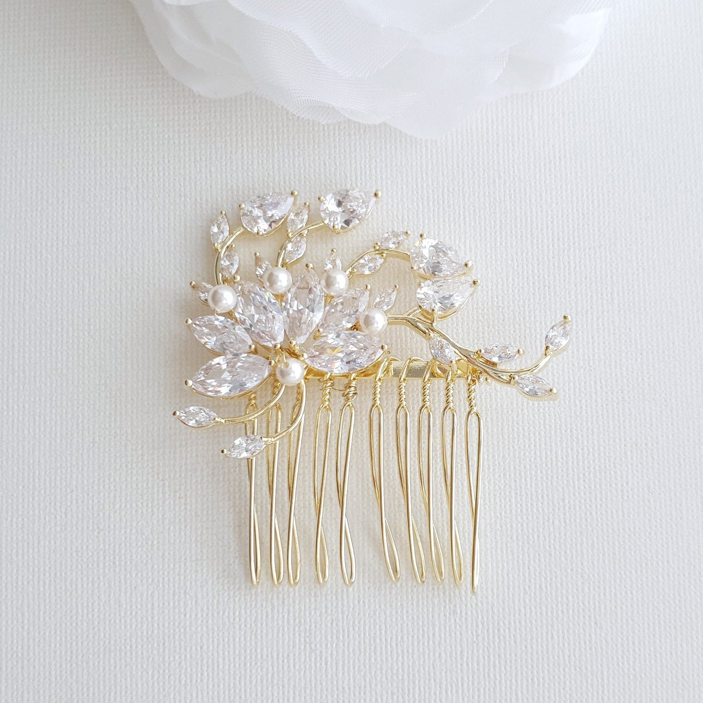 These petite flower bridal hairpiece in gold is beautifully made with marquise crystal flower with a swirly leaf vine design.